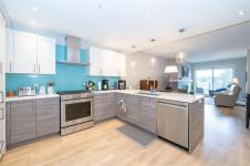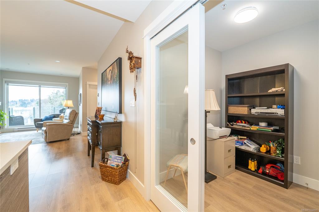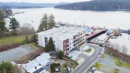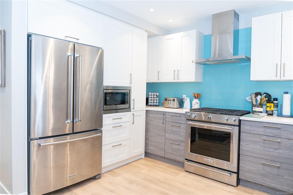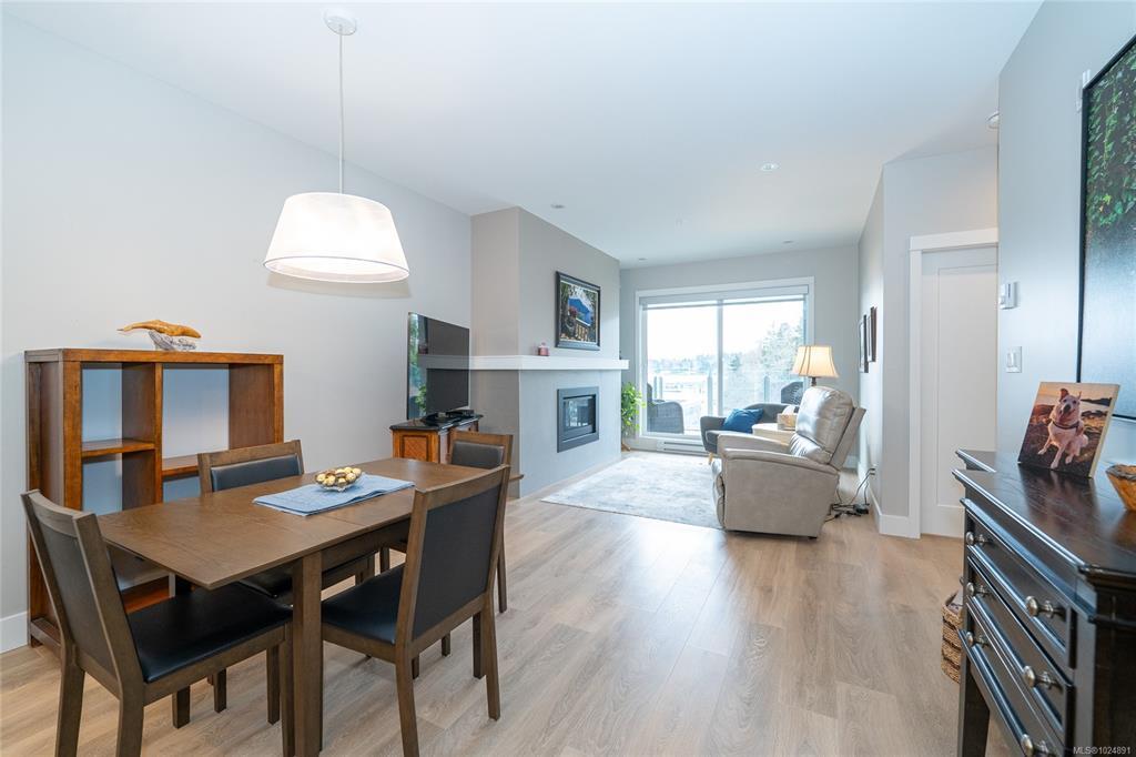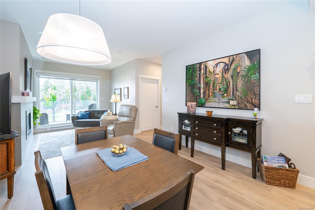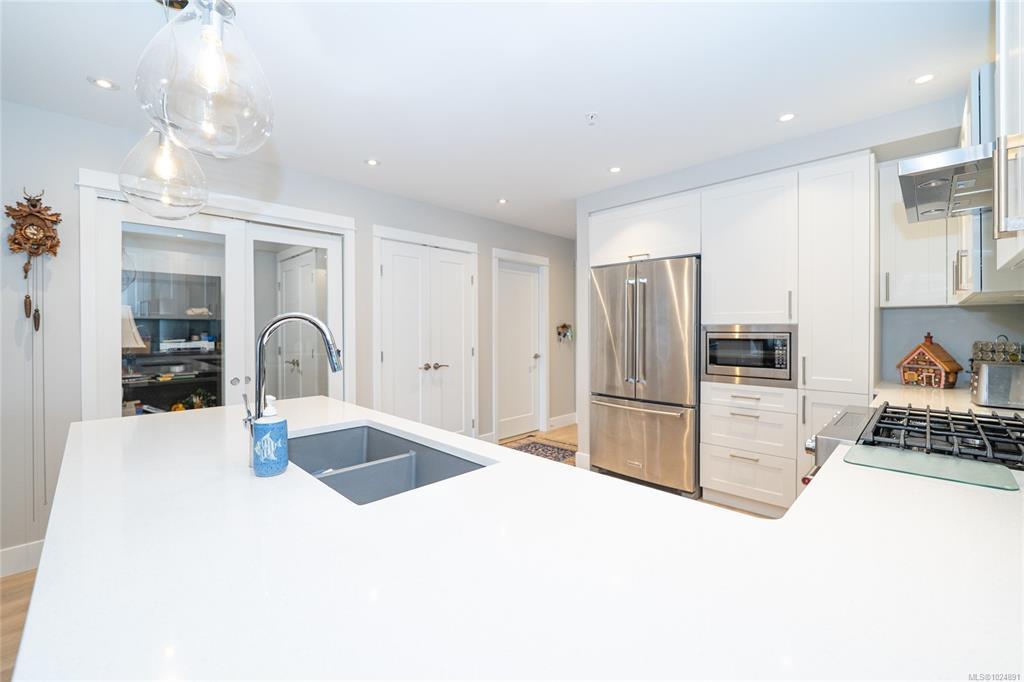 Enjoy refined oceanfront living in this oversized 1-bed, 1.5-bath residence offering just under 900 sq. ft. of thoughtfully designed space. The open-concept layout features a stylish kitchen with stainless KitchenAid appliances, gas range, quartz countertops, and seamless flow to the dining and living areas. Step outside to an expansive 263 sq. ft. patio with gas BBQ hookup—ideal for entertaining while taking in ocean and mountain views. Quality finishes include oak hardwood flooring, 9-ft ceilings, and oversized windows that flood the home with natural light. The king-size primary bedroom connects to a spa-inspired ensuite with dual vanities, soaker tub, glass shower, heated floors, and private water closet. A separate powder room, secured underground parking, and storage locker complete the home. Located in the exclusive Residences on Sooke Harbour, a boutique collection of just 27 oceanfront homes offering a private fitness studio, kayak storage with ocean access, and secured entry.