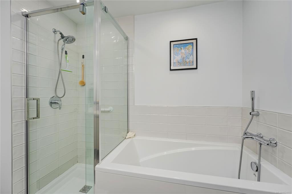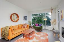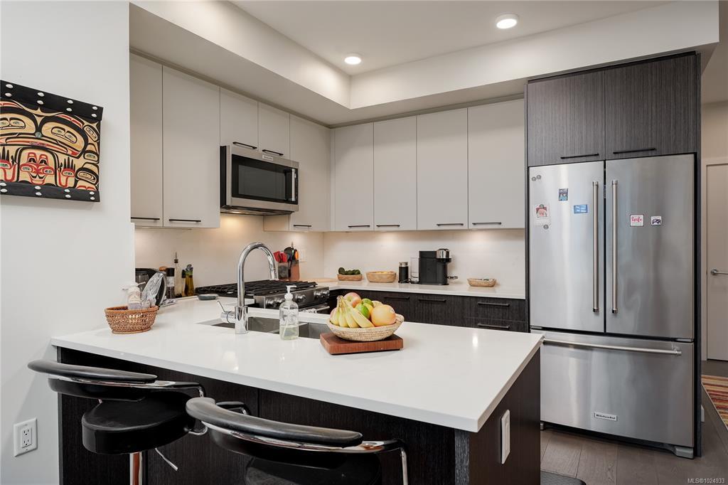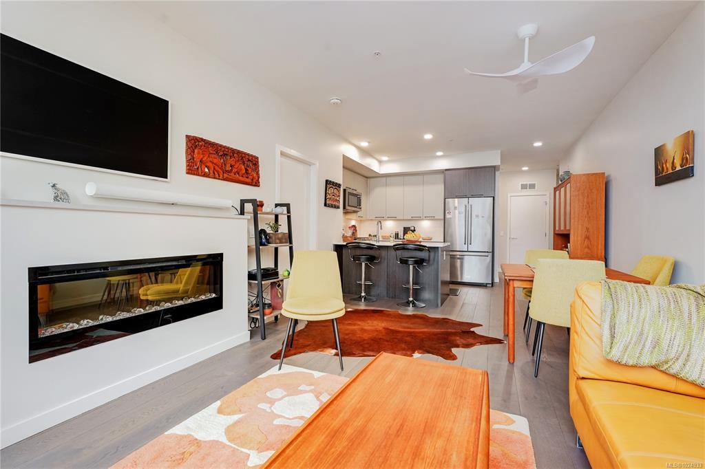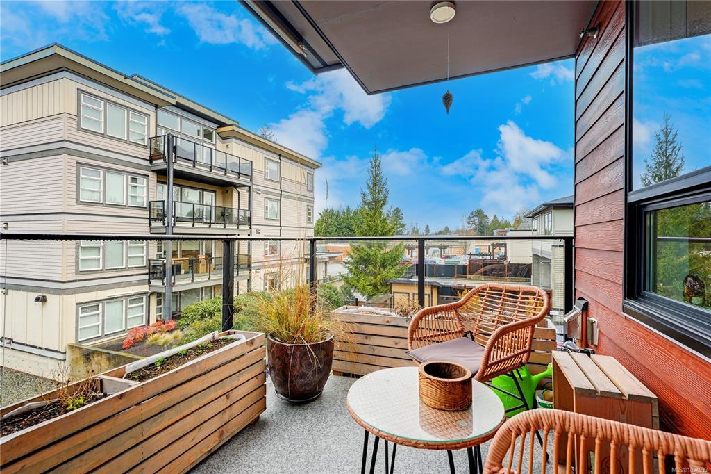 Bright, modern, on a sunny corner facing the quiet back side of the building, this spacious condo offers a layout that’s both functional and inviting. Enjoy open-concept living with 9’ ceilings, a quartz kitchen with gas range, a cozy electric fireplace, and a larger-than-usual corner balcony perfect for catching sunrises, sunsets - and the fireworks from Butchart Gardens. The 2 bedrooms are placed on opposite sides for privacy, including a tranquil primary retreat with a 5-piece ensuite featuring heated floors, double sinks, a soaker tub, and separate shower. The 2nd bedroom sits beside a full bath and in-suite laundry. Located in a vibrant, walkable neighbourhood steps from parks, grocery stores, coffee shops, pubs, the library, and rec centres. Pet- and rental-friendly with bike storage and a storage locker included. The sellers are relocating to be closer to family - it’s your opportunity to make this beautifully designed space your own. Reach out to arrange your private viewing.