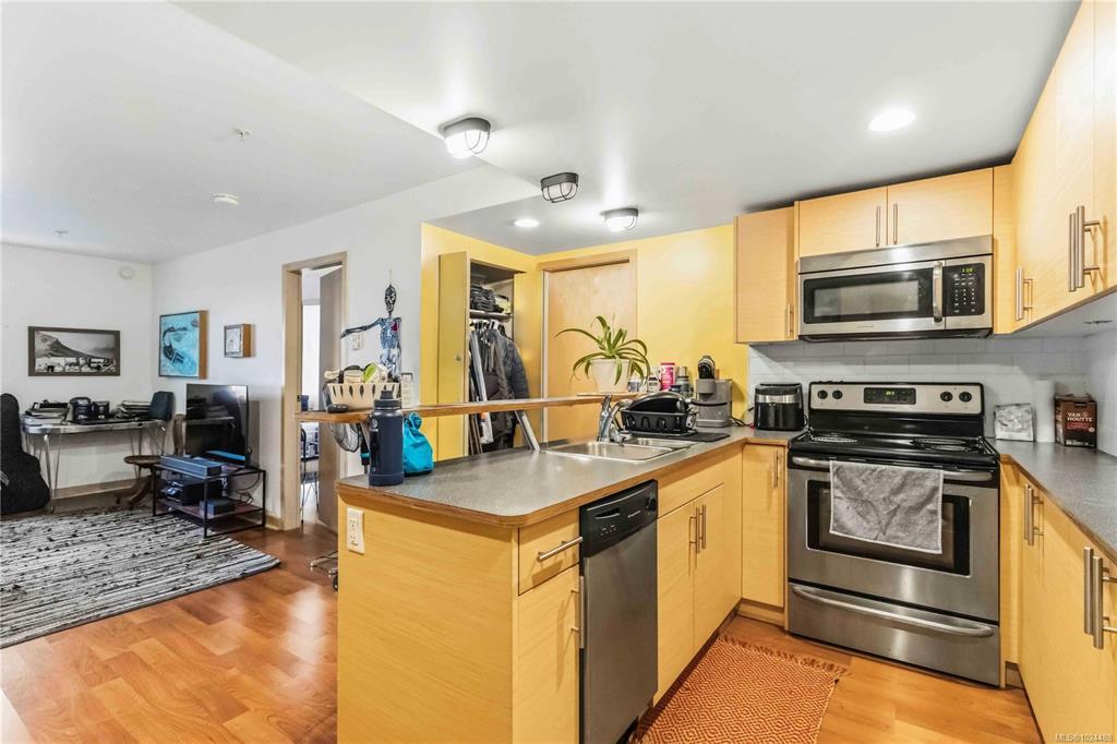 Welcome to the RailYards - this bright and stylish 1-bedroom corner condo offers an unbeatable location just steps to downtown, the Gorge Waterway, and the Galloping Goose Trail. The open-concept layout features a well-appointed kitchen with stainless steel appliances, ample cabinetry, and great flow for everyday living. Thoughtful upgrades include in-suite laundry, laminate flooring, updated lighting, and a newer hot water tank. The building is well-managed, pet-friendly, and fully rentable, giving you flexibility whether this is your first home or an investment. Additional perks include an underground parking stall, separate storage, and shared bike & kayak storage. Launch your kayak or paddleboard just minutes from your door, or hop on the Goose for an easy commute. Walk to shops, cafés, restaurants, transit, & the water taxi. With so much at your doorstep, this condo is more than a home—it’s a lifestyle. Don’t miss the opportunity to own in one of Victoria’s finest neighbourhoods.