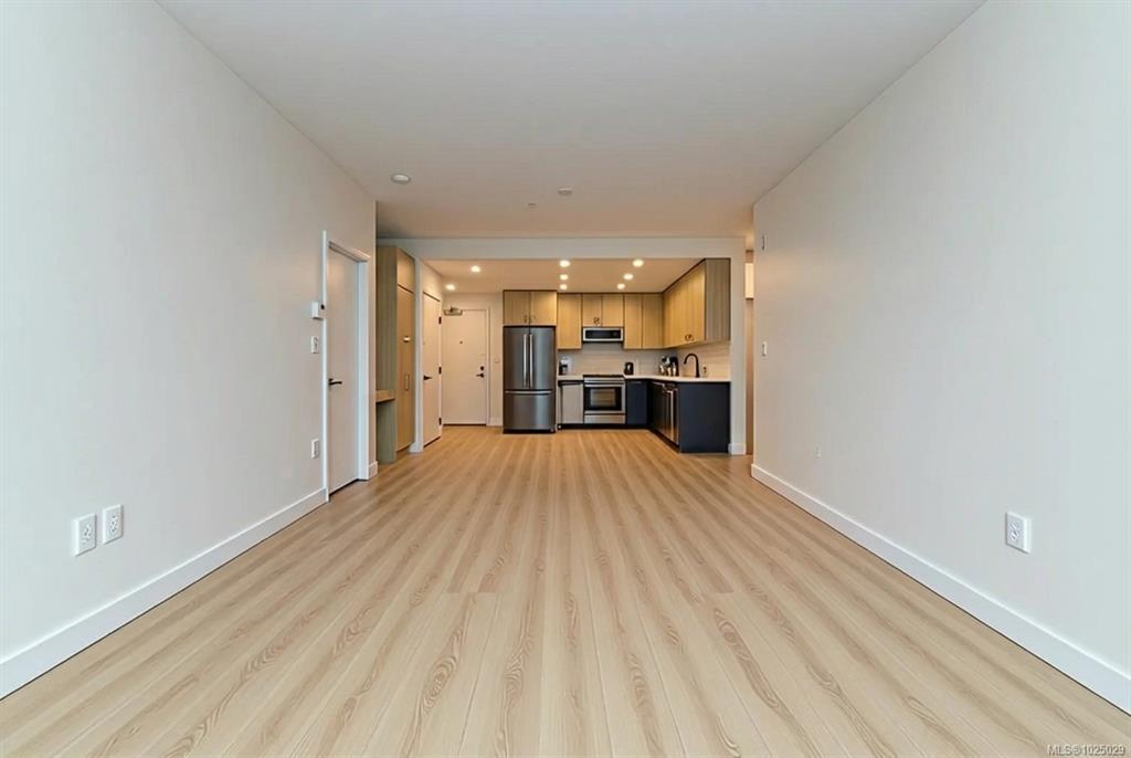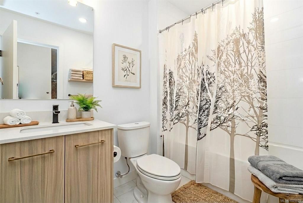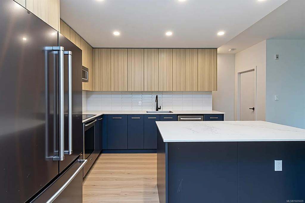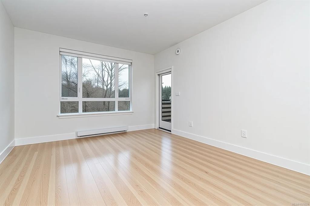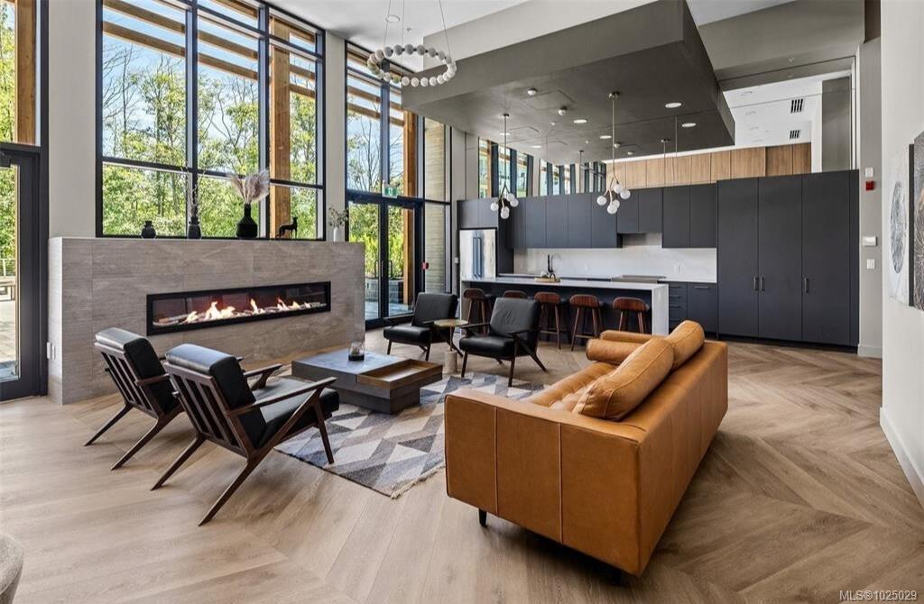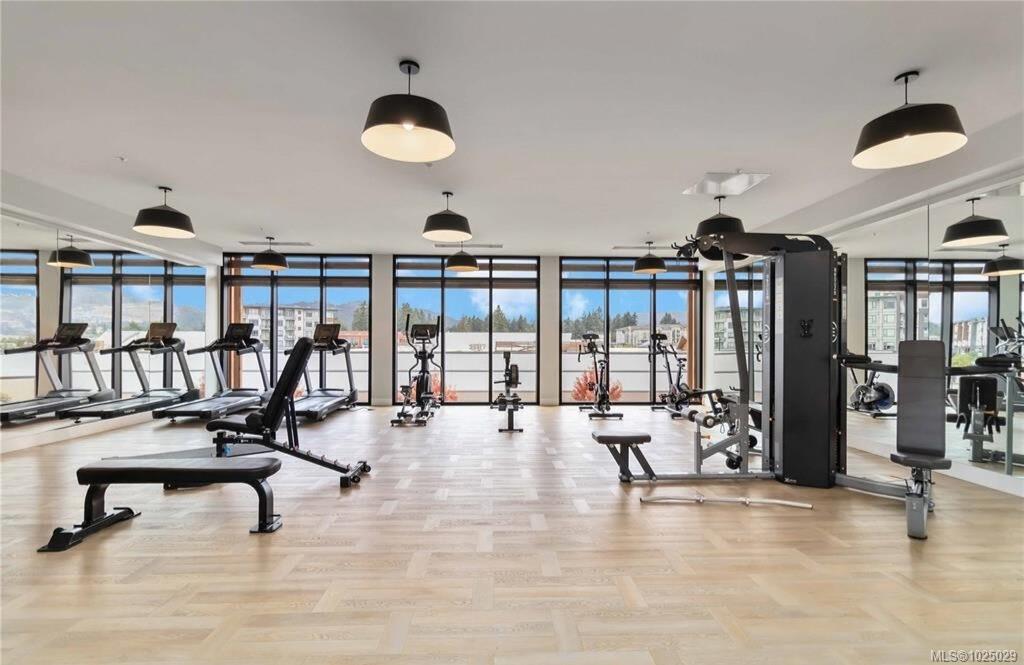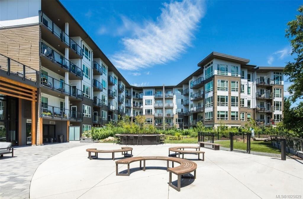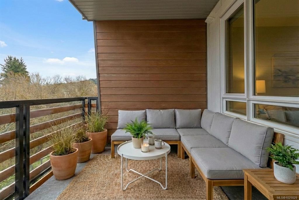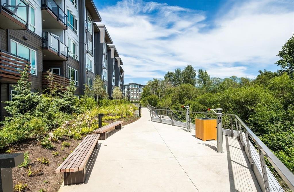 Welcome to Reunion at Belmont. This spacious 2 bedroom & 2 bathroom + den residence is ideally positioned on the quiet side of the building, overlooking the Galloping Goose Trail & beautifully landscaped green space. The thoughtfully designed floor plan features a refined kitchen w quartz countertops, stainless steel appliances, tiled backsplash & an oversized island w seating for two—perfect for entertaining & everyday living. Wide-plank vinyl flooring flows throughout, complemented by tile in the bathrooms, while the split-bedroom layout offers excellent privacy. A dedicated office nook & generously sized den or third bedroom provide flexible space to suit your lifestyle. Enjoy access to impressive amenities including an elegant common lounge w private patio, third-floor terrace w shared BBQ & a fully equipped gym. Secure underground parking, separate storage, a dog wash, off-leash dog park & steps to Belmont Market for dining & everyday essentials complete this exceptional offering.