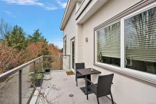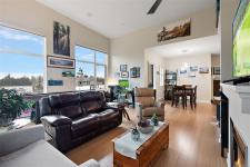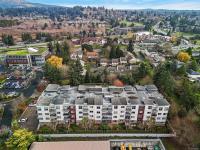 Make this top-floor corner 2-bed, 2-bath unit your Royal Oak oasis. 13 ft vaulted ceilings and 1189 sq ft open concept set it apart from the rest. Bathed in light by oversized South and West facing windows with unobstructed sunset, mountain and park views. The expansive living area with fireplace separates the bedrooms and flows to 2 large decks for relaxing, entertaining and BBQs. Kitchen has updated S/S appliances, granite counters, roll-out shelves in walnut cabinets & bamboo floors that flow to spacious living & dining areas giving an inclusive vibe. The large primary suite’s vaulted ceilings, 2 large closets & 4pc ensuite with soaker tub is luxurious. A 3pc bathroom and 2nd bedroom with wall-bed allows for family, guests & office. Updated washer/dryer, hot water tank, carpet in bedrooms, screens on doors & windows. 2 secure parking spots & storage. Non-smoking building, pet friendly, rentable, no age restrictions & EV charging. Shopping, rec-center, walking trails at your door.