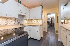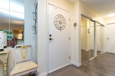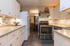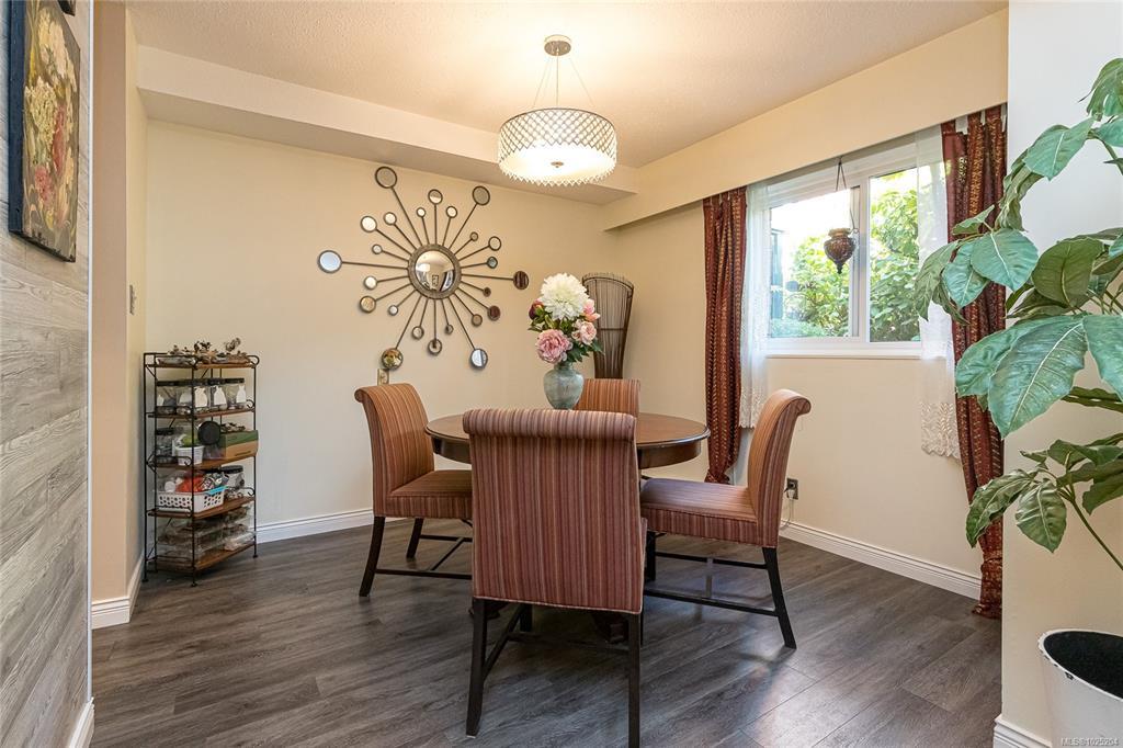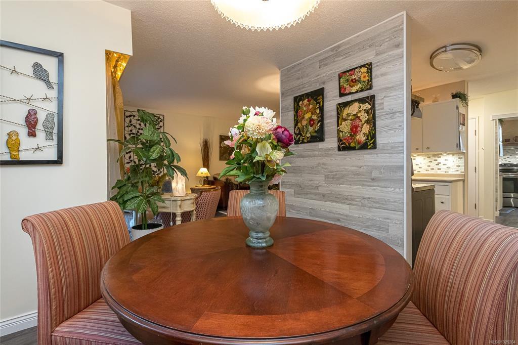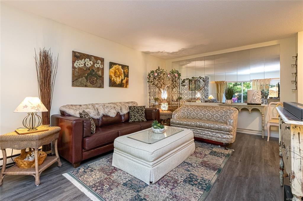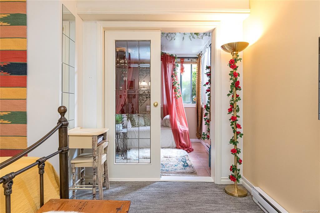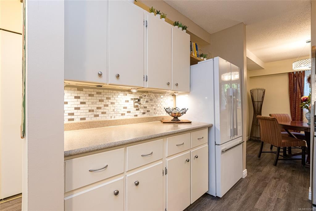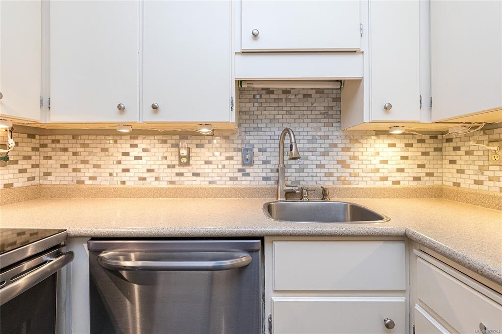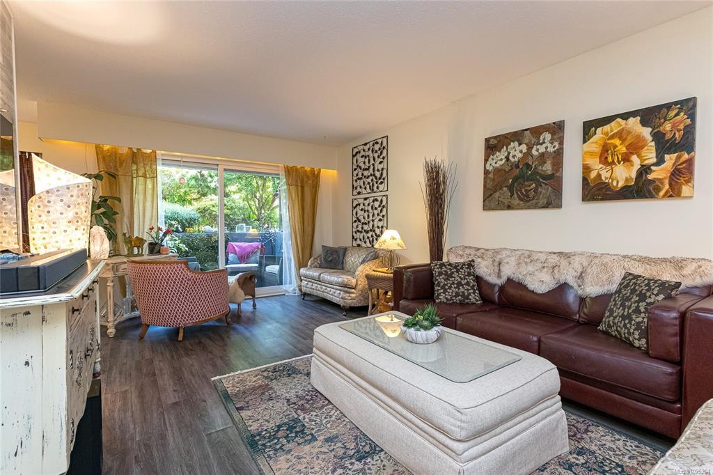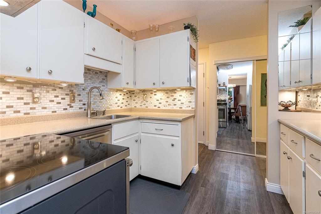 This spacious 1 bed + den, 1 bath condo offers a rare blend of comfort, style, & tranquility in a sought-after location. The layout features generously sized rooms, oversized windows, and a sunroom-style nook that creates a bright, airy feel. Step out to your private, east-facing patio—surrounded by mature greenery, perfect for morning sun and summer shade. Updates include modern flooring, fresh paint, sleek kitchen backsplash, a high-end Fisher & Paykel fridge, and a refreshed bathroom. The bedroom is truly oversized—ideal for a king bed. The open-concept living/dining area features a full-size dining room and modern finishes. You'll also enjoy in-suite laundry, a large walk-in closet & extra storage. Tucked near the Vic West/Esquimalt border, just minutes to the Galloping Goose Trail, Gorge Waterway, transit, and downtown. Includes a storage locker and parking. Cat-friendly & rentals allowed in this well-managed building. A turnkey gem for first-time buyers or downsizers!