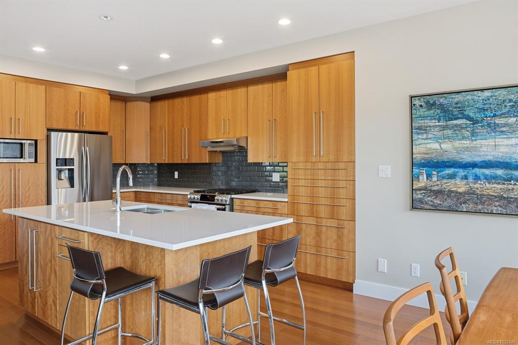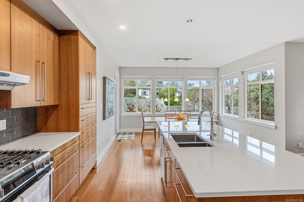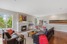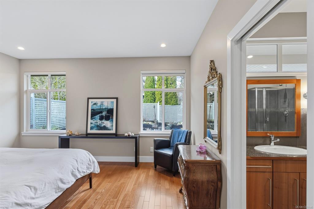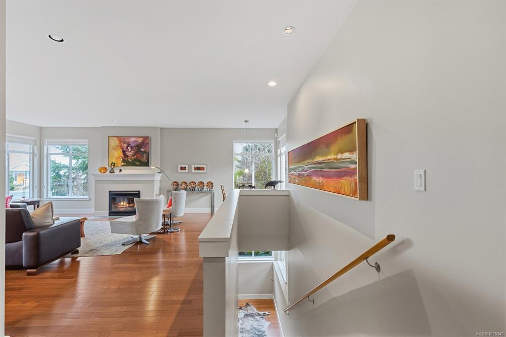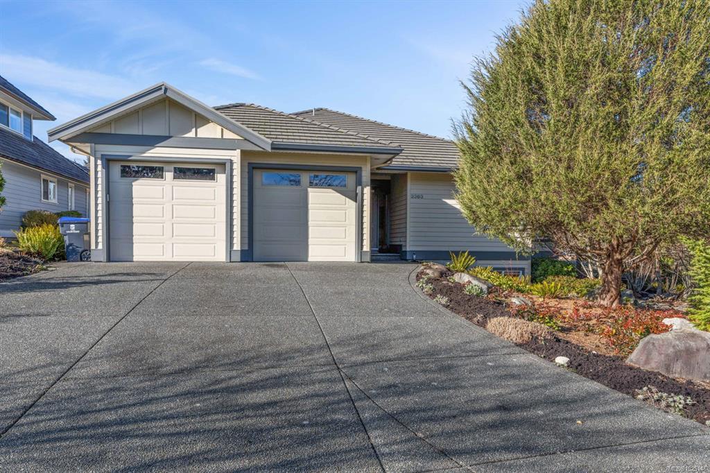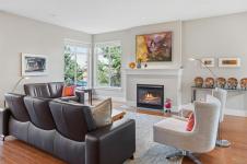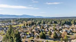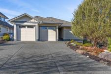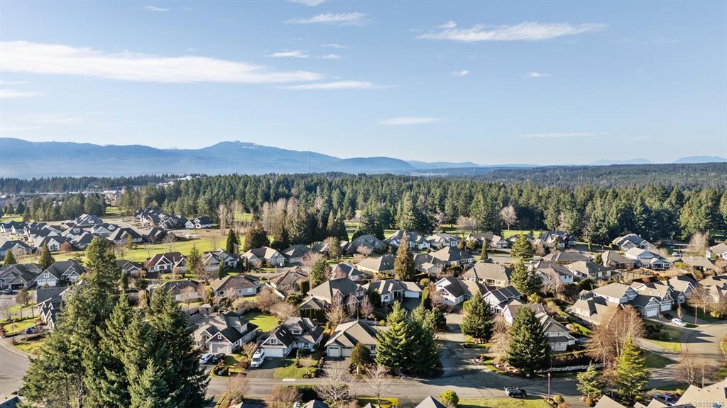 Stylish & thoughtfully designed, this 2945 sqft, 4 bed, 3 bath + den, custom home offers functionality, with a mid-century modern feel. Light-filled living on the main floor, including open-concept kitchen, quartz counters, gas range, & custom cabinetry. A window-lined dining area opens to a private courtyard. The living room is anchored by warm hardwood floors & a gas fireplace. The large primary features a generous walk-in & ensuite with double sinks. An office/den, second bedroom, laundry, & double garage are all located on the main floor. Down, a spacious family room for guests & media is complemented by a gas fireplace, 2 beds, bathroom & utility/storage area. Set on an elevated corner lot, you have a lofty outlook with privacy. Landscaped with native plants, designed by a master gardener with deer-resistant plants, rock features, mature trees, & river rock paths- creates a Gulf Island-inspired atmosphere. Next to the Crown Isle golf course, this property is a must see!