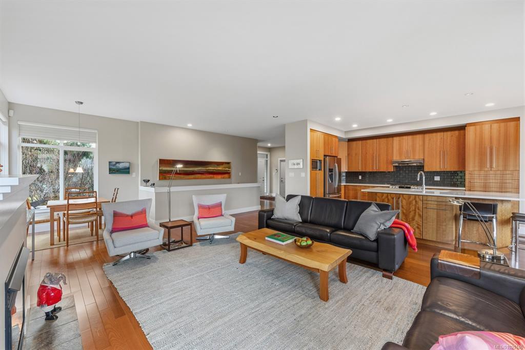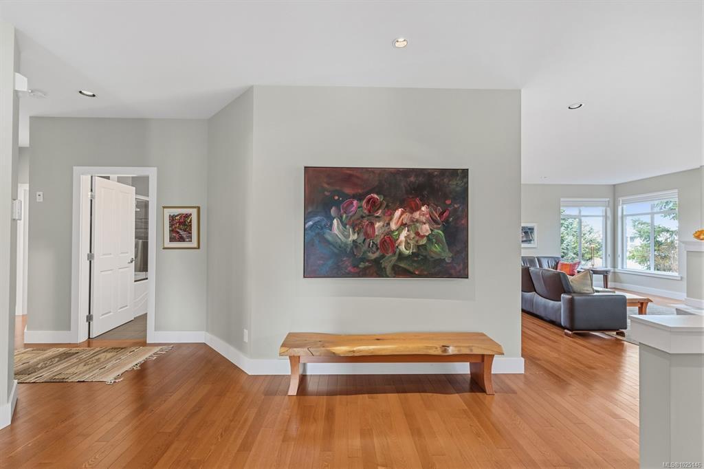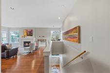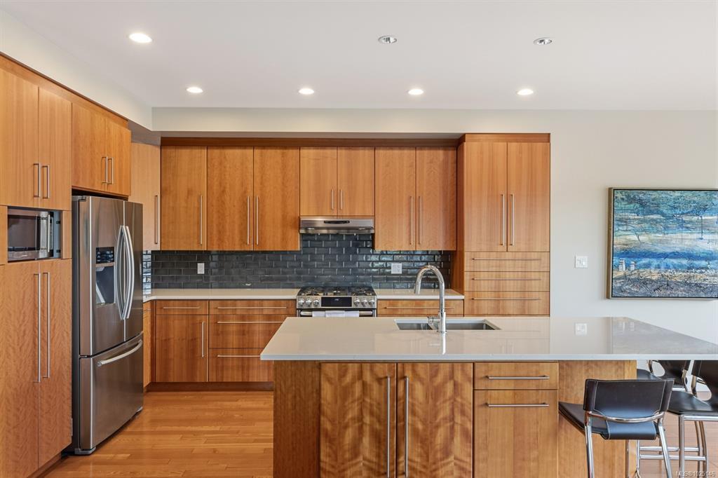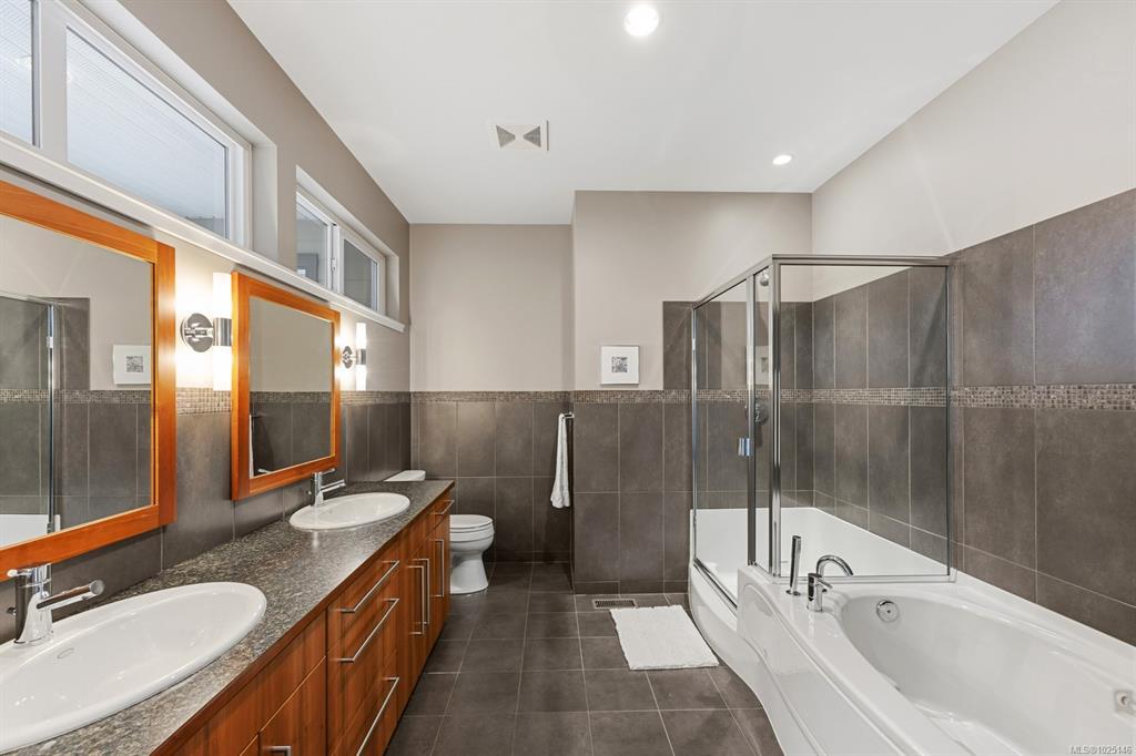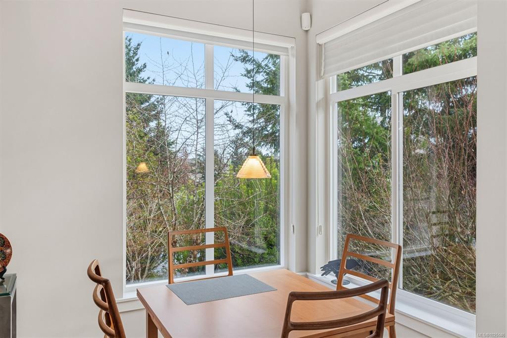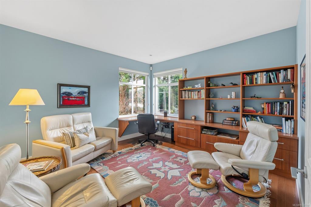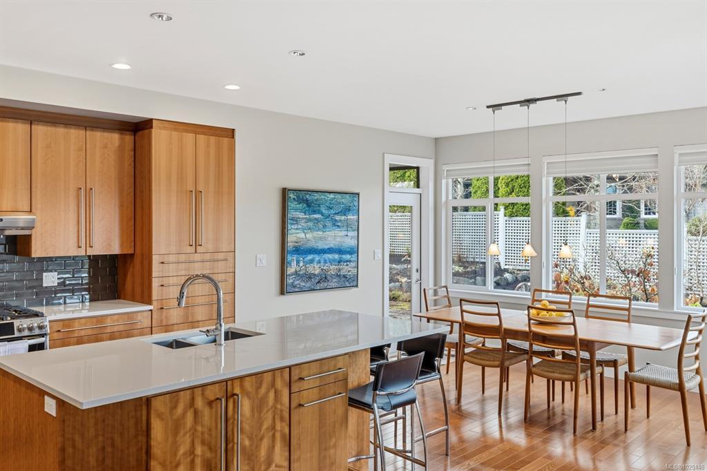 Stylish & thoughtfully designed, this 2945 sqft, 4 bed, 3 bath + den, custom home offers functionality, with a mid-century modern feel. Light-filled living on the main floor, including open-concept kitchen, quartz counters, gas range, & custom cabinetry. A window-lined dining area opens to a private courtyard. The living room is anchored by warm hardwood floors & a gas fireplace. The large primary features a generous walk-in & ensuite with double sinks. An office/den, second bedroom, laundry, & double garage are all located on the main floor. Down, a spacious family room for guests & media is complemented by a gas fireplace, 2 beds, bathroom & utility/storage area. Set on an elevated corner lot, you have a lofty outlook with privacy. Landscaped with native plants, designed by a master gardener with deer-resistant plants, rock features, mature trees, & river rock paths- creates a Gulf Island-inspired atmosphere. Next to the Crown Isle golf course, this property is a must see!