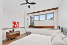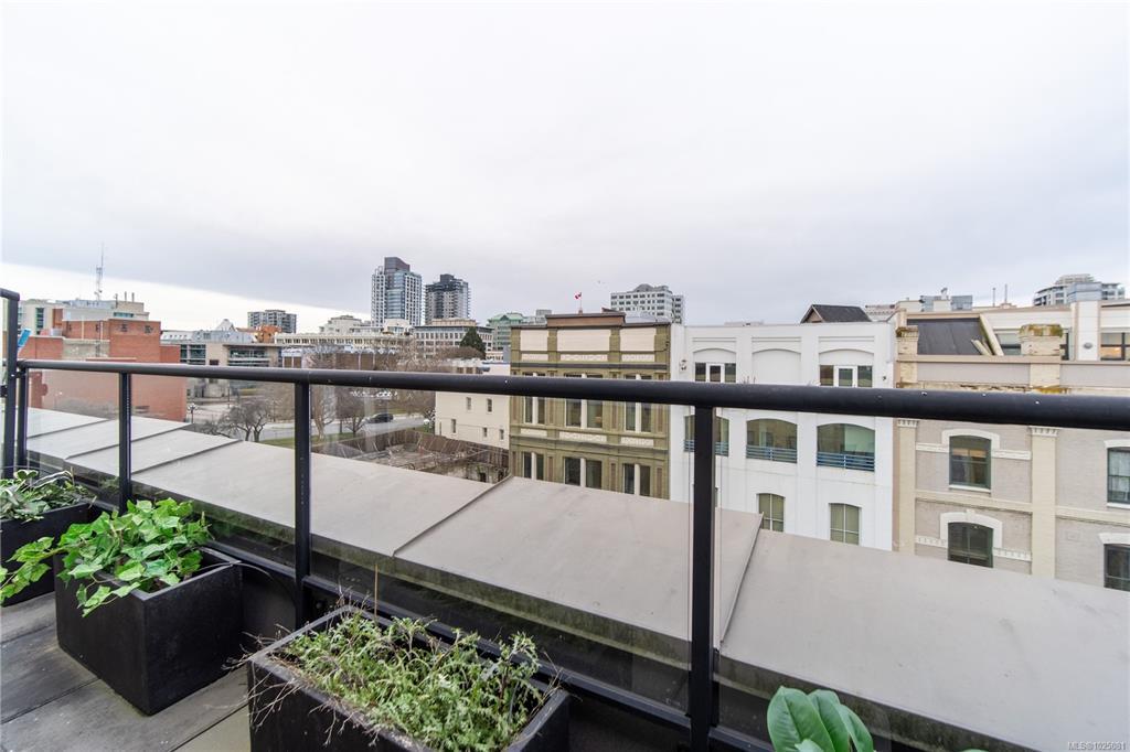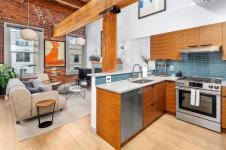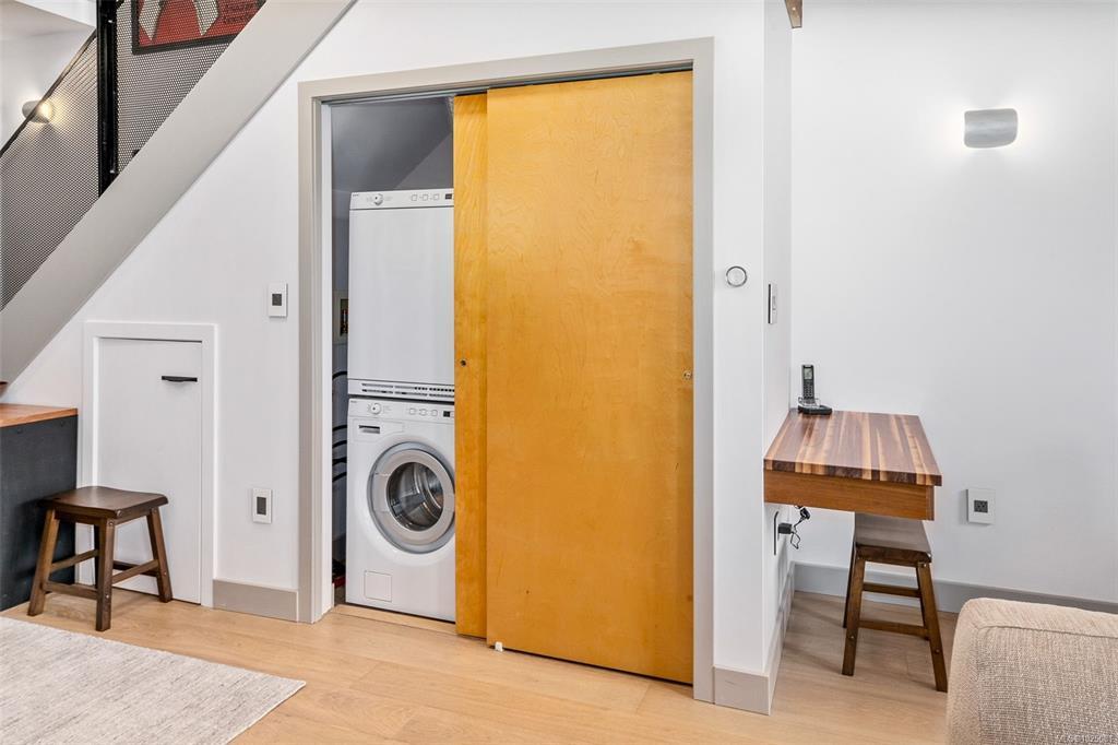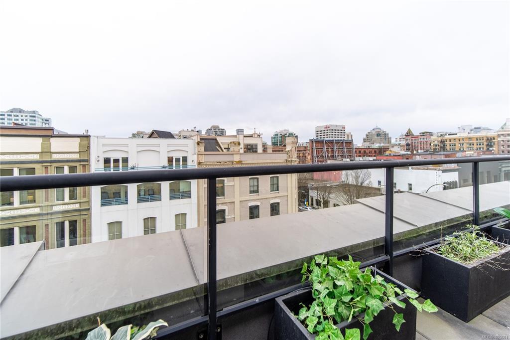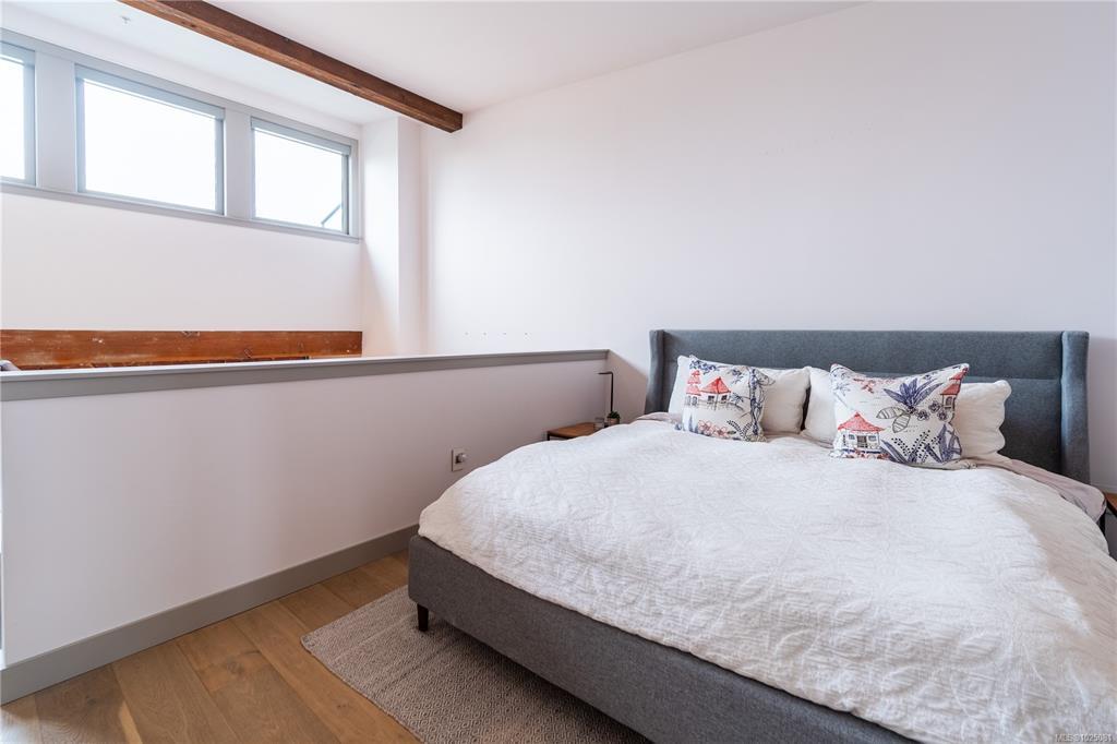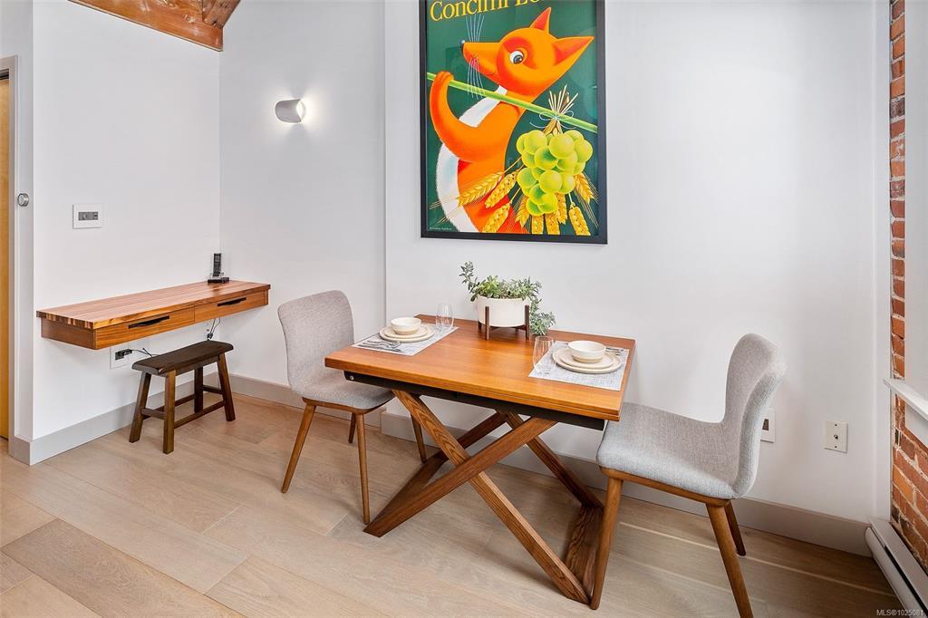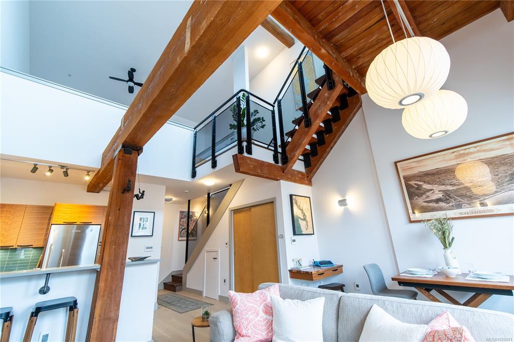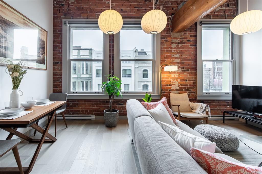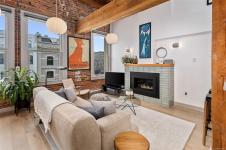 Heritage loft in Old Town Victoria at The Vogue—a premier steel & concrete heritage conversion. Stunning luxury loft w 21’ ceilings, exposed old-growth beams, brick feature wall & flr-to-ceiling windows w Hunter Douglas remote sheers & blackouts ($7,500). Gourmet kitchen w custom cabinetry, stone ctrs, glass subway tile & hi-end Euro appls: Bosch D/W ($2,500), Blomberg gas stove ($4,000), Blomberg fridge ($3,000), premium sink & fixtures ($2,000). Open living space anchored by new Valor gas FP (2025, $7,500) w custom tile. Custom lighting ($5K), custom bath cabinetry ($8K), built-in desk ($2,500), in-suite laundry & radiant flrs throughout. Spacious loft w 11’ ceilings, fits king bed + furniture, ensuite (convert back to shower). 17’ balcony w irrigation, plus common rooftop deck. 1 secure parking + storage. Steps to shops, cafés, dining & transit. Over $77K in upgrades.