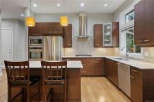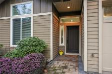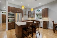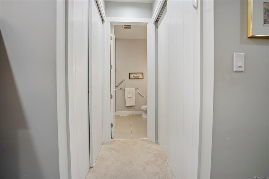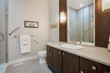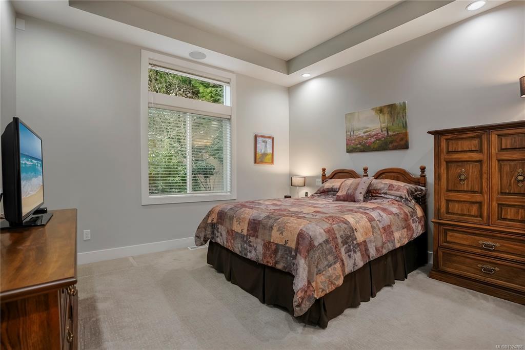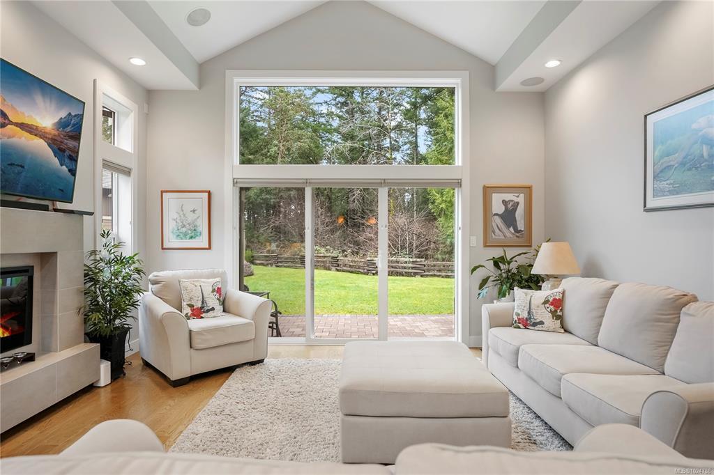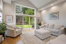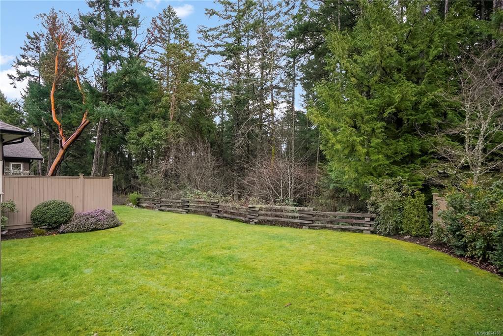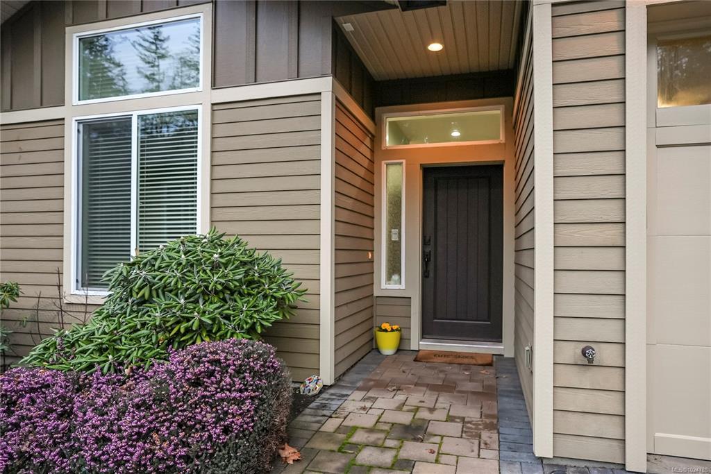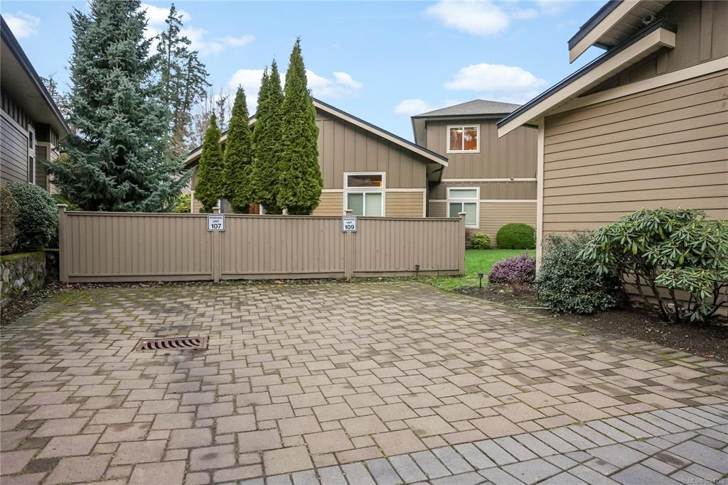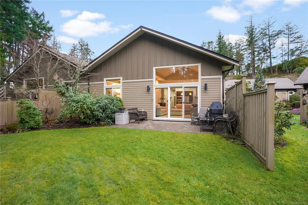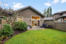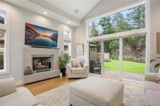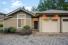 Tucked away near Latoria Creek Park in the sought-after Royal Bay community, this sun-filled corner end-unit townhome offers rare one-level rancher living within an intimate enclave of contemporary residences. Backing directly onto forest and walking trails to enjoy nature in a private setting. Featuring: vaulted ceilings, expansive windows, engineered wood flooring, and surround sound create a bright, modern feel. The gourmet kitchen showcases custom contemporary cabinetry & countertops, complete w/oven, cooktop, island, and nice appliances. Spa-inspired baths feature floor-to-ceiling tile, geothermal heating, and a custom f/p, adding comfort and convenience. Lots of storage, crawlspace, parking stall + garage. A wonderful setting and community to call home.