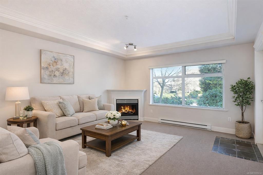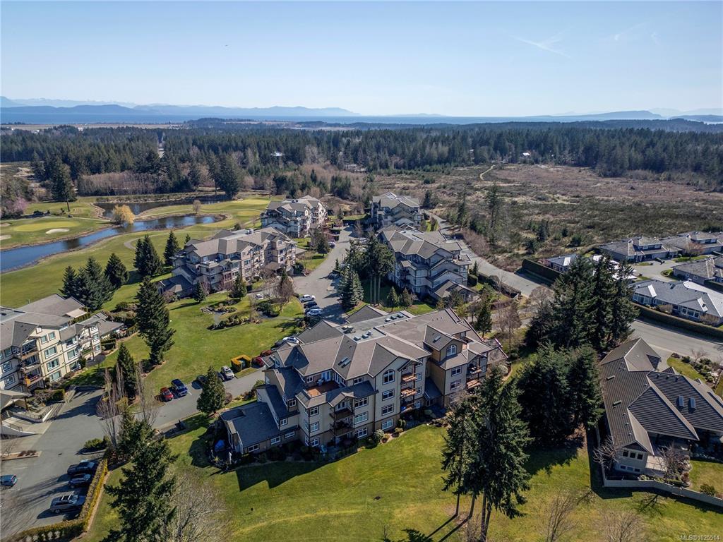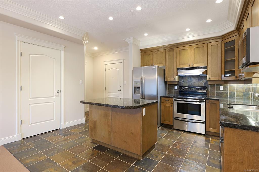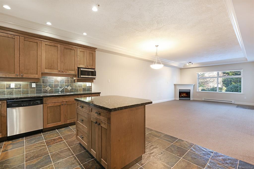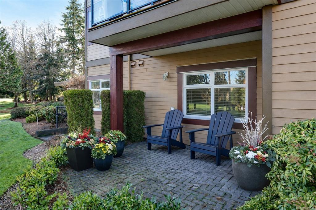 Corinthia Estates at Crown Isle offers resort-style, low-maintenance living in a prime golf course community. This well-kept 1,270 sqft condo features 2 bedrooms, 2 bathrooms, and a bright, functional layout suited to everyday comfort or a lock-and-leave lifestyle. The kitchen includes stone counters, quality cabinetry, stainless appliances, and an island with seating that opens to the main living and dining area with a natural gas fireplace. Step onto the covered east-facing patio with BBQ hookup — ideal for relaxed mornings and evening downtime, with easy pet access. The spacious primary bedroom includes a 5-piece ensuite with heated tile floors, double vanity, deep tub, separate tiled shower, and private water closet. A second bedroom, full bath, and large in-suite laundry/storage room with utility sink add flexibility. Secure underground parking and storage complete this package.
