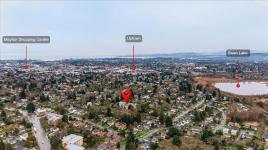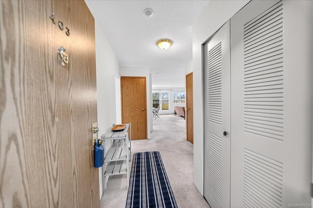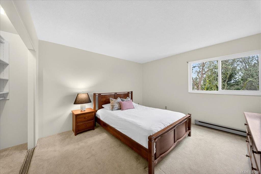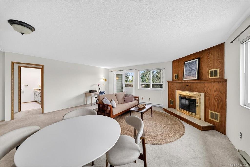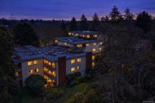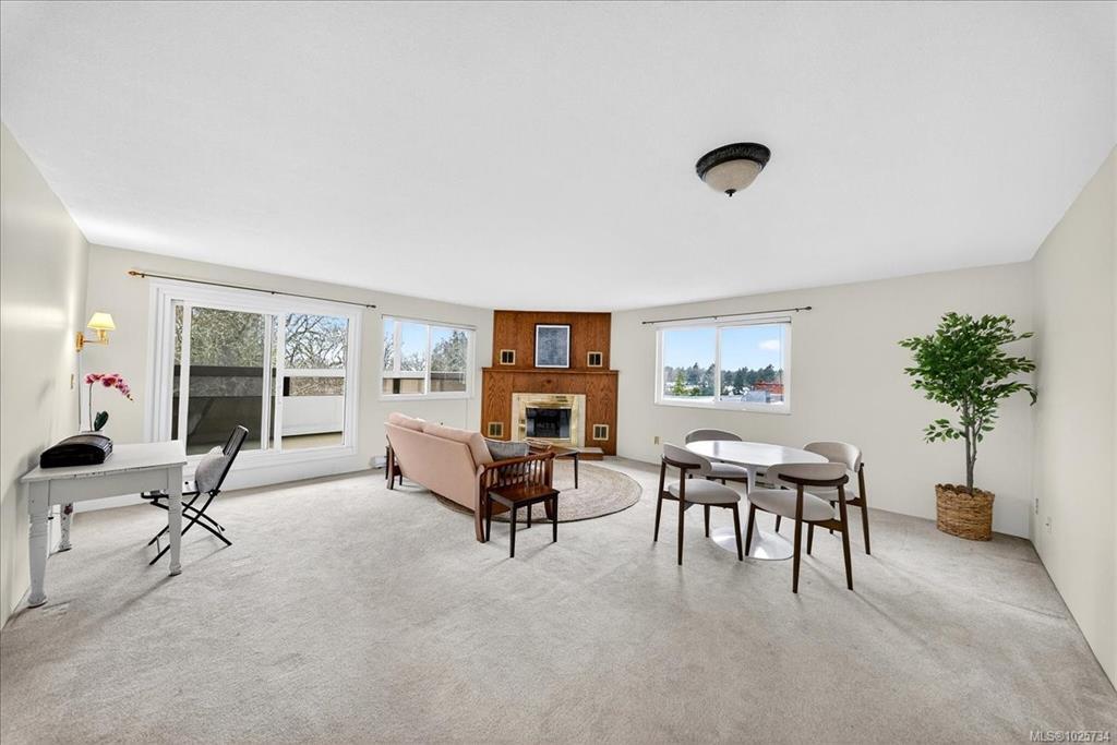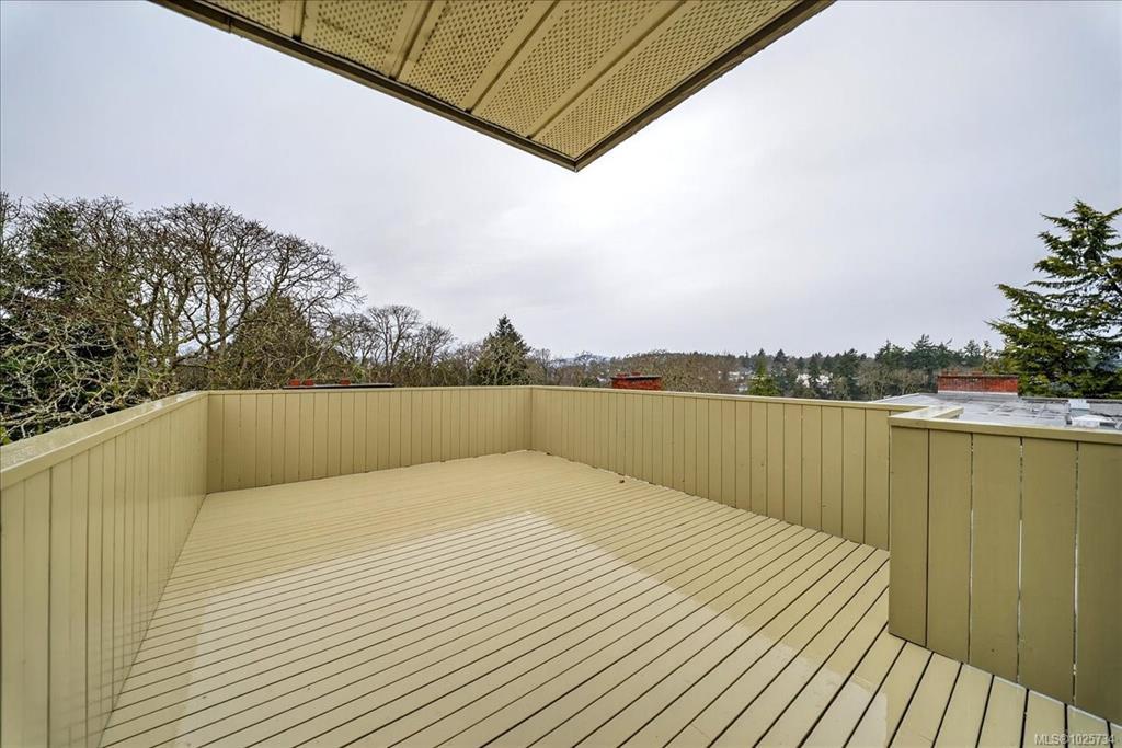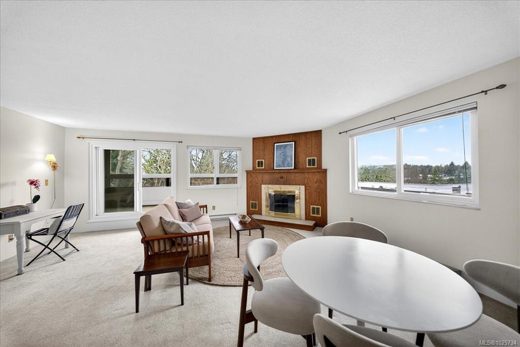 Immediate possession! Bright & private west-facing corner suite offering 1,100+/- sq ft of well-designed living space, plus a deluxe private rooftop patio perfect for outdoor entertaining or quiet relaxation. This spacious 2-bedroom, 1-bathroom home features 2 generously sized bedrooms thoughtfully positioned at opposite ends of the unit for added privacy. Surrounded by a tranquil Garry Oak forest & tucked away from busy streets, this peaceful space offers the best of nature & convenience. Kitchen with large skylight welcoming the natural light into the space while a cozy wood-burning fireplace anchors the living room. Laundry area is on the 4th floor, not far from the unit. Set on 2.8 acres of park-like property, this pet-friendly community also offers secure, dry bike storage, additional individual storage, and one parking stall with potential to rent additional parking. Ideally located mins from Uptown, Saanich Centre, Swan Lake, & the Galloping Goose Trail.