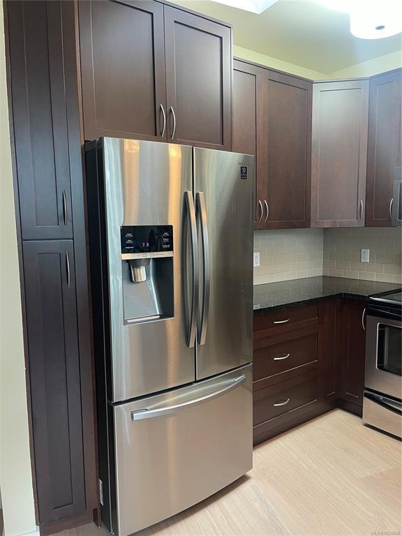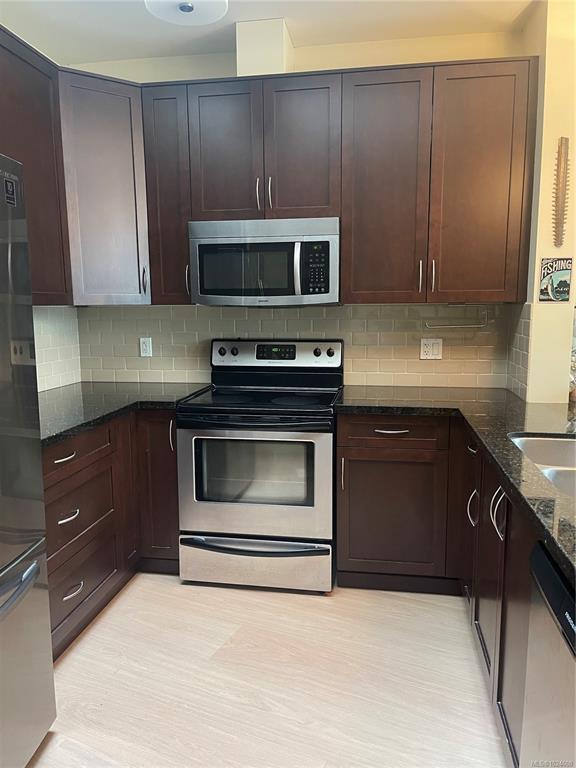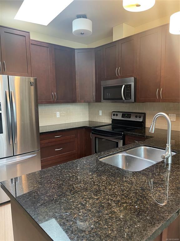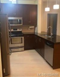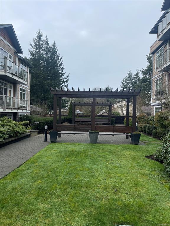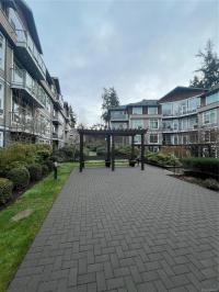 Top floor unit overlooking the Royal Colwood golf course. This 2 bed, 2 bath home is sure to impress with great separation between bedrooms and bathrooms. Enjoy your spacious open living area with huge windows and a vaulted ceiling, offering tons of natural light and access to the balcony overlooking the tree-lined golf course. 9’ ceilings throughout, with updated (2025) wide plank oak hardwood flooring in the main living areas and fresh paint (2025). The gourmet kitchen features granite countertops, overheight cabinets and stainless steel appliances. A spacious primary bedroom offers walk-in closet and ensuite with soaker tub and separate shower. Enjoy the convenience of in-suite laundry, secure underground parking, and storage locker. Pets, BBQ's and rentals are allowed. Located close to Goldstream Ave, schools, amenities and so much more.