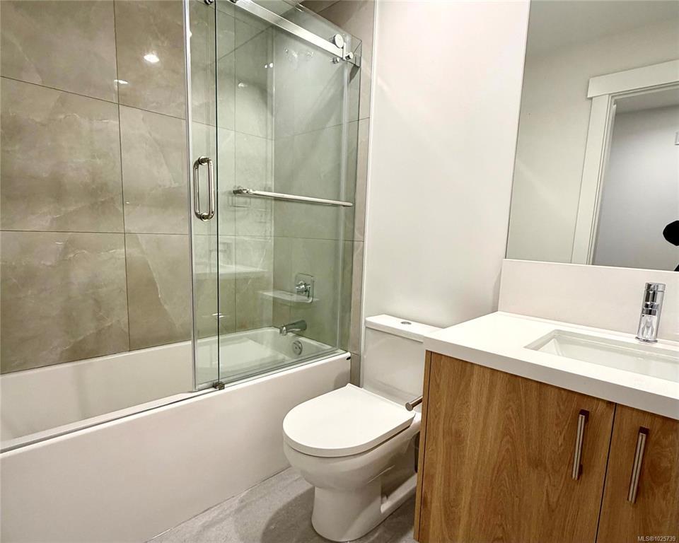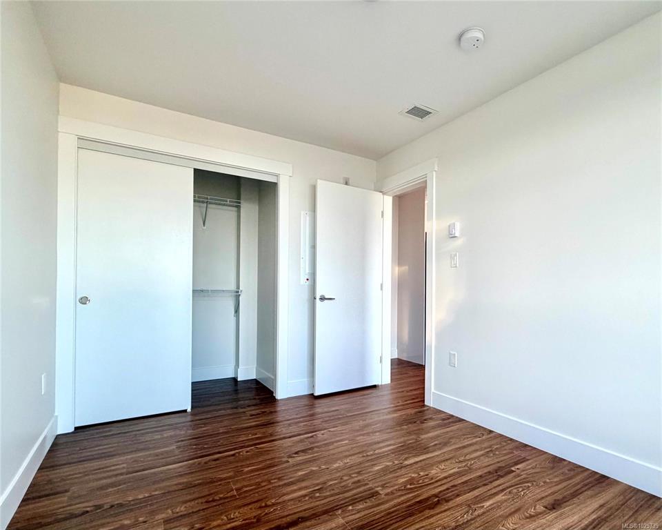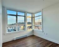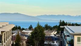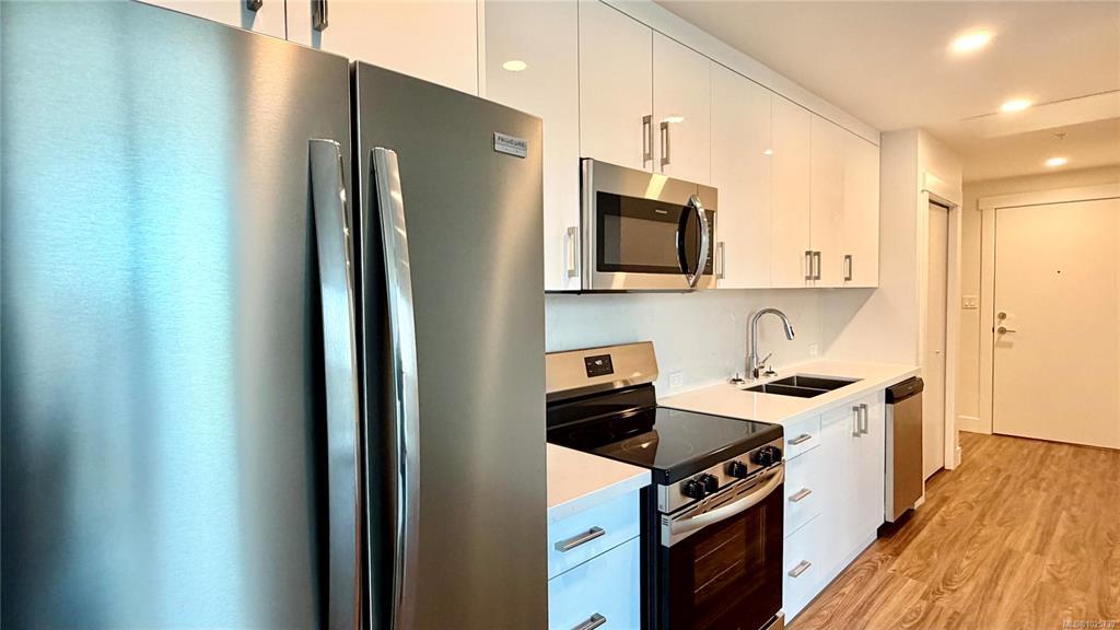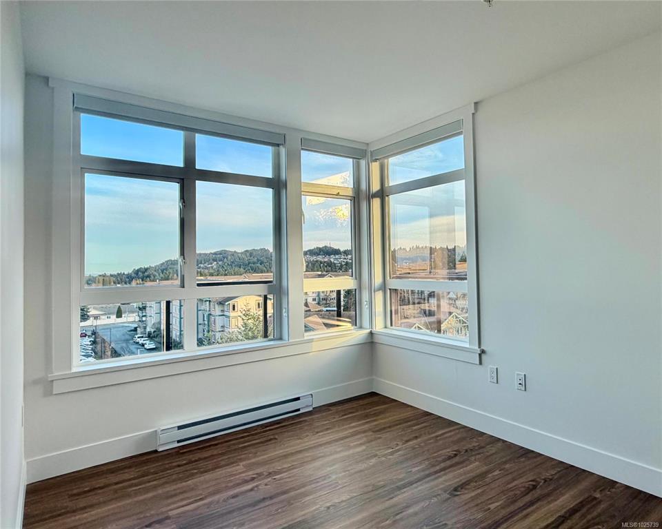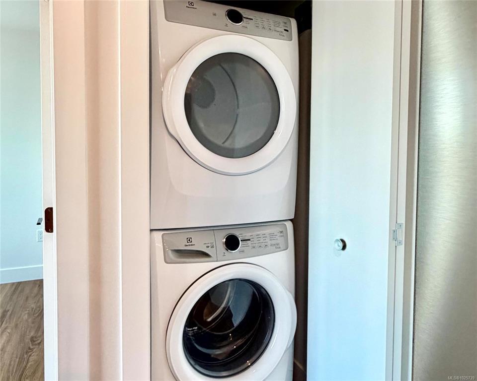 Prestige 1-bdm corner suite on the 5th floor at The MINT—brand new North Nanaimo condos—featuring sweeping 270° ocean, mountain, and city views from expansive corner. This bright, modern home offers an open-concept kitchen with quartz countertops and an American-made Frigidaire appliance package, plus in-suite Electrolux front-load stacked washer/dryer. Enjoy beautiful, top-quality laminate flooring throughout, a spacious bdrm w/ corner windows for abundant natural light, and a walk-in closet. The stylish bthrm showcases a full-height tile tub surround and quartz vanity for a clean, upscale finish. Step outside to an extensive wrap-around balcony—perfect for relaxing, entertaining, and soaking up sunny days. Comfort and convenience continue with secure building entry, underground designated parking, and a storage locker. Unbeatable location next to Costco, close to Woodgrove centre, schools, transit, & everyday amenities. Ideal for first-time buyers, small families, or smart investors.