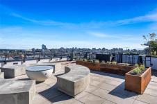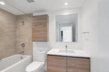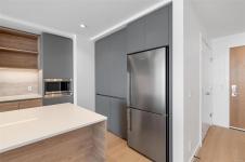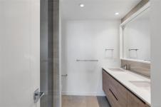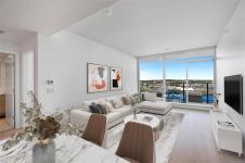 This stunning 2-bedroom, 2-bathroom sub-penthouse offers panoramic views of the city skyline, ocean, and mountains — all from your expansive 179 sq ft balcony. Inside, the open-concept layout features a gourmet kitchen with a quartz island, gas range, and custom cabinetry — ideal for both daily living and entertaining.