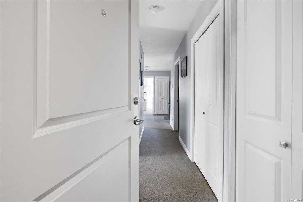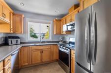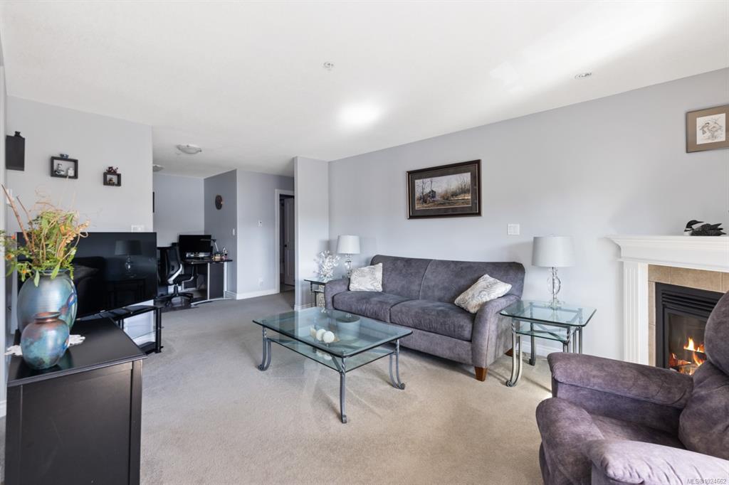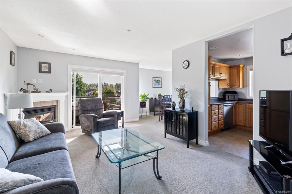 This top-floor corner unit is a rare opportunity in a beautifully maintained 55+ community. With 2 beds, 2 baths & 1084sqft. of sunlit living space, this condo sure is special. The original owners have thoughtfully updated it over the years: remodelled kitchen (2014) & brand-new appliances, both bathrooms redone in 2022, window coverings (2021), plus a lifetime-warranty hot water tank. Step inside & enjoy a spacious living room with a cozy gas fireplace, inviting dining area, handy office nook & a private deck for morning coffee or evening sunsets. Vaulted ceilings in the guest bedroom & primary suite create an airy, elegant feel, with the primary boasting a walk-in closet & gorgeous ensuite. One cat or small dog (under 22 lbs) permitted. Secure entry, elevator & one parking stall included. Steps from downtown, trails, & parks—ideal for walking or exploring with your dog. With reasonable strata fees & very low hydro and gas bills, this is one not to miss.