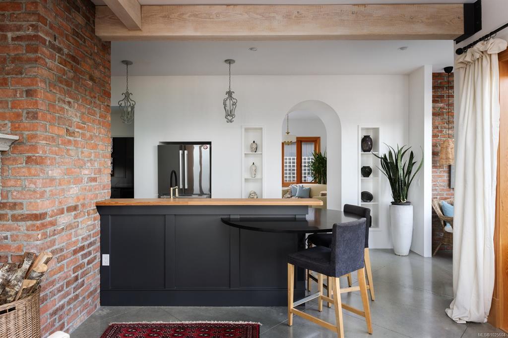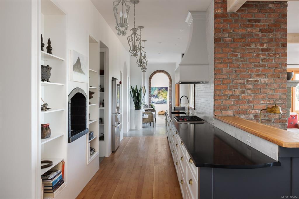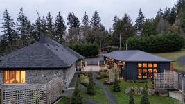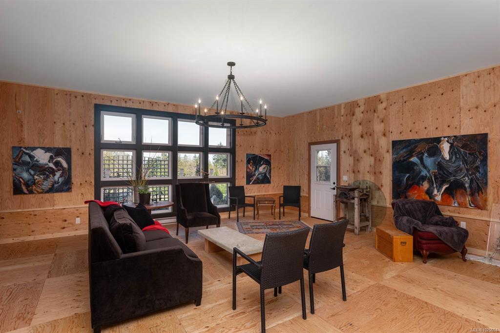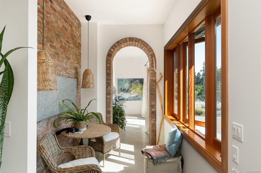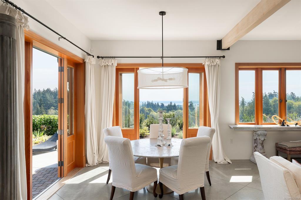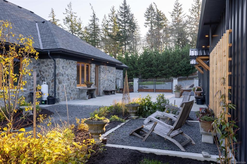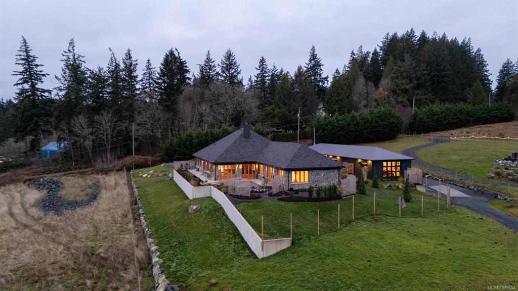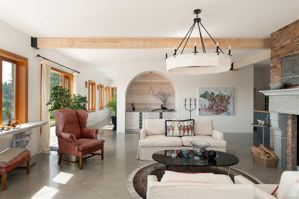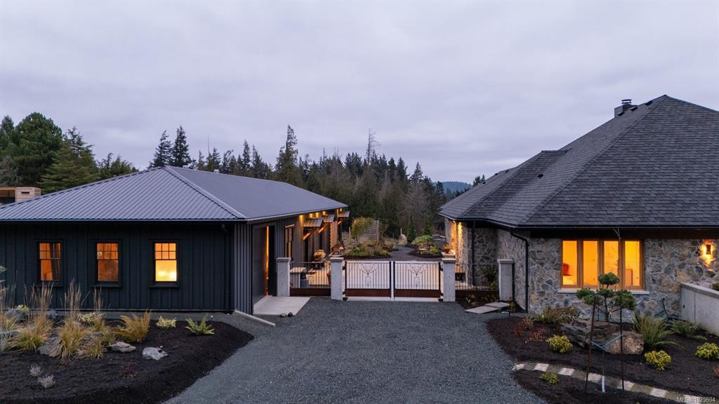 Nestled on 2.4 acres of gently rolling hillside, this exceptional Metchosin estate features a 4,000+ sq.ft. Rancher & 1,380 sq.ft. detached building with an art studio, bathroom, workshop & garage. The exterior reflects French provincial elegance, with a granite façade, wrought iron detailing & a concrete water feature signaling the craftsmanship inside. Inside, polished concrete floors, exposed beams, reclaimed brick accents, and inlaid wood detailing create an inviting, artistic atmosphere rarely seen in modern construction. The expansive great room centers on a bespoke fireplace & opens to the patio through multiple custom French doors. The kitchen includes a dedicated prep area for added convenience. The primary suite offers a serene, private retreat. Geothermal heating enhances efficiency and lowers the home’s carbon footprint. The property captures sweeping views across Haro Strait to the Olympic Mountains, providing a dramatic & inspiring backdrop to this one-of-a-kind estate.