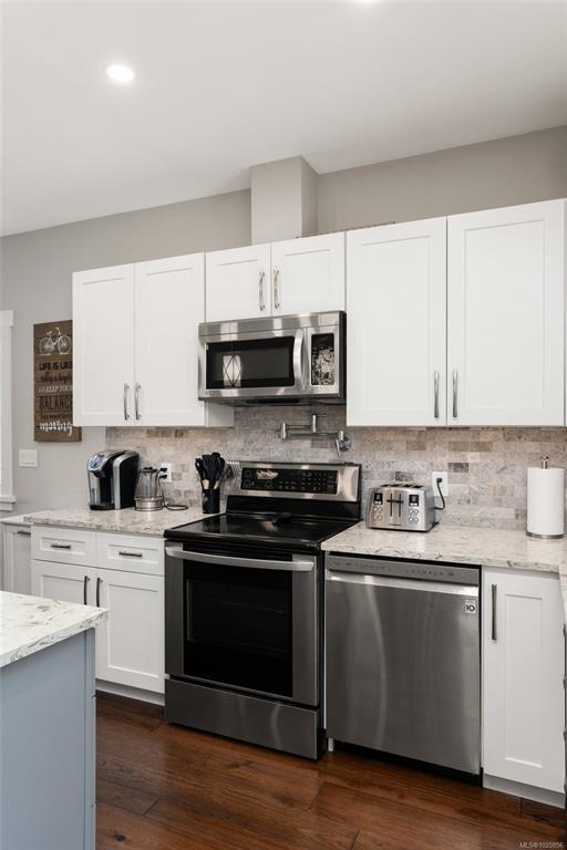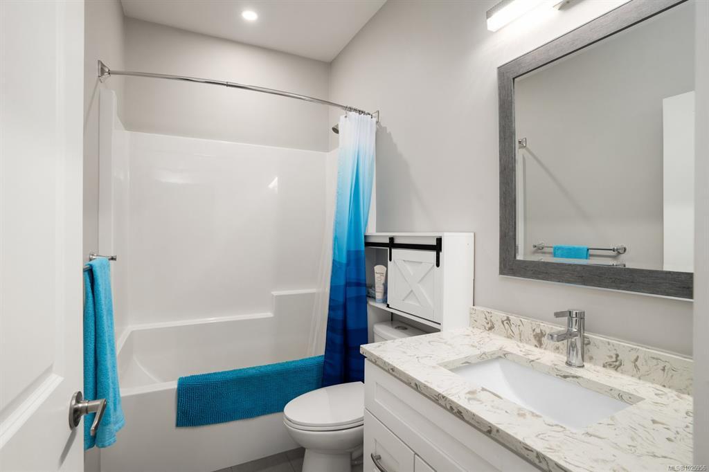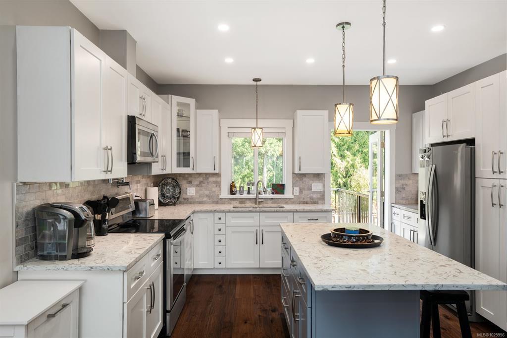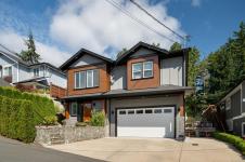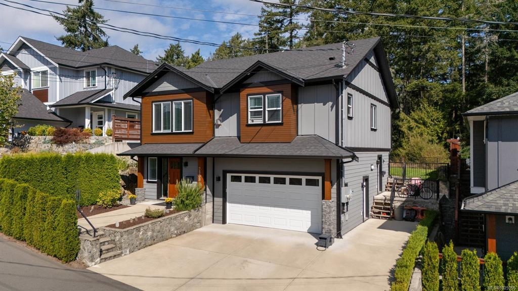 Welcome to this beautifully crafted 2018 home offering modern style, a quiet location, and unbeatable convenience. The main level features 3 bedrooms and 2 bathrooms, including a spacious primary suite with walk-in closet and full ensuite. The open-concept design highlights a bright living room with cozy gas fireplace and a stunning kitchen with quartz counters and stainless steel appliances. Enjoy entertaining on the large balcony overlooking the easy-care backyard, which backs onto green space for added privacy. Downstairs, a fully self-contained 1 bed/1 bath suite with in-suite laundry is perfect for extended family or a great mortgage helper. Additional features include a heat pump for year-round comfort and a double garage. Ideally located on a quiet road just minutes to all Langford amenities and only 20 minutes to downtown Victoria, this property delivers comfort, style, and value. Don’t miss this opportunity!