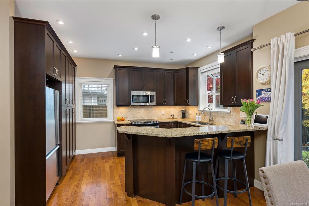 Fantastic custom home, built in 2008 offering 5 bedrooms and 3 bathrooms, including a spacious primary bedroom suite on the main floor. Nearly 2,000 sq.ft. of open-concept living featuring a beautiful kitchen with granite counters, stainless steel appliances, under-cabinet lighting and abundant storage. French doors off the dining area lead to an expansive southeast-facing patio and fully fenced yard - perfect for outdoor living. The large ensuite includes heated floors for added comfort. Upstairs are four generous bedrooms, ideal for children, guests, a home office or den, providing flexibility for any lifestyle. Located on one of Sidney’s most picturesque cherry tree-lined streets, this easy-care home is just a short stroll to beaches, the marina, town core and public library. A wonderful blend of style, function, and location - ready to welcome you home!