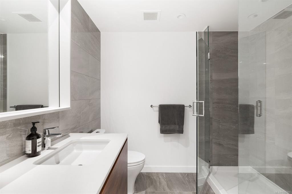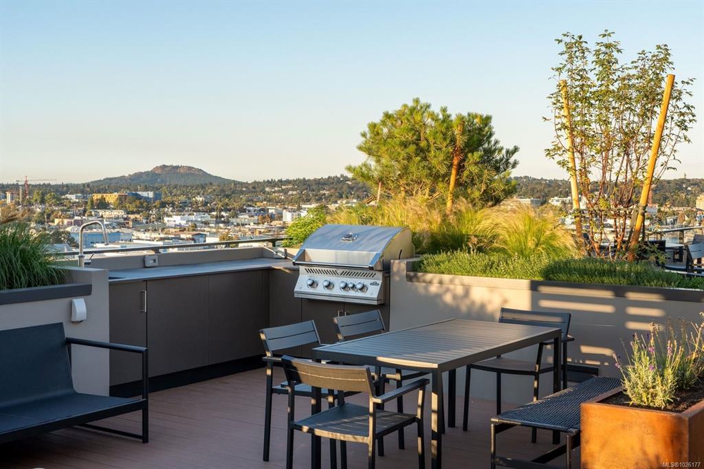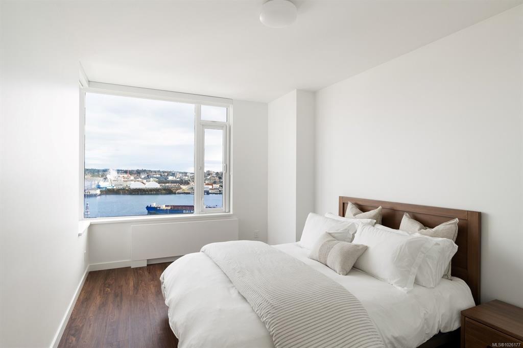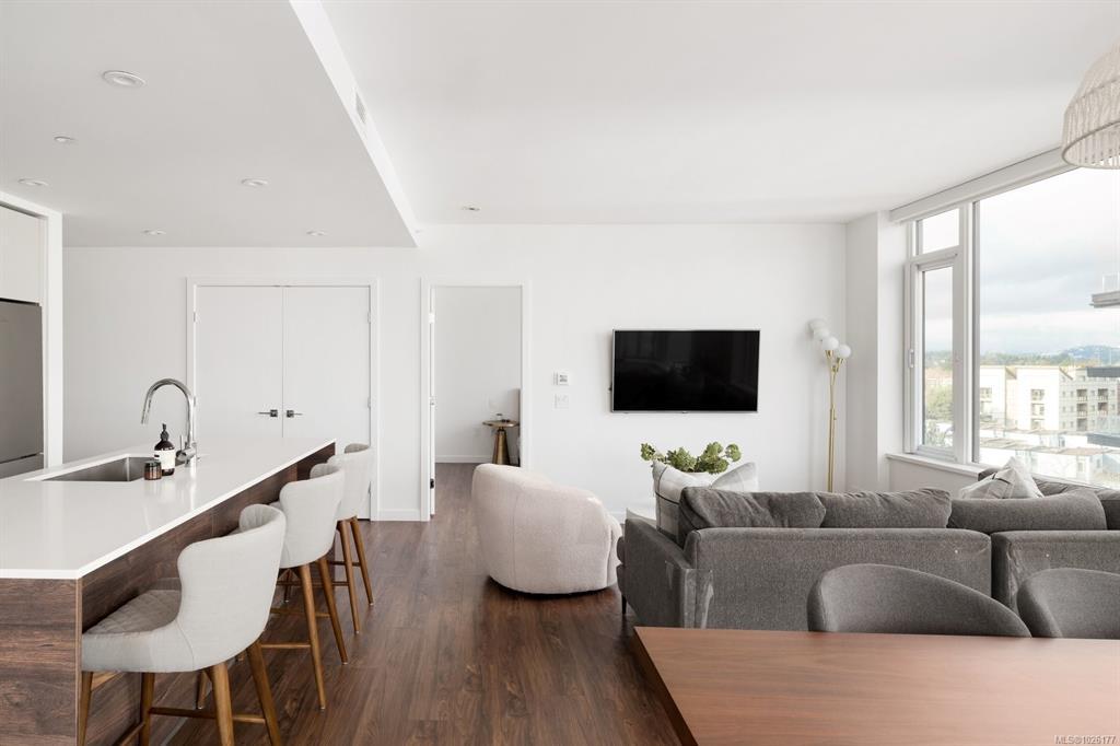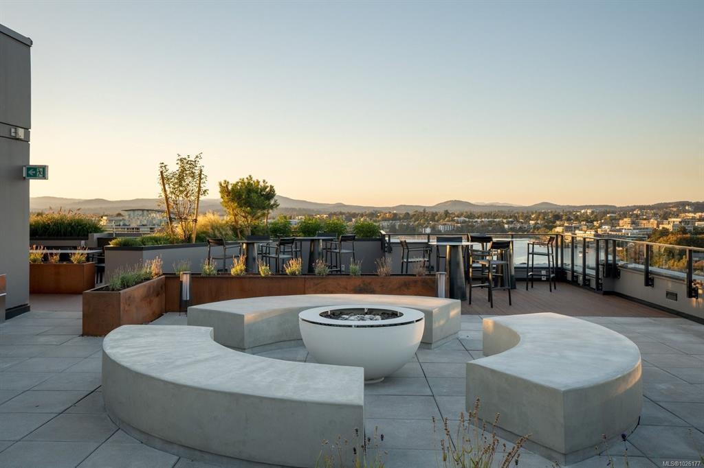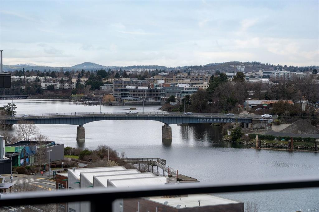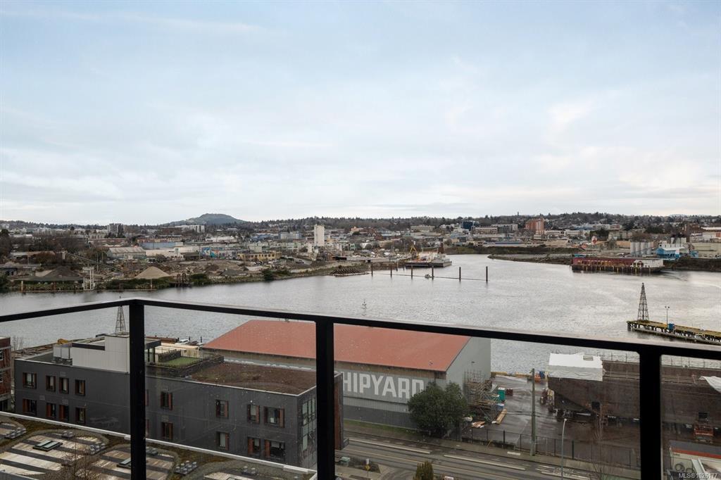 Sweeping ocean & downtown views from this corner unit on the 8th floor of 369 Tyee (Tower 1). This luxurious 2 bed/2 bath urban oasis in the heart of Vic West is thoughtfully designed with a perfect blend of modern living with sustainable features. Almost 1,100 sqft of open-concept living space, the kitchen boasts Stosa Italian cabinetry, sleek stainless steel appliances, quartz countertops, and a convenient breakfast bar. The primary bedroom is a tranquil retreat with a large ensuite & walk in closet. The 2nd bedroom is perfect for guests or office with amazing views of downtown. A large private patio overlooks the waterway, perfect spot for BBQ'ing & entertaining all summer. Storage space has not been overlooked, with plenty of closets to accommodate. Secure underground parking, separate storage & a bike room. Top it off with resident exclusive amenities - a lounge, fitness facility, pet wash, bike repair, and a rooftop patio to enjoy 360 degree views.