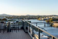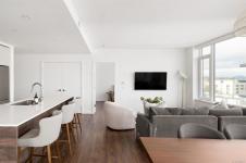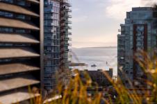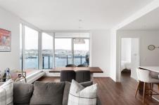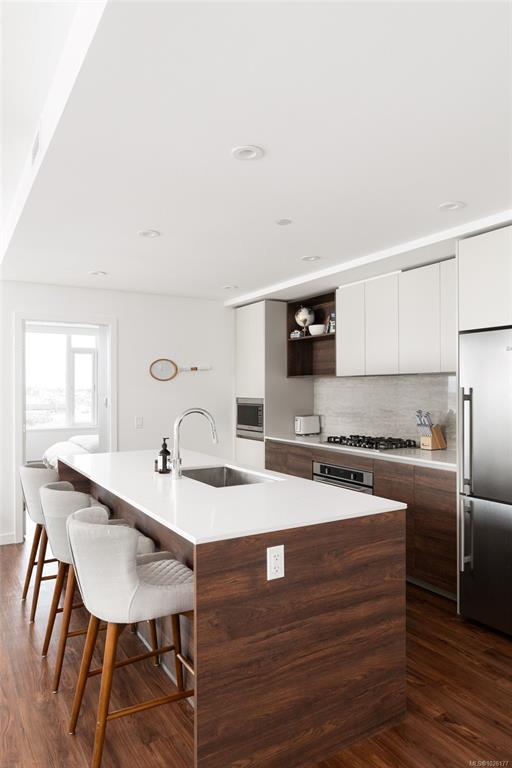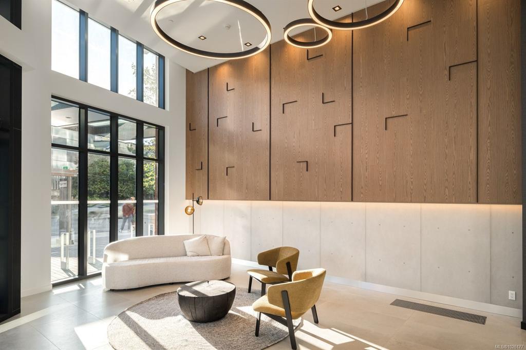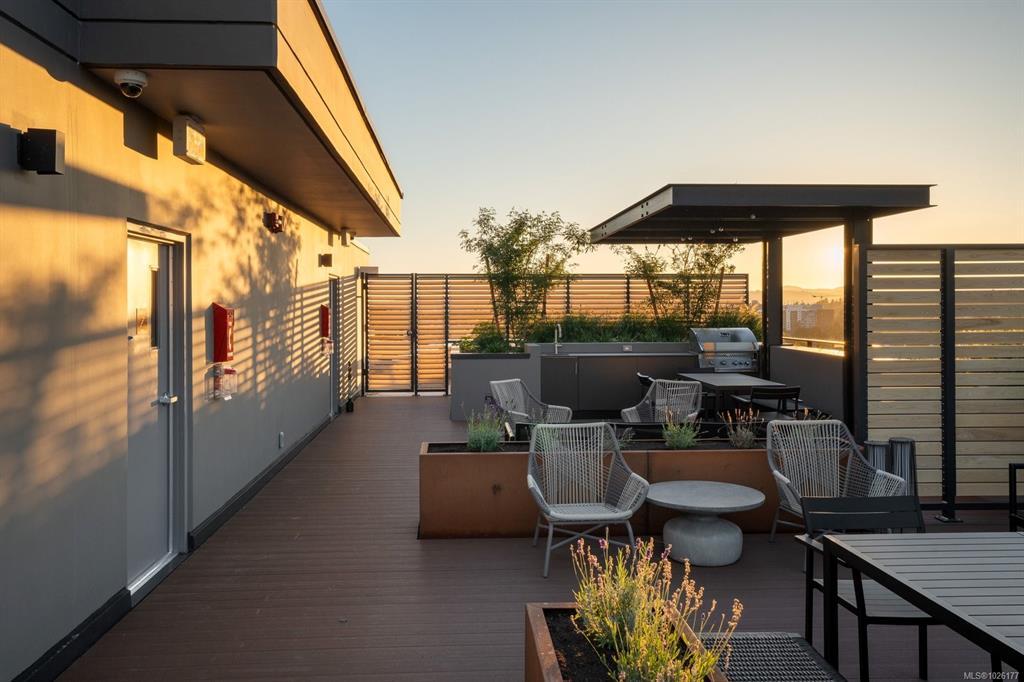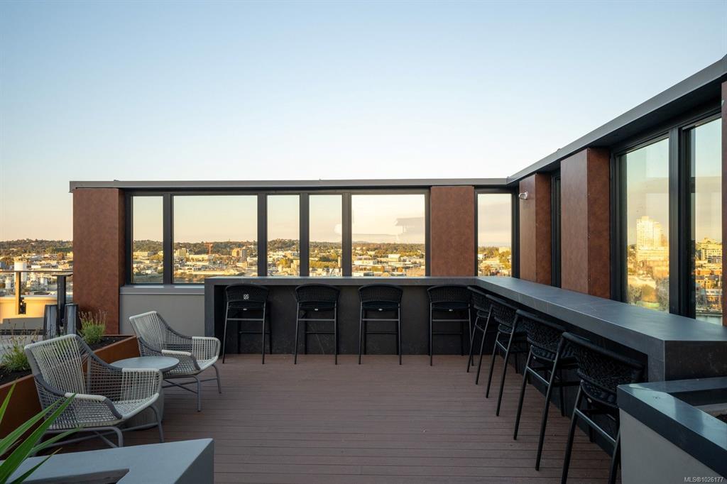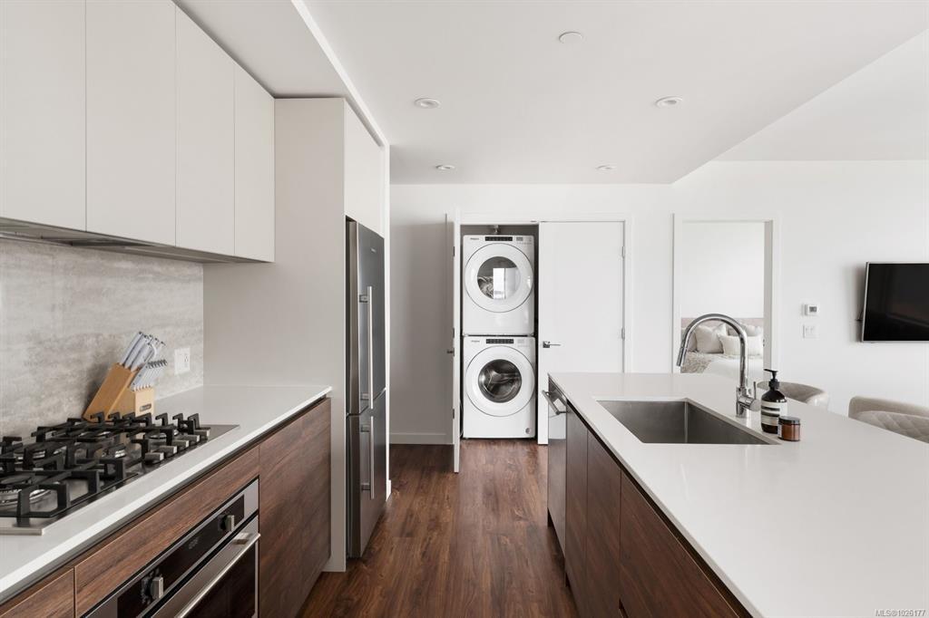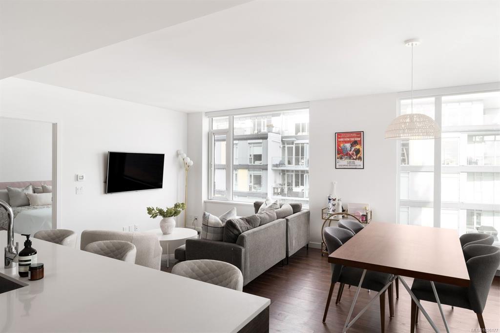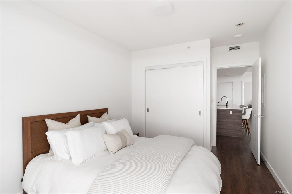 Sweeping ocean & downtown views from this corner unit on the 8th floor of 369 Tyee (Tower 1). This luxurious 2 bed/2 bath urban oasis in the heart of Vic West is thoughtfully designed with a perfect blend of modern living with sustainable features. Almost 1,100 sqft of open-concept living space, the kitchen boasts Stosa Italian cabinetry, sleek stainless steel appliances, quartz countertops, and a convenient breakfast bar. The primary bedroom is a tranquil retreat with a large ensuite & walk in closet. The 2nd bedroom is perfect for guests or office with amazing views of downtown. A large private patio overlooks the waterway, perfect spot for BBQ'ing & entertaining all summer. Storage space has not been overlooked, with plenty of closets to accommodate. Secure underground parking, separate storage & a bike room. Top it off with resident exclusive amenities - a lounge, fitness facility, pet wash, bike repair, and a rooftop patio to enjoy 360 degree views.