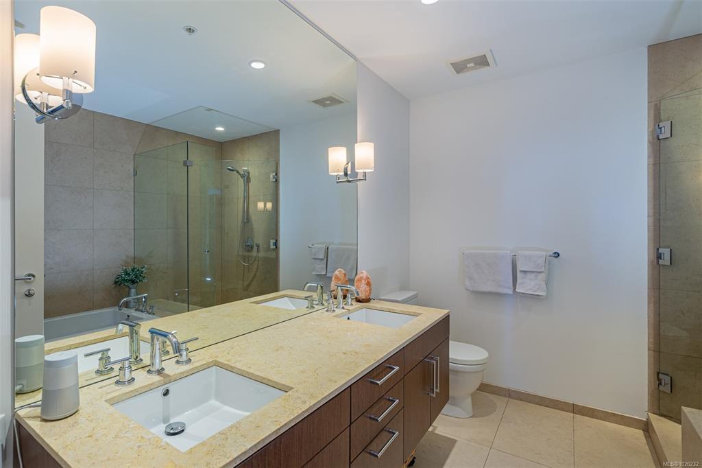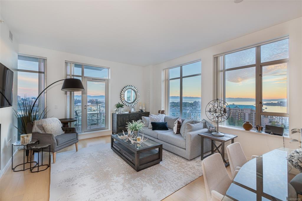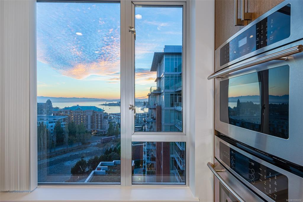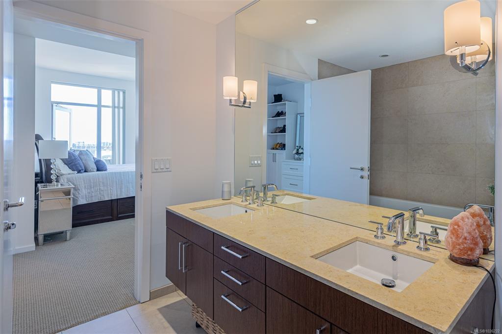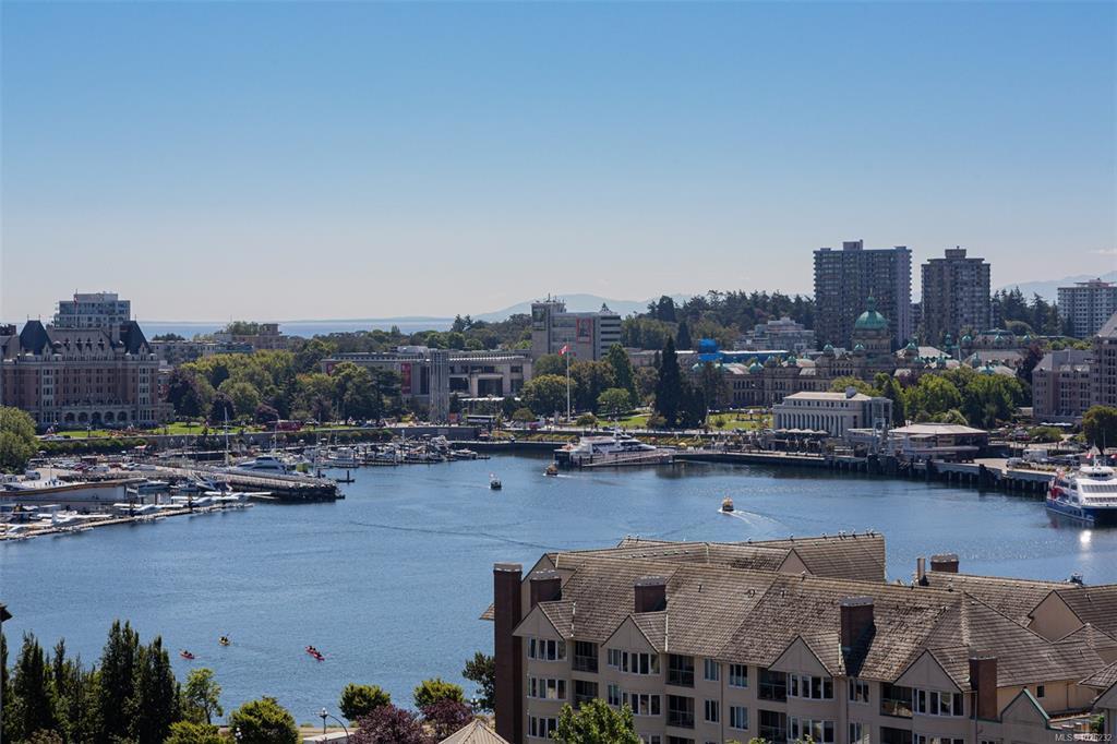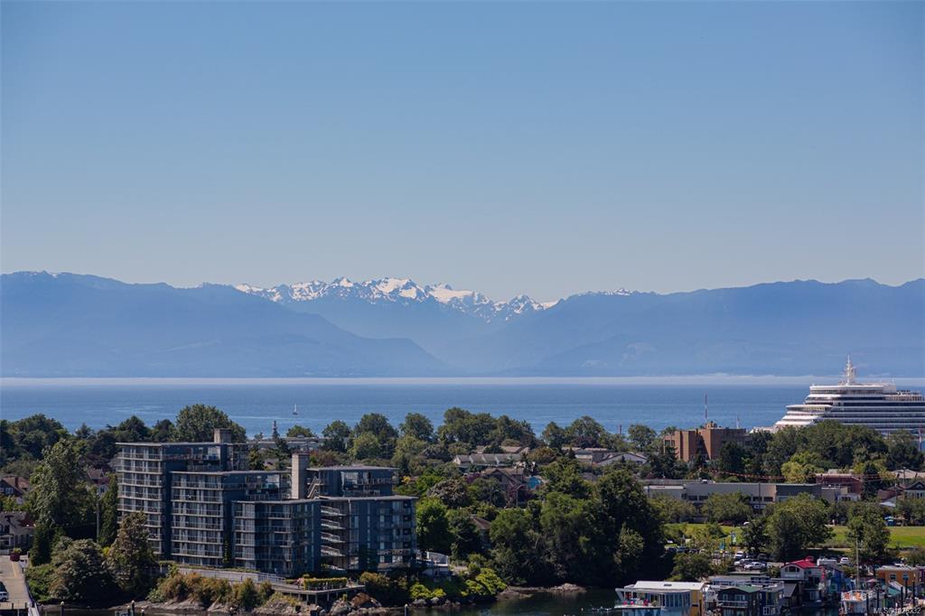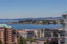 BAYVIEW ONE - subpenthouse- style, corner unit w/incredible southwest facing views across Victoria’s Inner Harbour to the Ocean & the Olympic Mountains. One of the city’s most coveted condo settings and quality concrete and steel bldgs offering executive amenities: owners’ lounge & BBQ area, fitness centre, hot tub, sauna/steam, boardroom, car wash, dog spa, guest suite, and concierge service. Entertain with ease from the designer kitchen complete w/upgraded appls incl. wolf gas stove, and a large island & dining area. Enjoy one of the building’s best balconies at sunset & the spacious layout featuring 10-ft ceilings, open-concept living and dining, and bedrm separation, both w/ full spa-inspired en-suites.