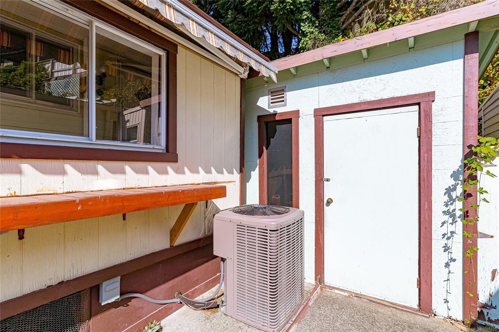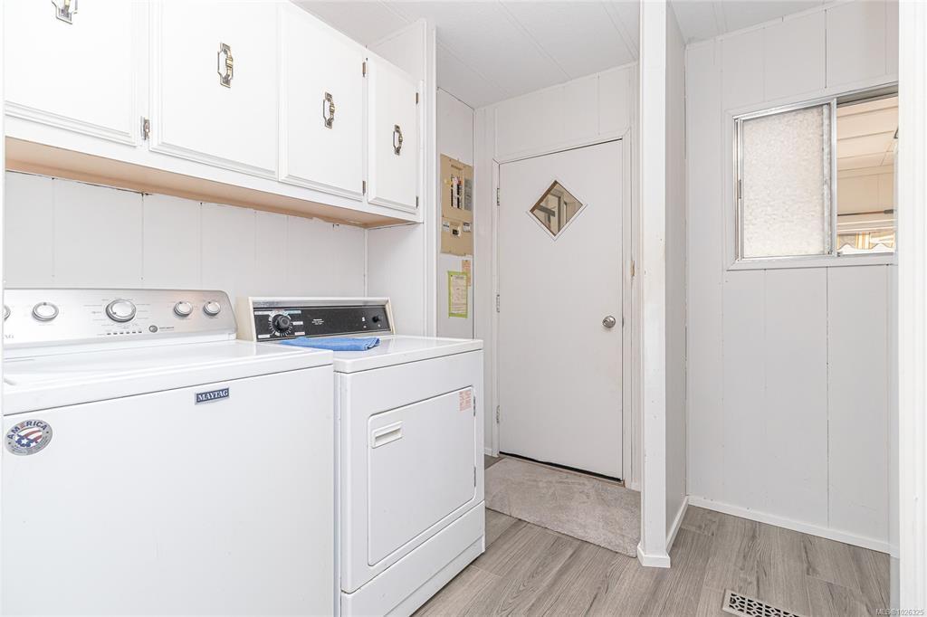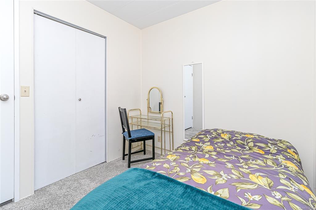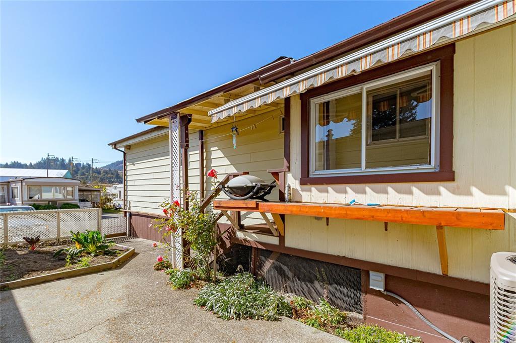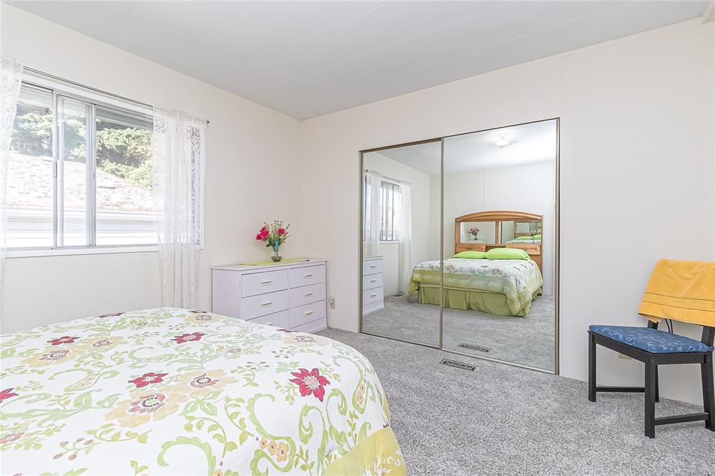 This lovely doublewide hosts a floor plan that includes 2 bedrooms and 2 bathrooms in the back and a good size kitchen with new countertops, livingroom and dining room at the front. Move in ready! Additional updates include some fresh paint, newer carpet in the bedrooms & living room and new flooring in the laundry room. Sunny, south facing and situated in popular Goldstream Mobile Home Park. Large, open living area attaches to the dining room with built in hutch. There is a large ensuite off the master bedroom which offers a double vanity, soaker tub and separate shower. Fenced yard with 8x11 wired workshop, and small garden area. Newer electric heat pump and furnace, newer hot water tank, sun guard window film on the front south facing windows. Both porches are enclosed for added storage. Some pets allowed. Monthly pad rent includes sewer, water, & garbage. The perfect setup to move in & enjoy - quick possession is available.