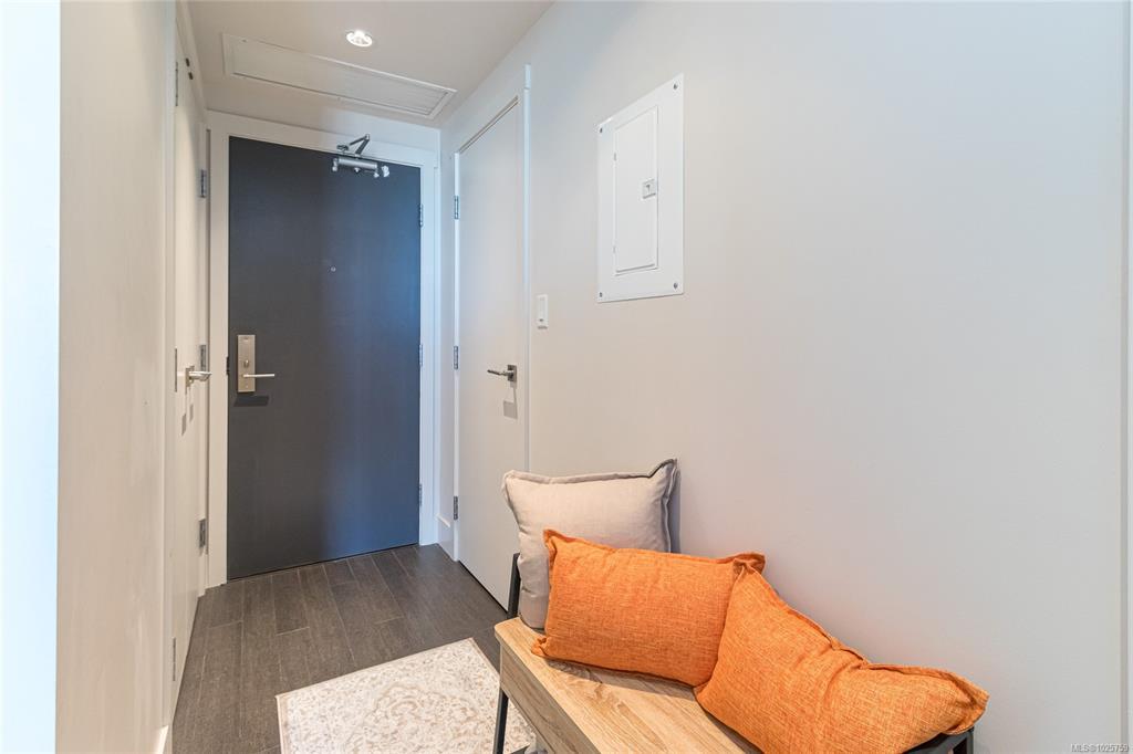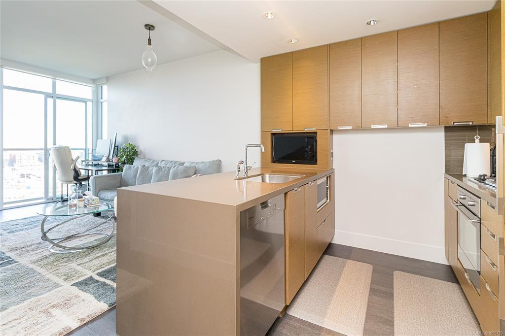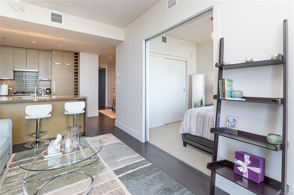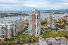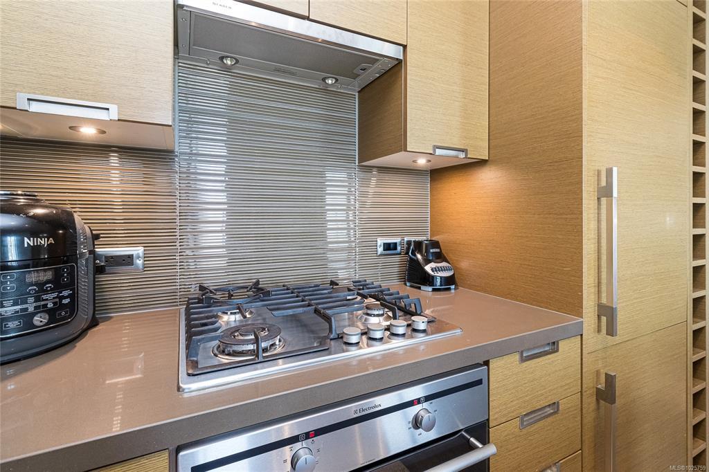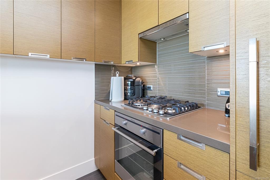 “Promontory” by Bosa where luxury & comfort come together. This well appointed condo offers designed living spaces, perfect for those seeking an urban lifestyle. The kitchen has high-end appliances incl. a gas cooktop, integrated Miele fridge/freezer, TV hook up & a stacking washer/dryer. Enjoy views of downtown & Inner Harbour from your private balcony, living room & bedroom. A generous in-suite storage room provides exceptional flexibility & could function as a private home office. Additional highlights include a secure underground parking stall, separate storage locker, bike storage & air conditioning. Resident amenities - an elegant lounge w/ kitchen & BBQ areas & a fitness room. Located just steps to downtown, Songhees Walkway & the Galloping Goose Trail. Pet-friendly living is enhanced by a nearby off-leash park, perfect for your four-legged companions.