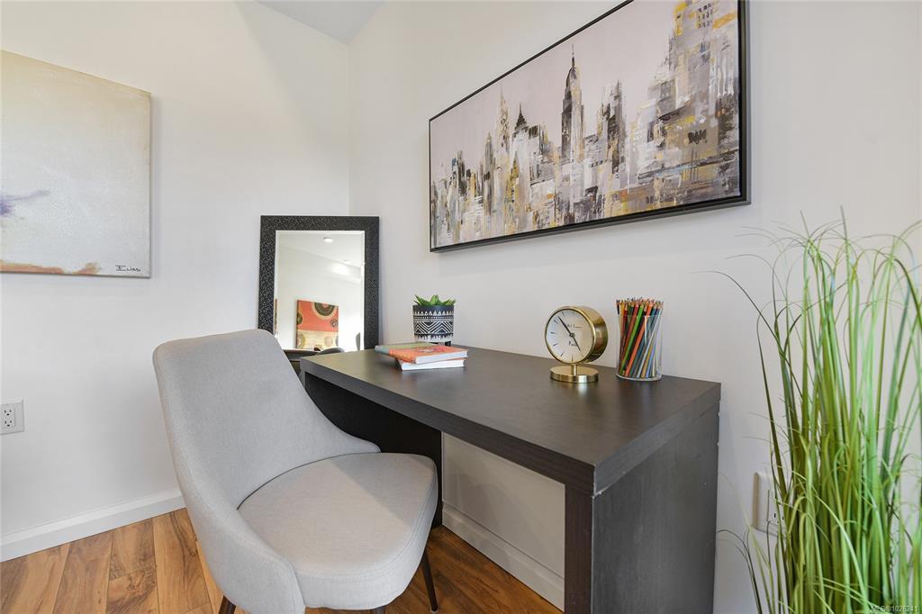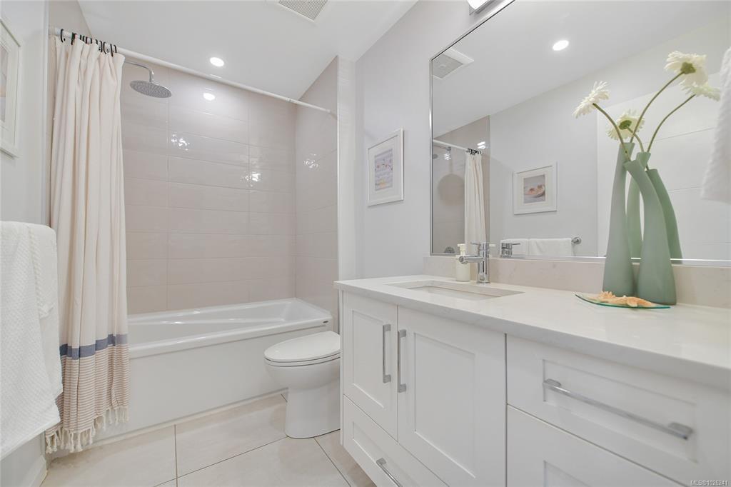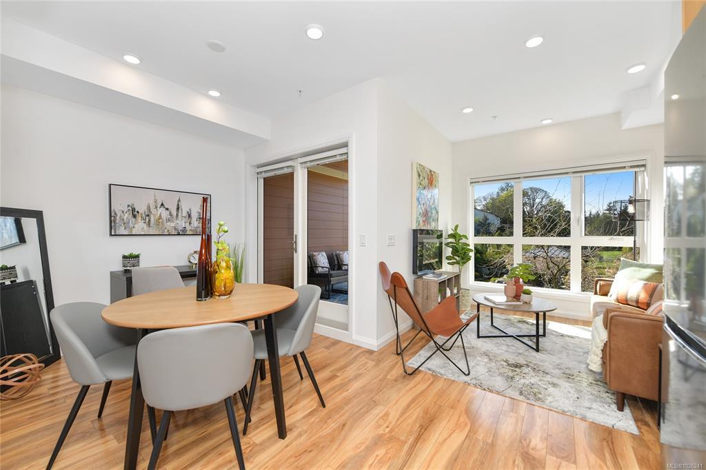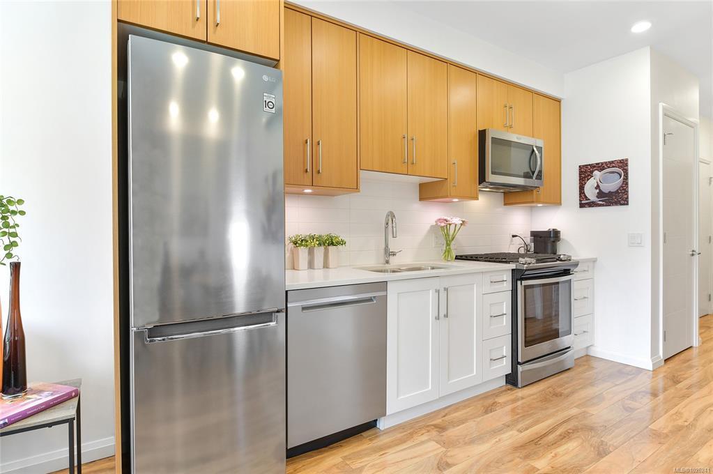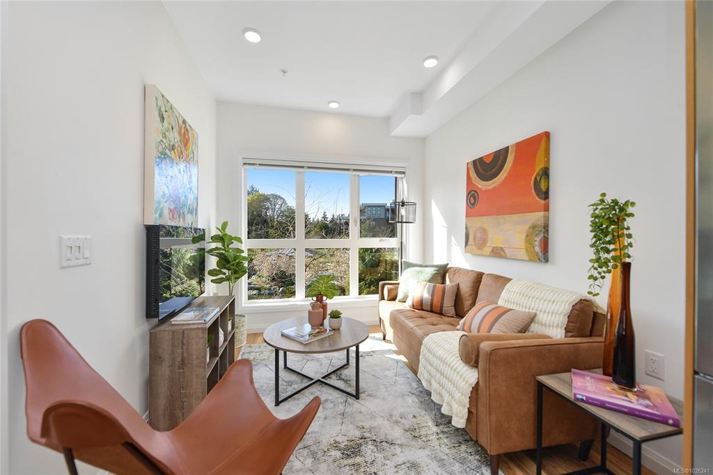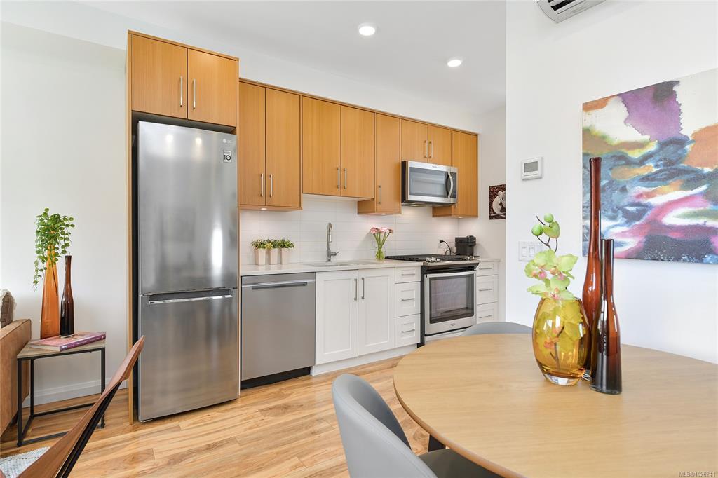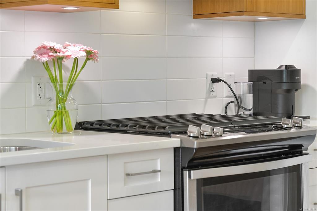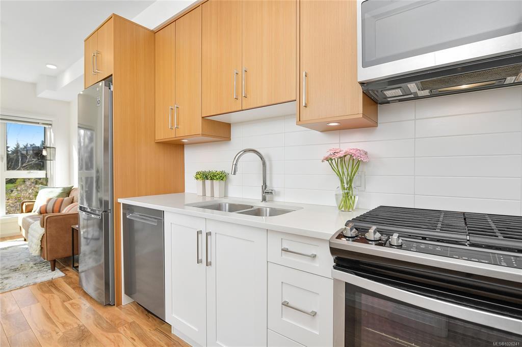 Welcome to your oasis of modern living in a highly sought-after award-winning Built Green Gold building! This pristine 1-bedroom, 1-bathroom condo boasts an inviting bright and airy ambiance. This home offers a sleek & modern kitchen with beautiful finishings, gas cooktop and SS appliances. The home is bright and airy filled with natural light. There is convenient in-suite laundry. Embrace the outdoors from your own covered balcony with a gas BBQ outlet, a perfect spot to sip your morning coffee or unwind after a long day. Outside, discover the beautiful maintained property grounds. This property comes complete with one parking stall and a storage locker and is also family-oriented and pet friendly. Conveniently situated within walking distance to Royal Oak Shopping Centre, bus exchange, Broadmead Village & Commonwealth Place, every amenity you need is just moments away. Don't miss out on the opportunity to experience living with unparalleled convenience. Schedule your viewing today!