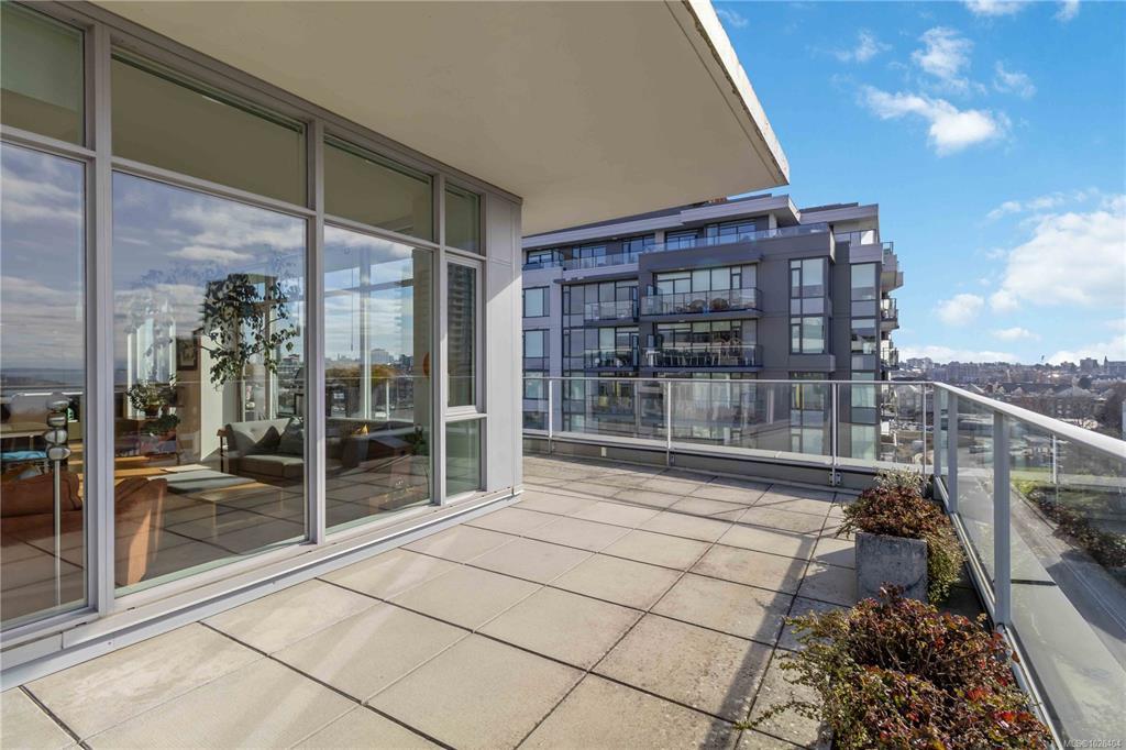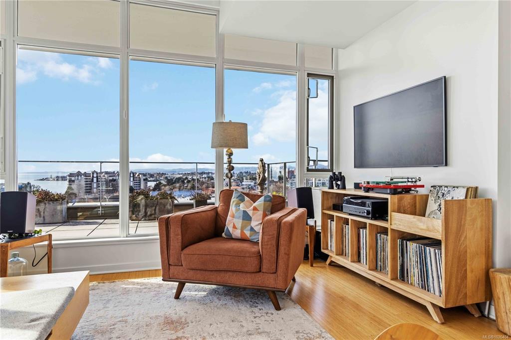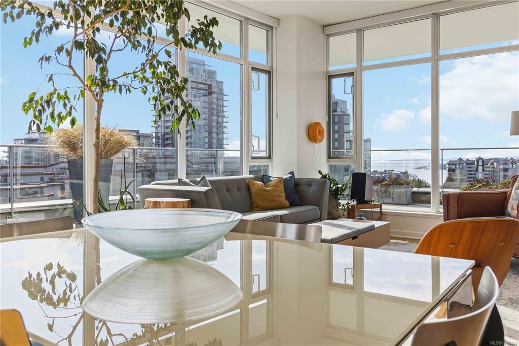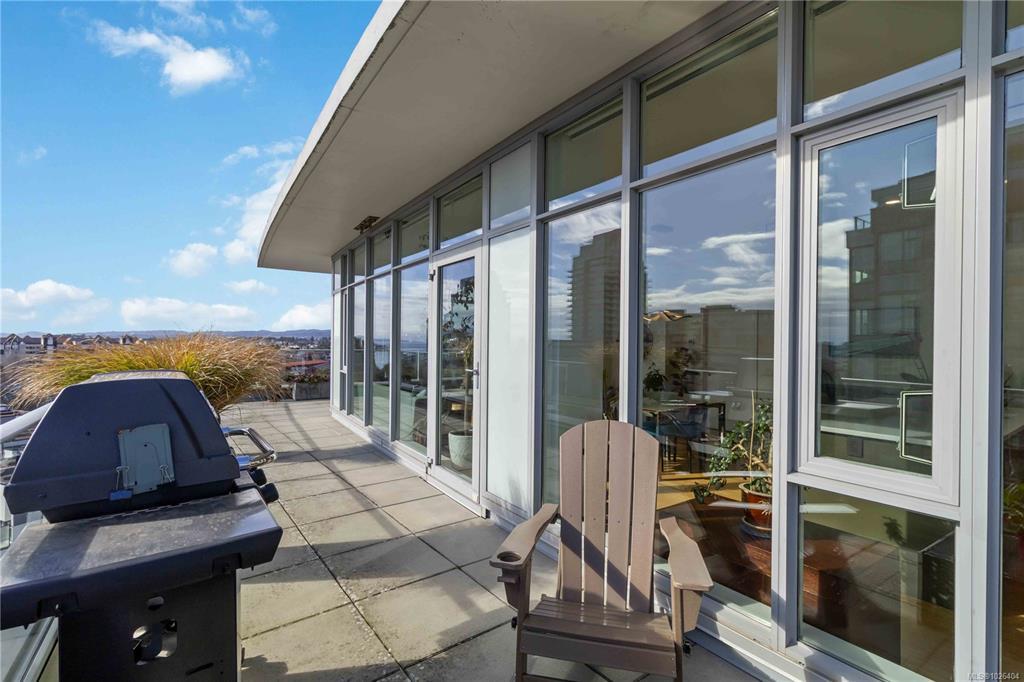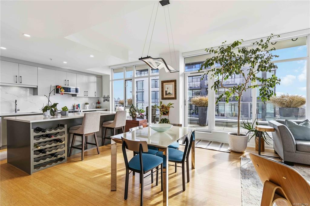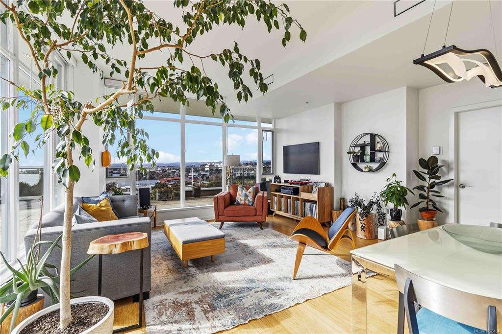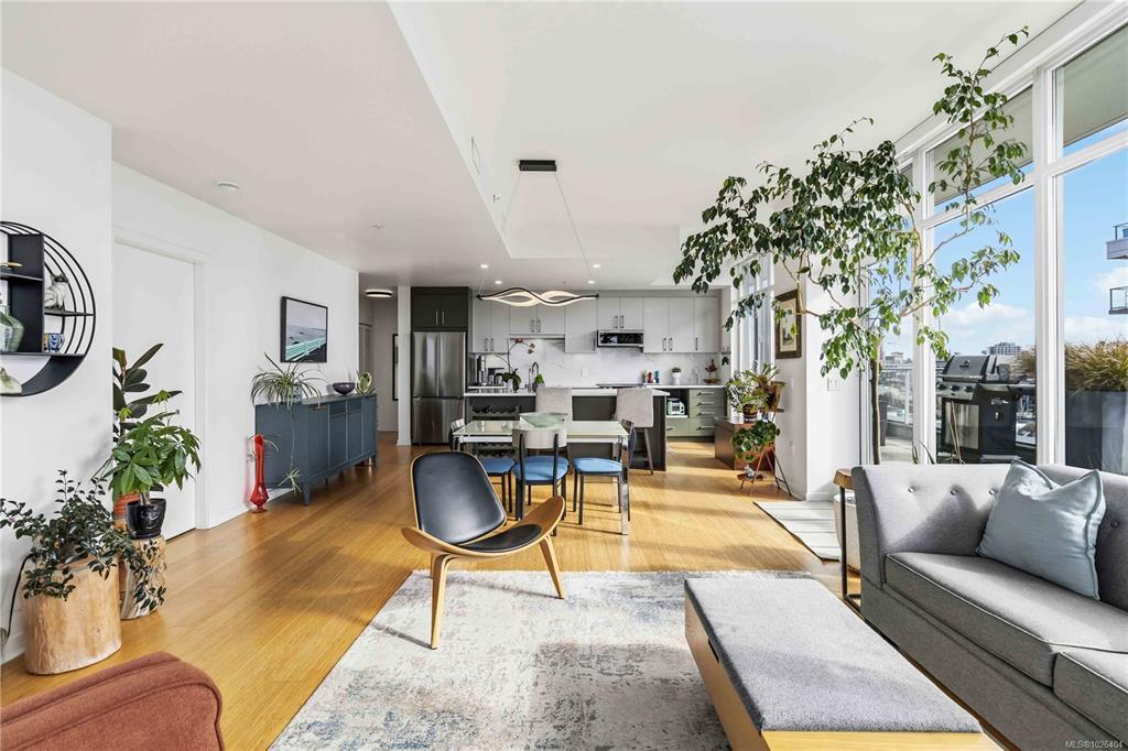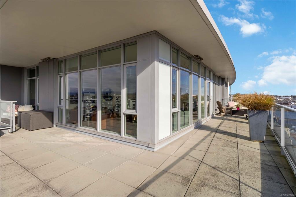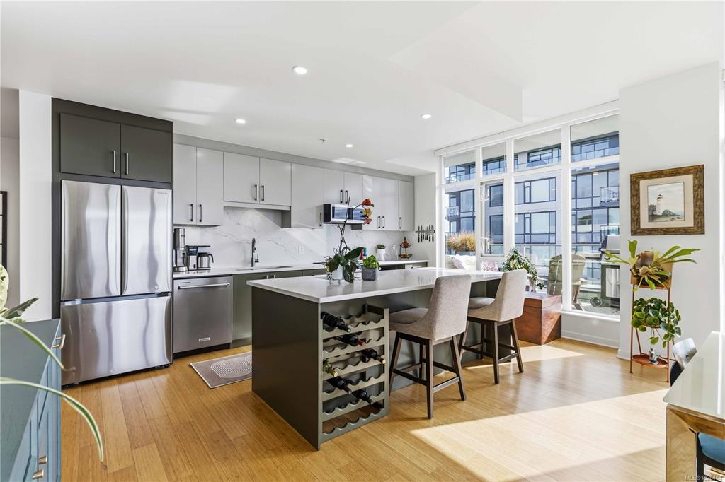OPEN HOUSE Sunday February 22nd, 1:00-3:00pm! Dockside Green Penthouse — a rare opportunity to experience premier urban living. Enjoy panoramic views from this SW corner suite in a sustainably built steel-and-concrete building. This sun-filled 1,253 sq. ft. condo offers exceptional outdoor living with a large wraparound deck & dedicated rooftop garden oasis. The stylish kitchen features solid-surface counters with matching backsplash, SS appliances & a large island for entertaining. Floor-to-ceiling windows brighten the open living & dining areas while framing the views. Two well-separated bedrooms both offer generous ensuites; the primary includes built-in closet space & the second features a Murphy bed for flexibility. Enjoy marine activity by day & city lights by night from this LEED Platinum–certified home. Steps to walking trails and an easy walk to downtown shops and restaurants. Two parking stalls, storage locker, kayak/SUP and bike storage included. All ages & pets are welcome.