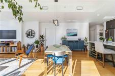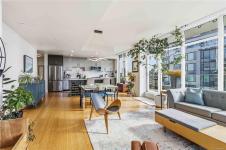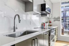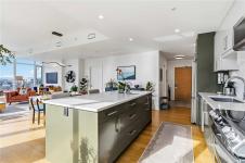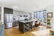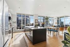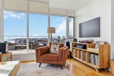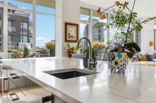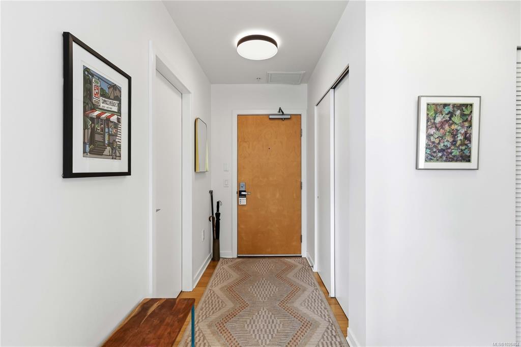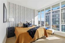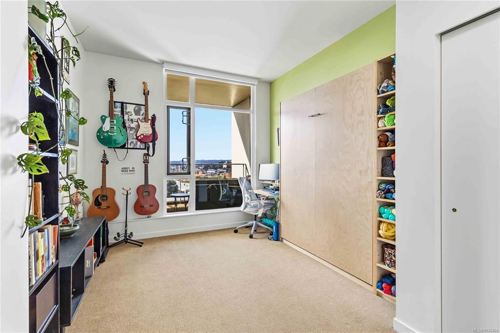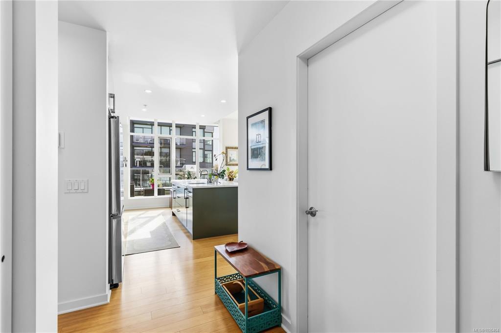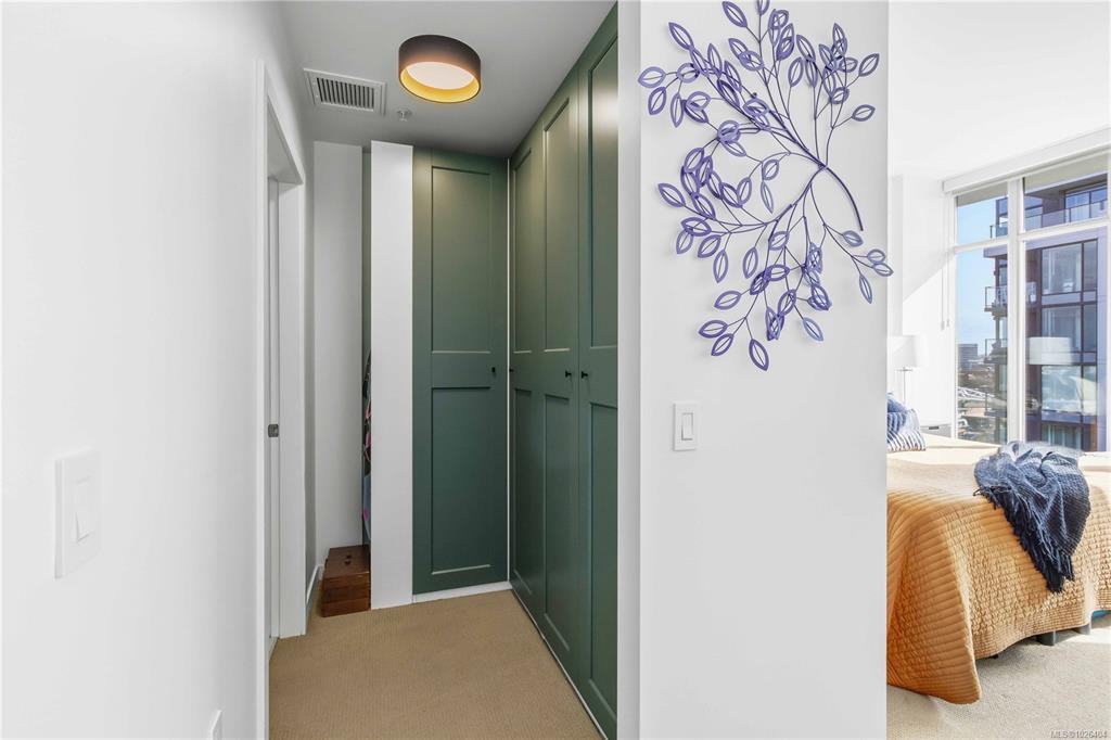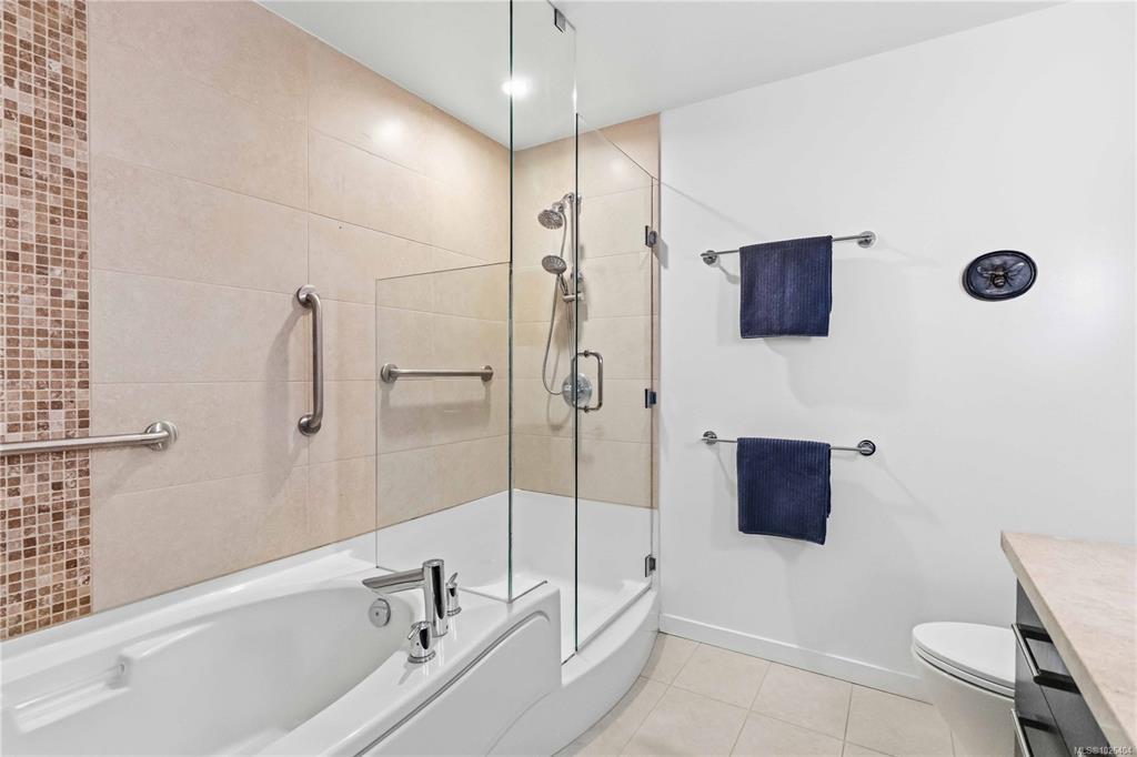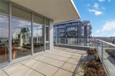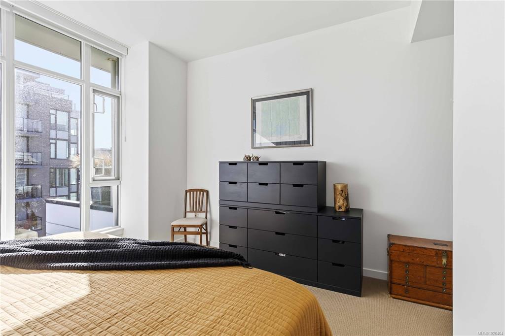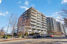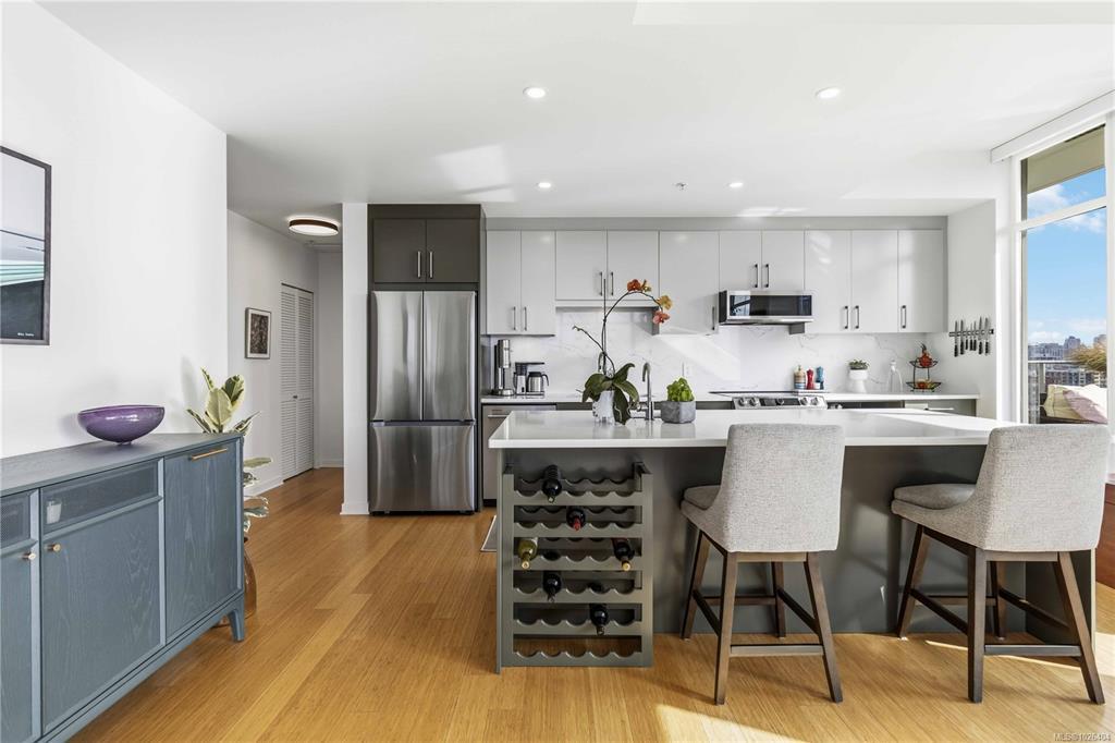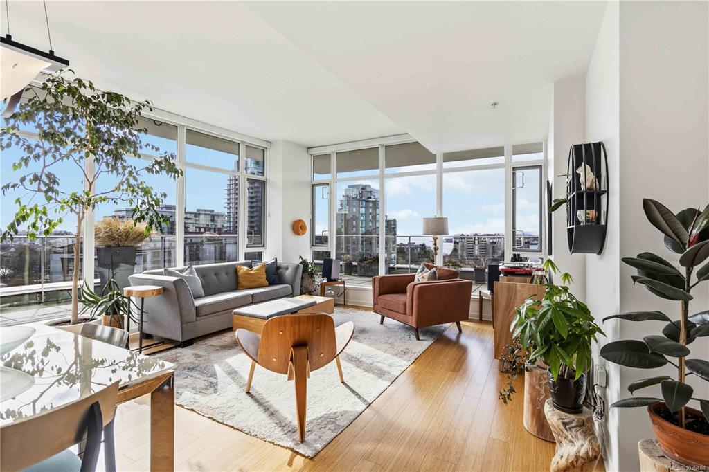 OPEN HOUSE Sunday February 22nd, 1:00-3:00pm! Dockside Green Penthouse — a rare opportunity to experience premier urban living. Enjoy panoramic views from this SW corner suite in a sustainably built steel-and-concrete building. This sun-filled 1,253 sq. ft. condo offers exceptional outdoor living with a large wraparound deck & dedicated rooftop garden oasis. The stylish kitchen features solid-surface counters with matching backsplash, SS appliances & a large island for entertaining. Floor-to-ceiling windows brighten the open living & dining areas while framing the views. Two well-separated bedrooms both offer generous ensuites; the primary includes built-in closet space & the second features a Murphy bed for flexibility. Enjoy marine activity by day & city lights by night from this LEED Platinum–certified home. Steps to walking trails and an easy walk to downtown shops and restaurants. Two parking stalls, storage locker, kayak/SUP and bike storage included. All ages & pets are welcome.