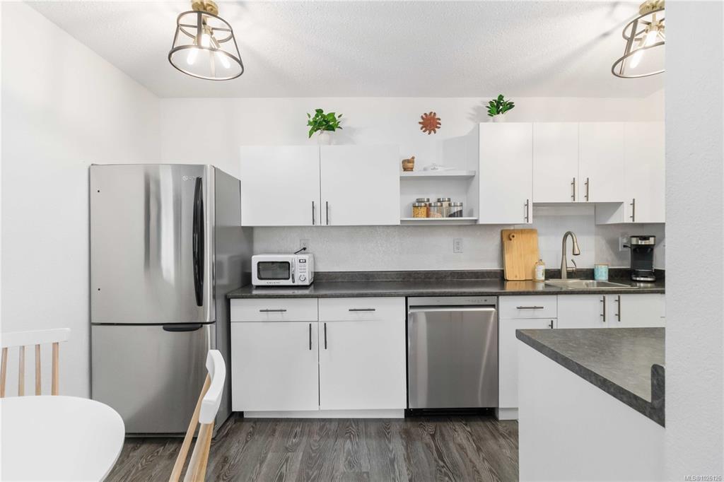 Top-floor, sun-drenched 1-bed, 1-bath condo—bright, beautifully updated & filled with natural light. Fresh paint, modern kitchen appliances, updated lighting, closet doors & more make this well cared for home truly move-in ready. The thoughtfully designed layout maximizes every square foot, while the balcony offers the perfect spot to enjoy your morning coffee in the sunshine. Eldon Place is a professionally managed, pet and rental friendly building with outstanding amenities: heated indoor pool, hot tub, sauna, gym, recreation room with pool table and darts, hobby workshop, secure bike storage, EV charging, ample guest parking & shared laundry. Ideally located just minutes to Uptown, Mayfair Mall, parks, playgrounds, the Galloping Goose Trail, transit & downtown. Perfect for first-time buyers, downsizers, or savvy investors seeking low-maintenance, light-filled living with everything at your doorstep. Includes dedicated parking and generous in-unit storage. Simply move in and enjoy.