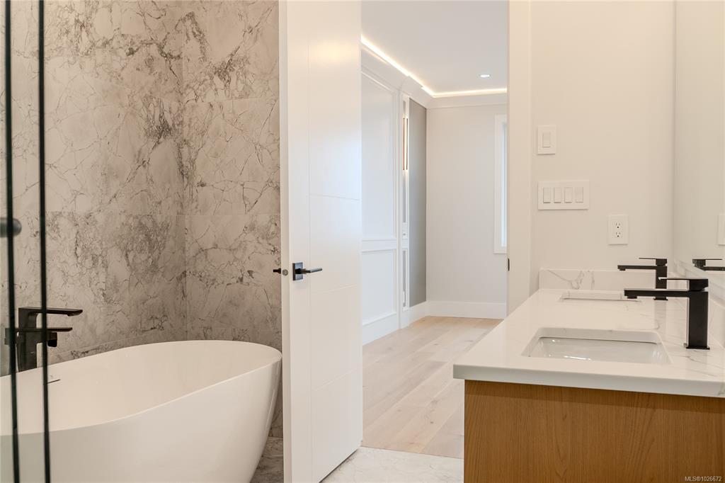 legal Suite... Panoramic Ocean Views! Wake up every morning to sweeping vistas of coastal mountain ranges and charming small islands. This home was thoughtfully designed for a low-maintenance, lock-and-go lifestyle. The main level features a bright, open-concept kitchen with a spacious dining area, flowing seamlessly into the ocean-view living room with a cozy fireplace—perfect for relaxed evenings at home. The primary suite offers stunning ocean views, a walk-in closet, and a private ensuite. A second bedroom provides flexibility for guests or a home office. Completing the main floor is a double-car garage. The middle level continues to impress with a theatre room or potential home gym, three additional bedrooms, two full bathrooms, and a generous living area. The lower level offers a fully self-contained one-bedroom suite with a separate entrance—ideal for generating revenue or accommodating extended family. The suite includes a kitchen, family room, bedroom, four-piece bathroom.