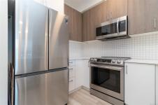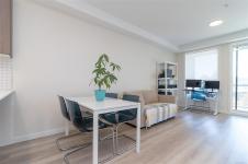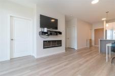 The thoughtfully designed open-concept layout creates a seamless flow between the kitchen and living area, making the space feel airy and inviting. The modern kitchen features stylish two-tone cabinetry, quartz countertops, and a stainless steel appliance package. The dining area looks over the bright living room with an electric fireplace and enjoys beautiful views through the balcony doors allowing you to sit at the table and take in the scenery while you dine. Ideal for hosting.