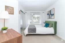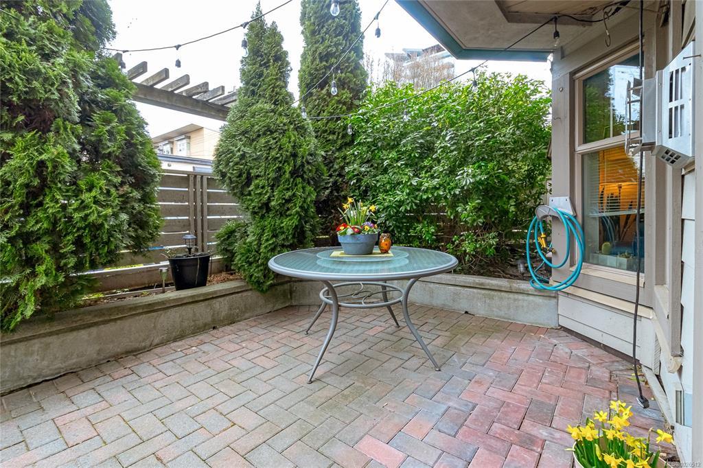 Bright & spacious 2 bed, 2 bath corner unit in the heart of downtown. The entry leads into a generous living room anchored by a newer gas fireplace, creating a warm and inviting space to relax or gather with friends. The separate dining area is ideal for hosting & flows seamlessly onto an exceptionally large, interlocking brick patio surrounded by greenery. The kitchen features stainless steel appliances, modern quartz countertops & ample storage. The spacious primary bedroom offers an escape with a private ensuite complete with a tub and updated quartz vanity. The second bathroom is just as updated with a shower instead. The additional bedroom includes a custom Murphy bed with a built-in desk, providing excellent flexibility for guests or a bright, practical home office. The laundry room has additional storage. Complete with secure parking and a storage locker, this pet-friendly building welcomes a larger dog and/or cats. All just steps to restaurants, cafés, shopping & amenities.