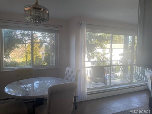 Bright two bedroom unit in a great central location! This home is a corner unit on the second floor offering two bedrooms, a four piece bath, a bright and airy living room and dining area overlooking green space and a good sized in unit storage space. There is one parking stall included, and ample visitor parking. The central location is convenient to everything - close to VIU and on a main bus route and walking distance to pubs and stores. Within the complex, you're tucked up on the hill away from the noise of any traffic with green space on three sides. With newer windows and newer flooring, this unit is move in ready and great for a first home or as an investment. This strata allows pets & rentals, has no age restrictions, and the monthly strata fee includes heat and hot water! Measurements are approximate - please verify if important