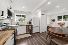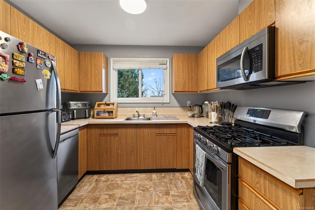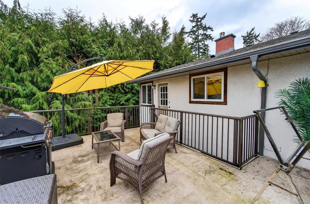Charming and versatile home in a central location, featuring a well-designed in-law suite ideal for extended family or added flexibility. The main floor offers 2 bedrooms, a full 4-piece bath, and a bright living space highlighted by a brick-encased fireplace. The kitchen is equipped with stainless steel appliances, and the layout flows seamlessly to a generous deck overlooking the flat, sunny southeast-facing fenced yard. Downstairs, the in-law suite provides a separate entrance and comfortable living space. Recent improvements include a 200-amp electrical service upgrade, new gables, new gutters, updated appliance, and a new hot water tank. Outdoor features include a lower stone patio, and storage shed. Conveniently located near Panama Flats, Swan Creek Park, the Galloping Goose Trail, Tillicum Shopping Centre, and schools, this home offers excellent lifestyle and location appeal.