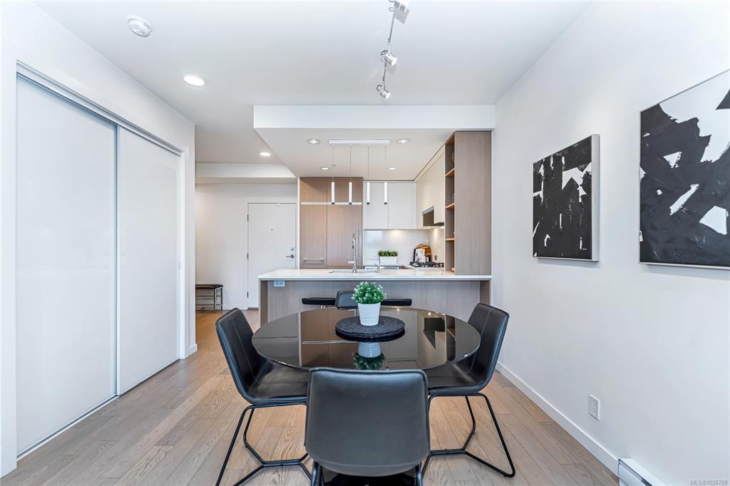 Bright and efficient 1 bed + den condo offering 620 ft² of well-designed living space in a highly desirable, walkable location. Ideal for first-time buyers, investors, or professionals, the open-concept layout creates seamless flow between the kitchen, dining, and living areas. The kitchen features quartz countertops, stainless steel appliances, modern cabinetry, and updated lighting. A versatile den provides ideal space for a home office or guest area, while the spacious bedroom offers generous closet storage. The well-appointed bathroom is finished with sleek tilework and a soaker tub. Secure underground parking and separate storage are included. Building amenities include an outdoor patio with fire pit and BBQ, bike storage, and dog wash station. Steps to cafés, restaurants, boutiques, and transit, this centrally located condo delivers exceptional value and lifestyle in one of Victoria’s most convenient neighbourhoods.