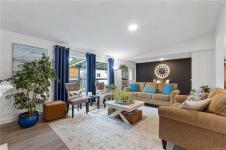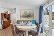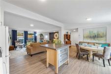 The showpiece designer kitchen offers premium finishes, custom cabinetry, and a versatile mobile island, all flowing into a bright dining area with vaulted ceilings. The spacious primary bedroom includes two closets and a large ensuite.