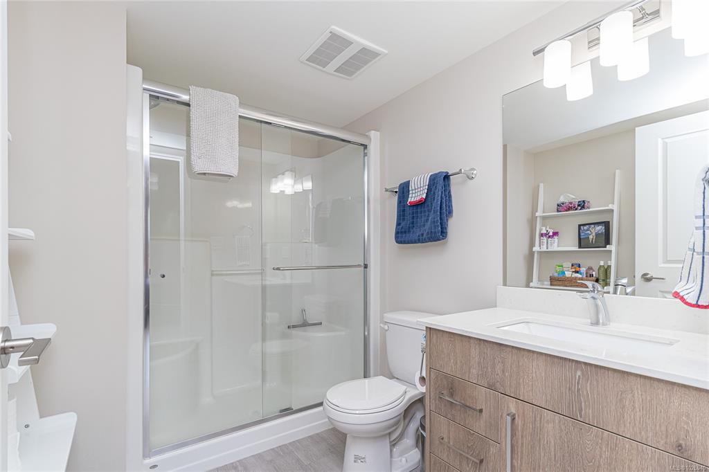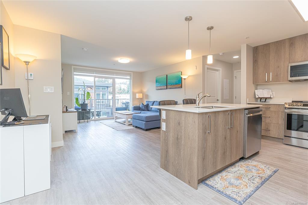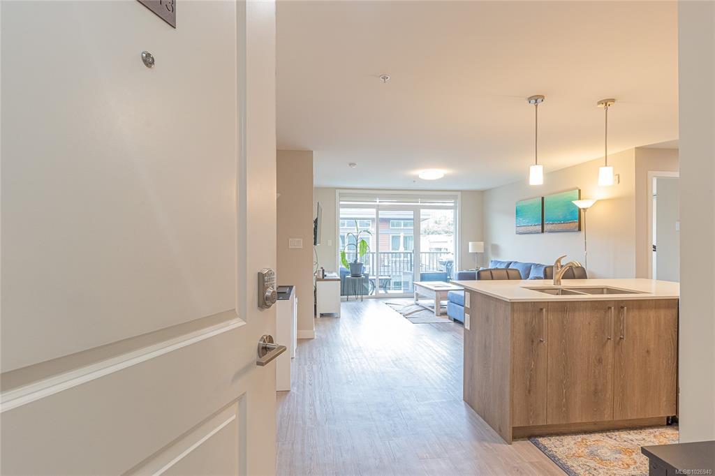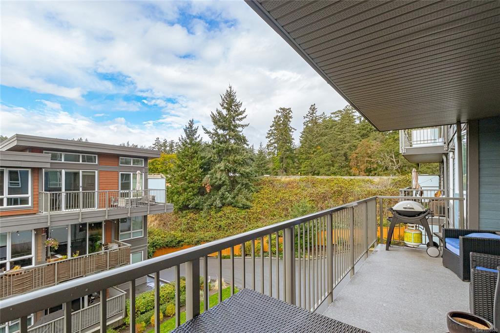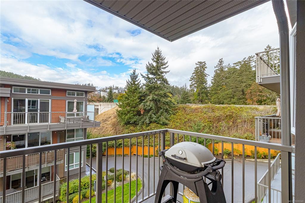 OH SAT FEB 28th 1-3 pm. Discover Thetis Lakeside! Highly desirable development (2019) perfectly positioned just steps from expansive green space. This bright 2 bed/2 bath unit features a spacious & split-bedroom layout & a new (Feb 2026) spa-inspired ceramic tile walk-in shower in the primary ensuite. The open-concept main living area includes a kitchen w/ a stone countertop central island, stainless steel appliances & plenty of cabinets & prep space. Oversized windows fill the living area w/ natural light & a sun-soaked west-facing balcony offers views of Mill Hill & beyond. The interior showcases light-toned finishes & vinyl plank flooring creating a warm & contemporary space. Custom Murphy Wall bed in 2nd bedroom. Generously sized storage on the same floor, secured underground parking & within proximity to the Galloping Goose & E&N bike paths, The Nest Café & Six Mile Pub. Building amenities include bike/kayak storage & a fenced dog park. Pet-friendly with no size restrictions!