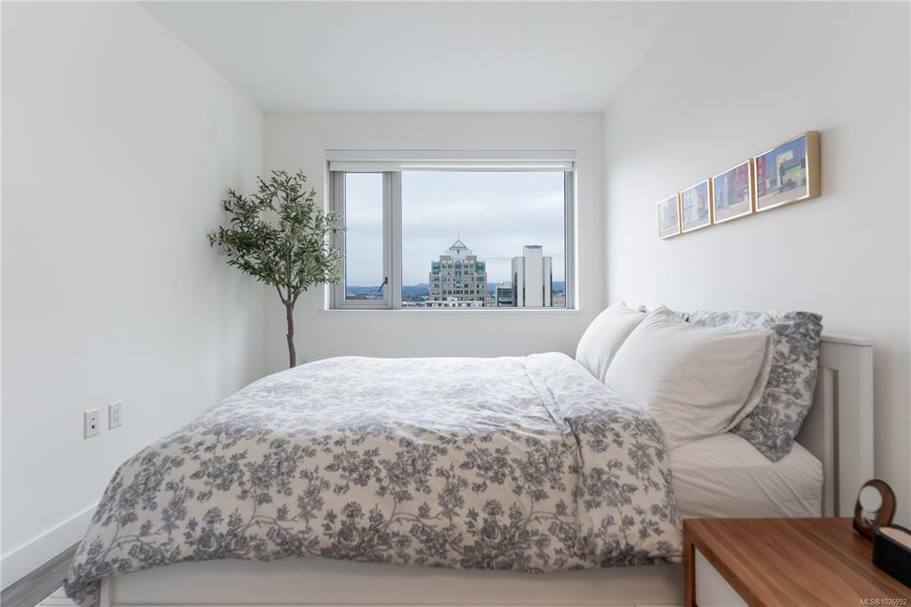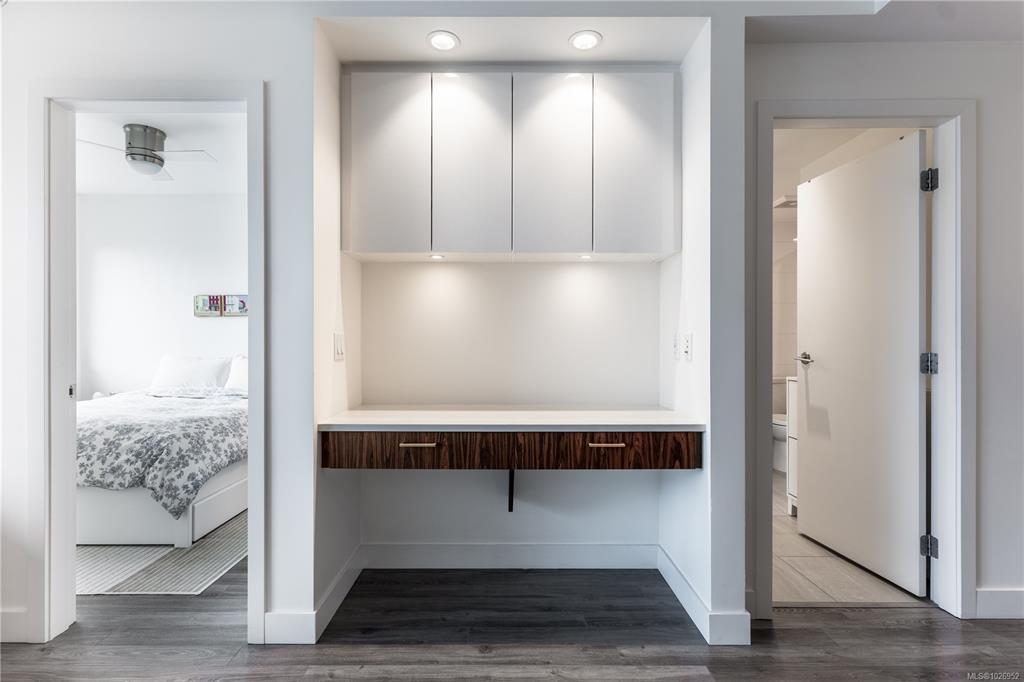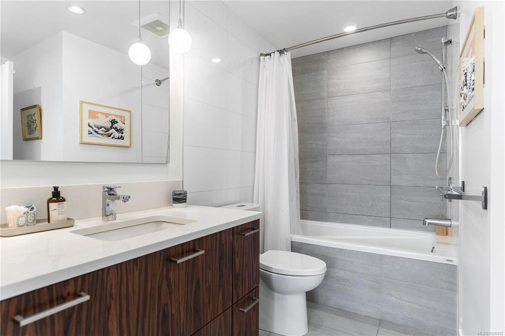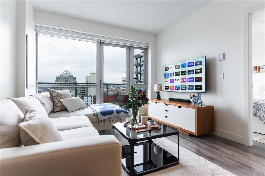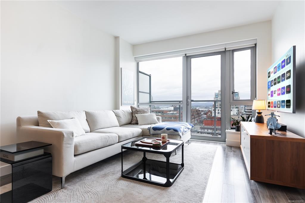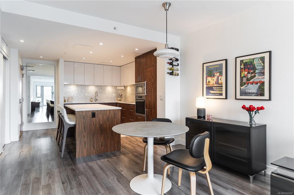 West-facing sunsets from the 8th floor define Unit 801 at The Escher, a home that feels distinctly a cut above the typical downtown condo. This larger one-bedroom has an ideal layout with perfect proportions and natural light. Walking through, it’s obvious it is well cared for - the space feels fresh and effortlessly turnkey. The kitchen is larger than standard, anchored by a generous island, integrated appliances, and ample storage - nothing here feels undersized. Floor-to-ceiling windows frame warm afternoon light, ocean and Inner Harbour views, and the character of Victoria’s brick façades. Heated tile floors, in-suite laundry, secure parking, and storage included. Quietly positioned on the edge of downtown, you’re removed from the busyness yet steps to the Royal Theatre, Discovery Coffee, restaurants, parks, and the waterfront.