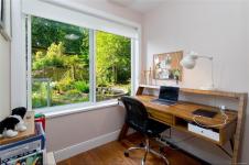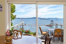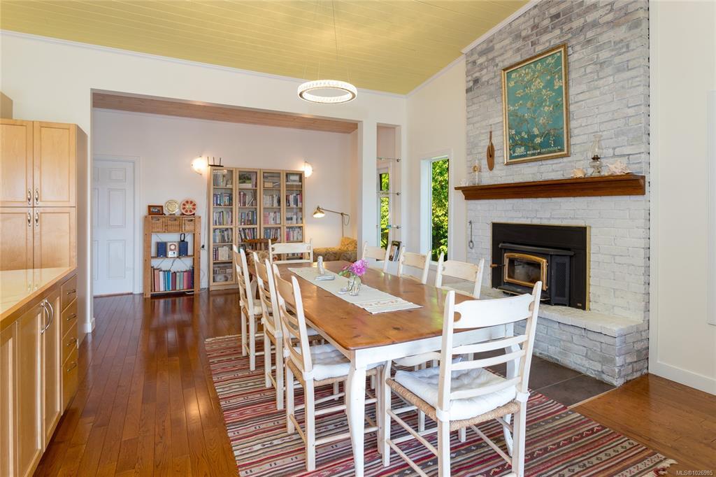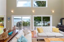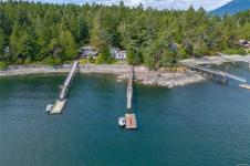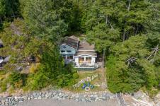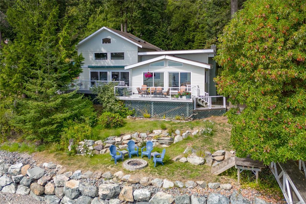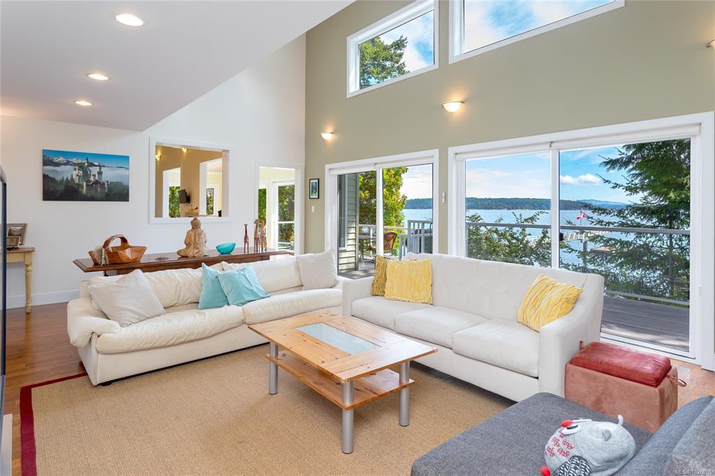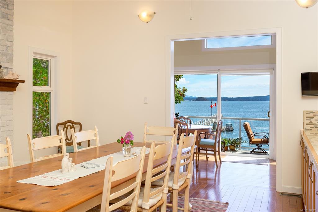 Nestled on a sunny, half-acre parcel of low-bank oceanfront, this 2-bed + den, 2-bath home is just a 5-minute boat ride from Sidney. With nearly 2,400 sqft of living space, vaulted ceilings & large windows showcase stunning views of Mt Baker and active marine life, seals, eagles & orcas. The main floor features an open-concept kitchen, dining, and great room with a cozy propane fireplace, perfect for storm-watching or gathering with friends. The primary bedroom & ensuite is on the main level. A home office adds flexibility for remote work or creative pursuits. Upstairs is the 2nd bedroom with walk-in closet. A new retaining wall frames the oceanside firepit, ideal for stargazing & storytelling. The private dock offers front-row views of the Salish Sea, while a gently sloping path leads to a quiet beach for kayaking, paddleboarding or sunbathing. A 329 sq.ft. workshop adds space for hobbies or storage. Modern comforts include a heat pump, vinyl windows, and city water.
