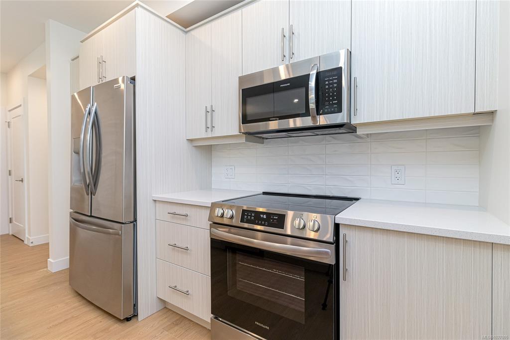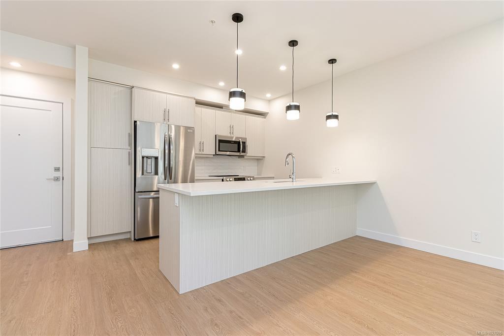 Introducing The Boardwalk, a modern collection of 24 spacious residences, now move in ready. Walk to EVERYTHING!! Incredible location on a quiet street across from the new Belmont Market with Westshore Town Centre to the east & Langford Centre to the north. Suites feature something rare in today’s market...SPACE, averaging approximately 1000 sq.ft. per 2-bedroom suite, oversized sundecks that can handle a table and 4 chairs + BBQ plus bonus extra sound insulation in bedroom common walls & floors. Inside you'll find thoughtful spacious designs with 9' ceilings, a beautiful kitchen with quartz countertops & a stainless-steel appliance package. There’s a gorgeous Fireplace set in an accent wall, tiled entry & durable laminate wood flooring. The building features a welcoming grand tile foyer, interior storage lockers & convenient fenced dog run play area, as well as secured parking with video surveillance security & ample secured bike storage. Some pets & rentals allowed.