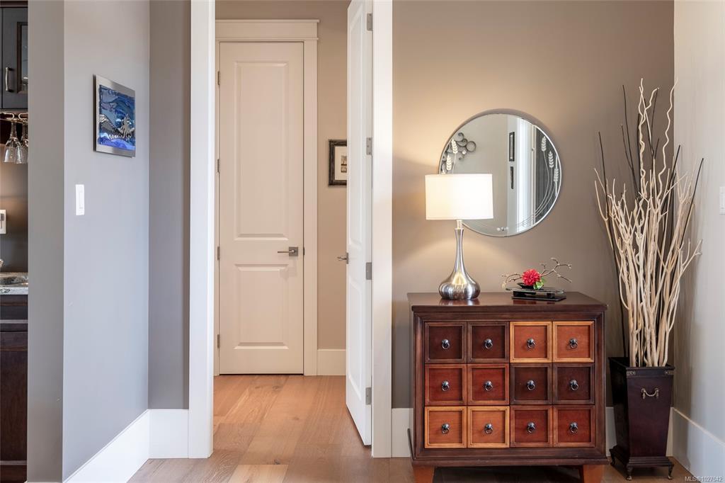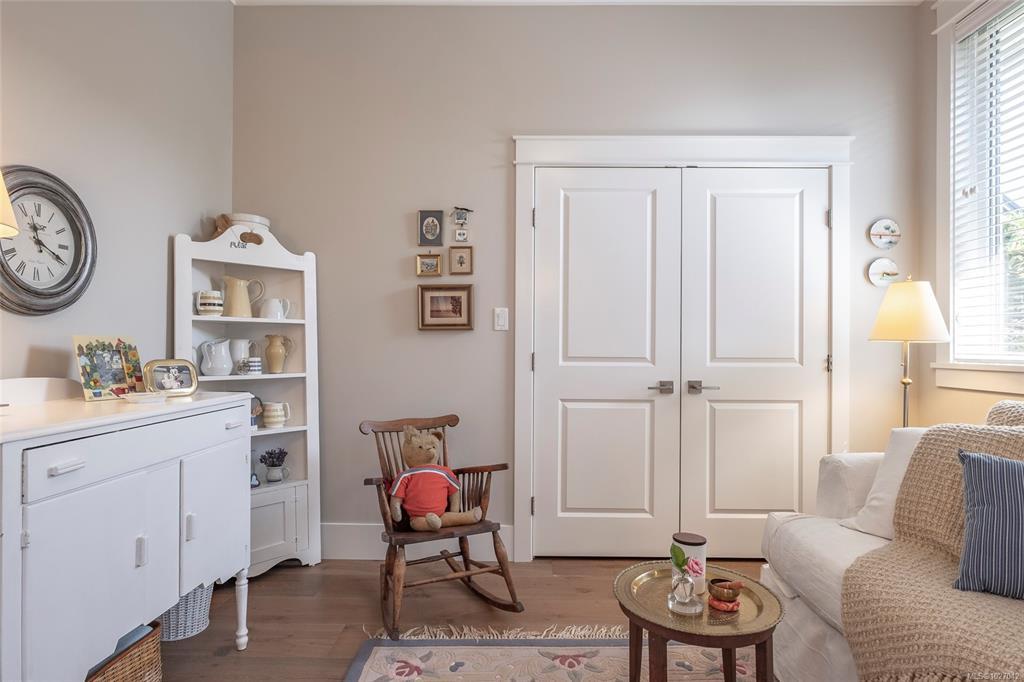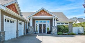 This exquisite custom-built rancher, completed in 2016, is nestled in an exclusive enclave of charming homes just steps from the beach. Boasting meticulous craftsmanship and high-end finishes, this residence offers luxury and comfort. Upon entering, you are greeted by an expansive open design with 11-foot ceilings. The chef's kitchen features a gas cooktop, double ovens, built-in microwave, an instant hot water tap, and a garburator. The home includes three spacious bedrooms and 2 ½ baths, with heated floors in both full bathrooms. For entertaining, there is a bar area with a wine fridge and a living room with a built-in entertainment center. Hardwood and ceramic floors add sophistication. The private garden offers sunny exposure and a sprinkler system. Additional features include HRV, a variable-speed heat pump, fire suppression sprinklers, hot water on demand, central vacuum, an oversized double garage, a garden shed, and phantom screens. 75" TV in living room included in sale.