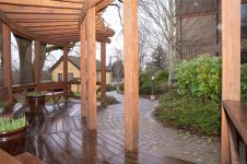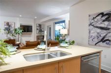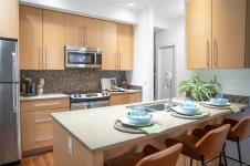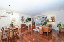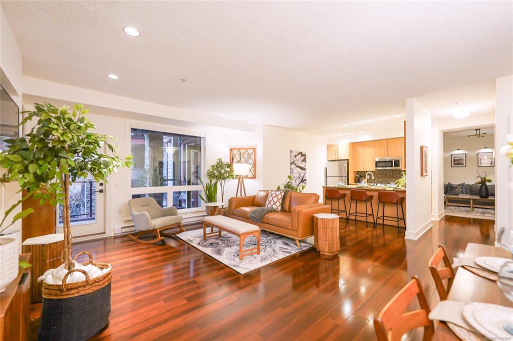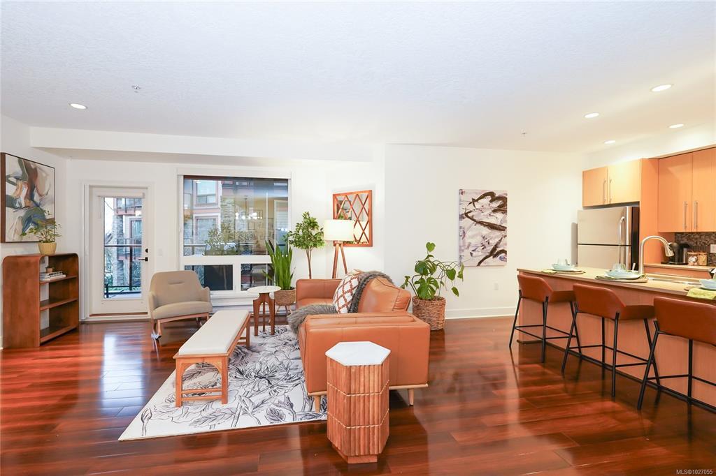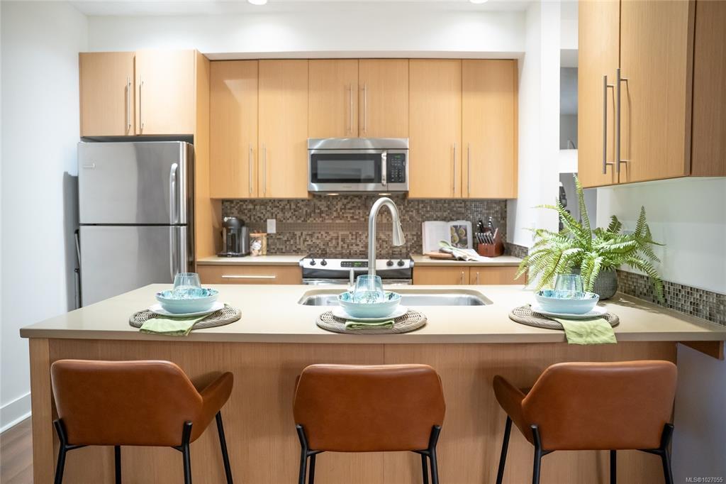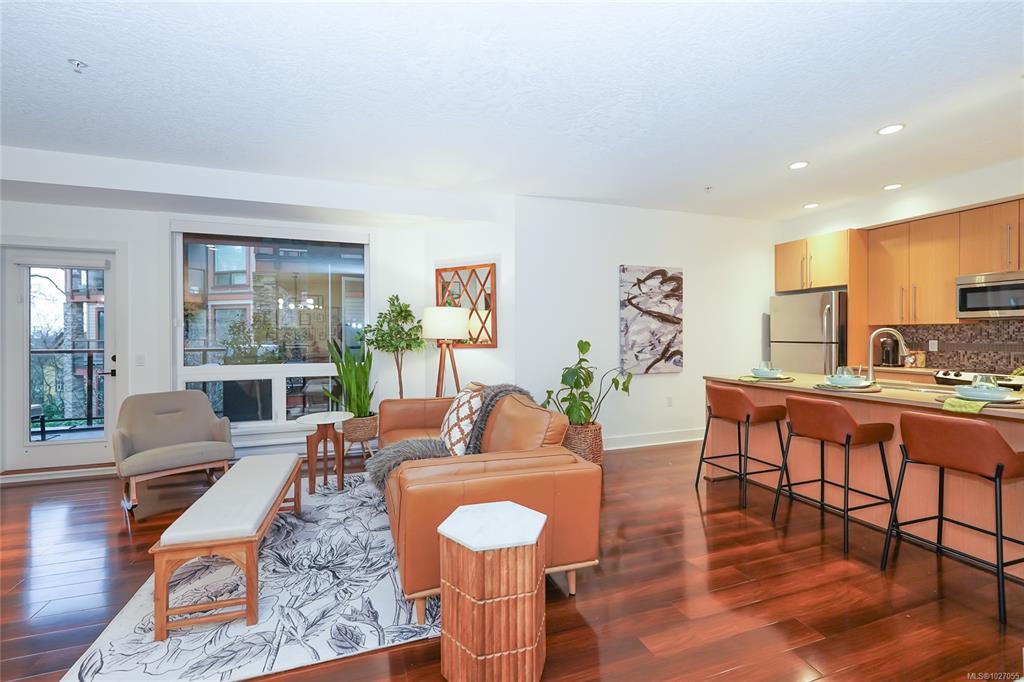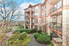 This spacious 2bed 2bath +den is one of the largest units in the bldg with a well designed layout that blends the comfort of a house with the convenience of a condo! The den adds versatility as a home office, playroom, or family lounge. 9 foot ceilings enhance the open concept living area, creating an inviting space for everyday living and entertaining. The layout extends onto a south facing terrace overlooking the garden, creating a tranquil outdoor retreat, with large windows that help the home stay cool during the summer. The large primary bedroom features a walk in closet and well appointed ensuite. The kitchen is outfitted with stainless steel appliances and ample prep space. Heated bathroom floors, full sized laundry room, in suite storage, a storage locker, 1 secured parking stall +1 transferable rented parking complete the offering! Located in a well managed bldg that welcomes pets and rentals, with gated parking and garden. Walking distance to the Rec Centre & Royal Oak Plaza!