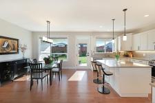 The open-concept main level features 11-foot ceilings, expansive windows, a gas fireplace, and sliding doors to a covered deck for seamless indoor-outdoor living. The kitchen boasts quartz countertops, tile backsplash, SS appliances, walk-in pantry, and a large island. Dining opens to a southwest-facing backyard with gas hookups, covered patio, and full irrigation. The primary suite includes a walk-in closet and heated-floor ensuite with dual vanities and walk-in shower. Two bedrooms complemented by a 4-piece bath round out the upper level. Downstairs offers a flex room, fourth bedroom or office, laundry with separate side entry, and 180 sq ft unfinished space awaiting your creativity