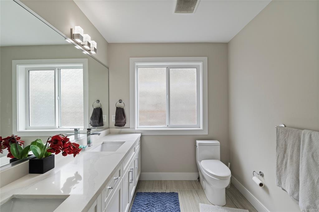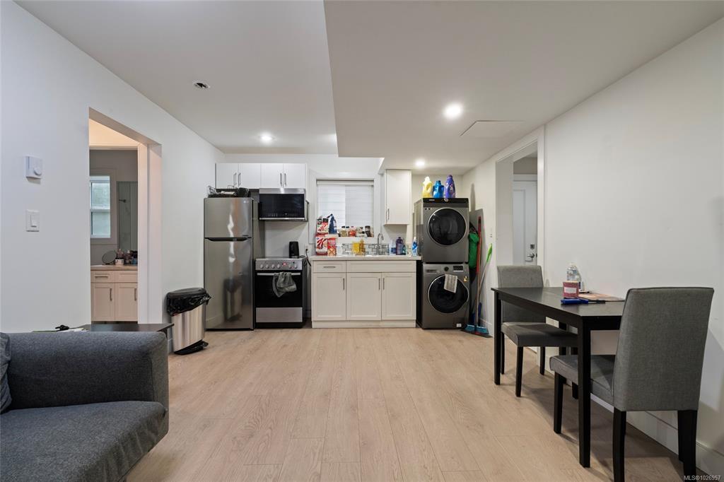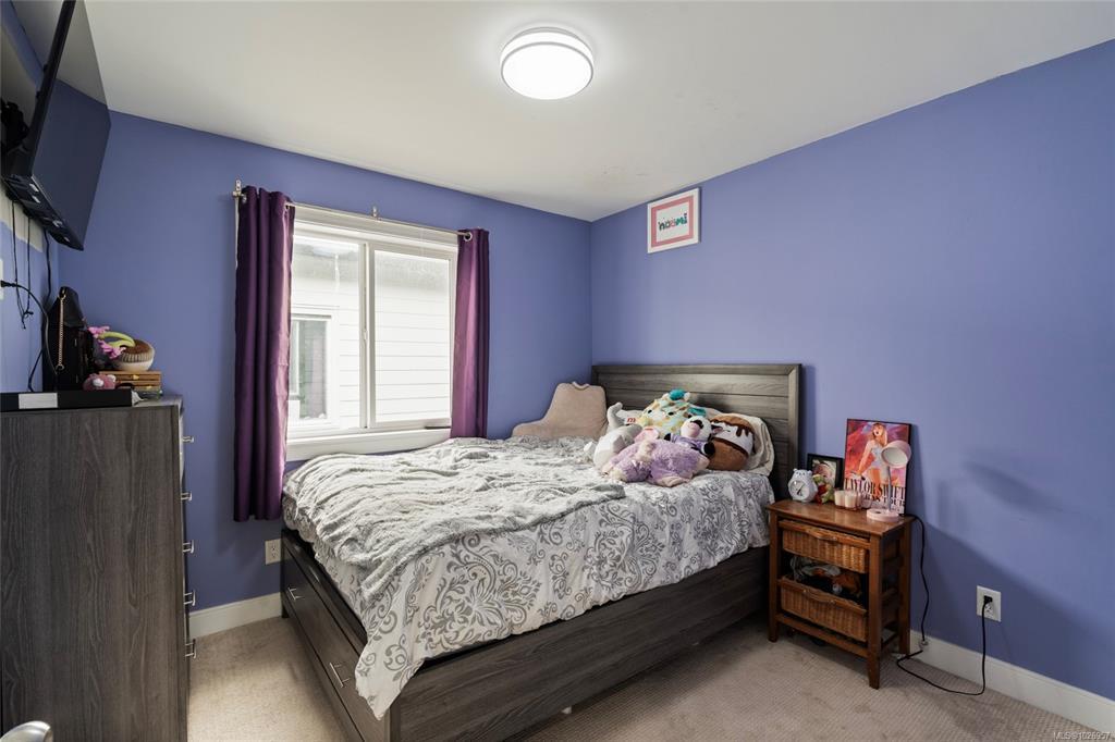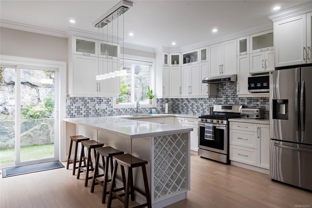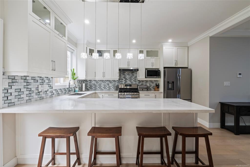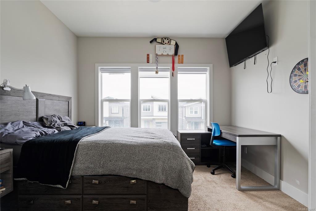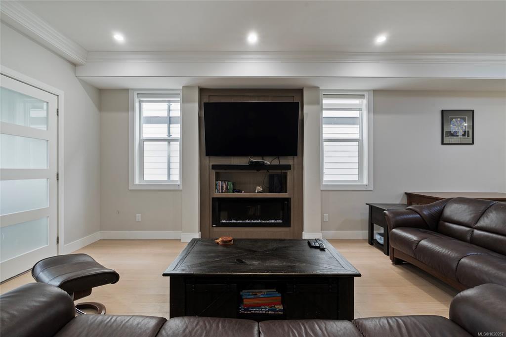 Open House Saturday & Sunday 1-2:30. Modern and thoughtfully designed, this quality-built 4 bed, 4 bath home offers over 2,400 sq ft of versatile living space in a desirable Westshore neighbourhood. The open-concept main level features beautiful flooring throughout and a contemporary fireplace adding warmth to the bright living room. The well-appointed kitchen includes quartz countertops, ample cabinetry, peninsula seating, stainless steel appliances, and modern lighting, with sliding doors leading to the outdoor space. A bright den and 2-piece powder room complete the main floor. Upstairs offers a spacious primary suite with walk-in closet and ensuite with double vanities and tiled shower, plus two additional bedrooms, full bath, and upper laundry. The lower level includes a self-contained 1 bed suite with private entry and separate laundry. Energy-efficient heat pump, single-car garage, and backing onto green space close to schools, parks, shopping, and all Westshore amenities.