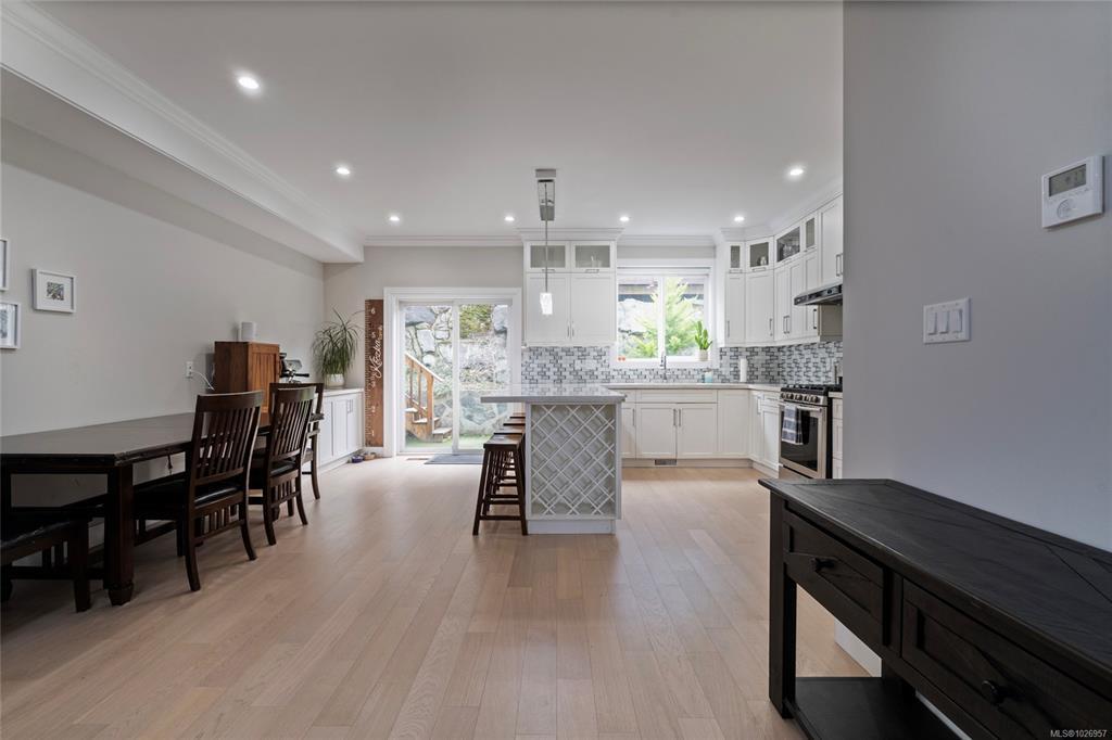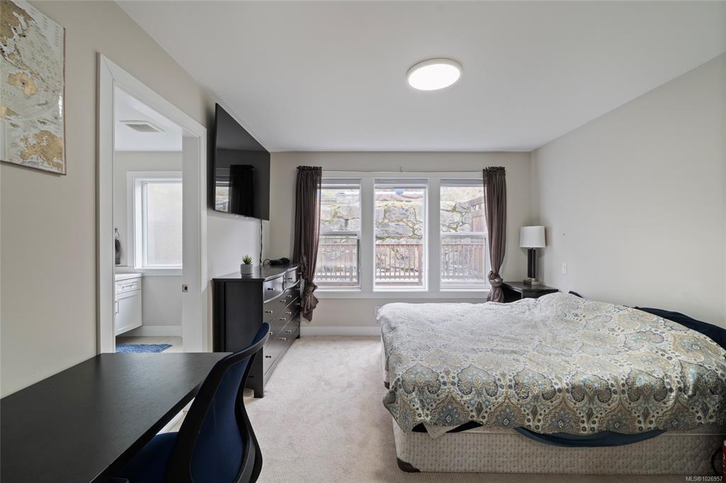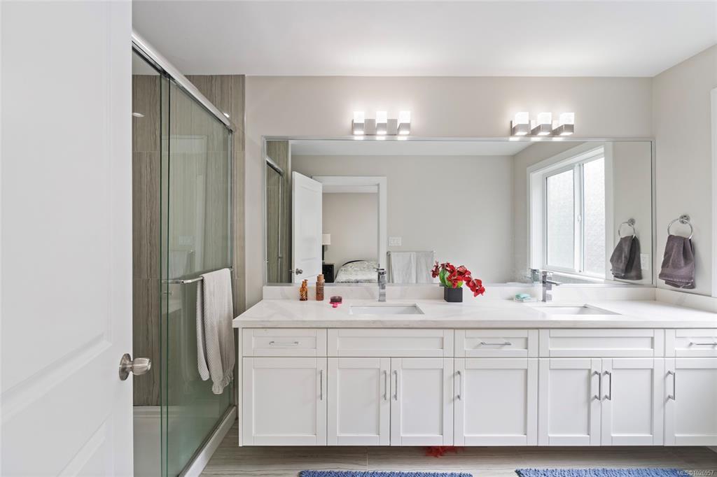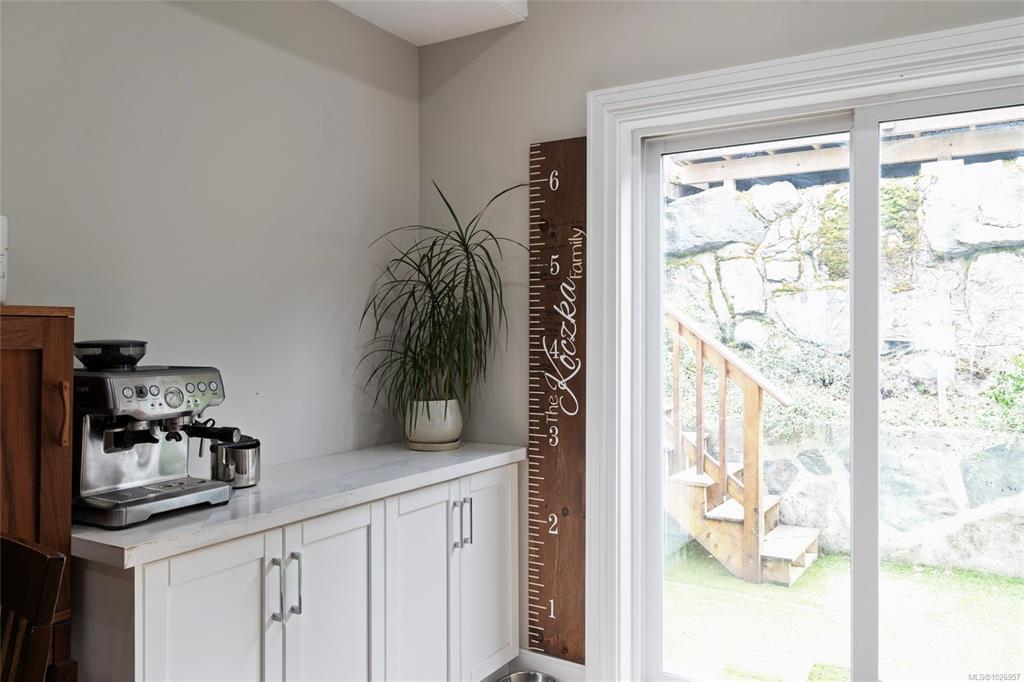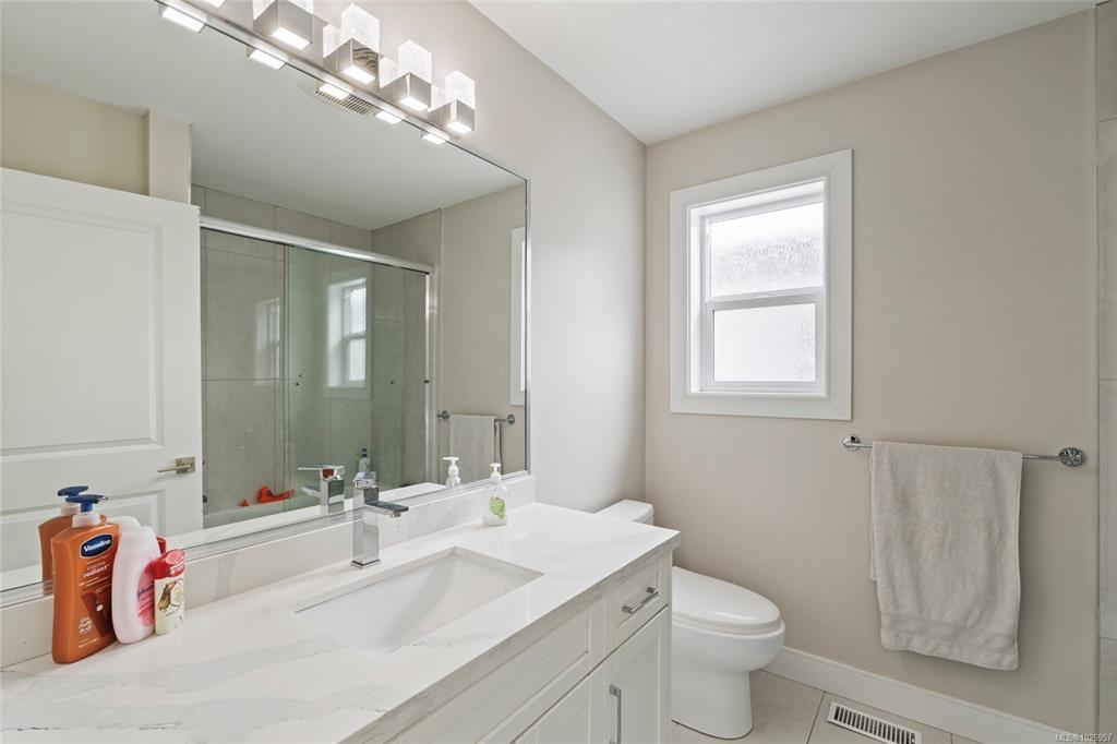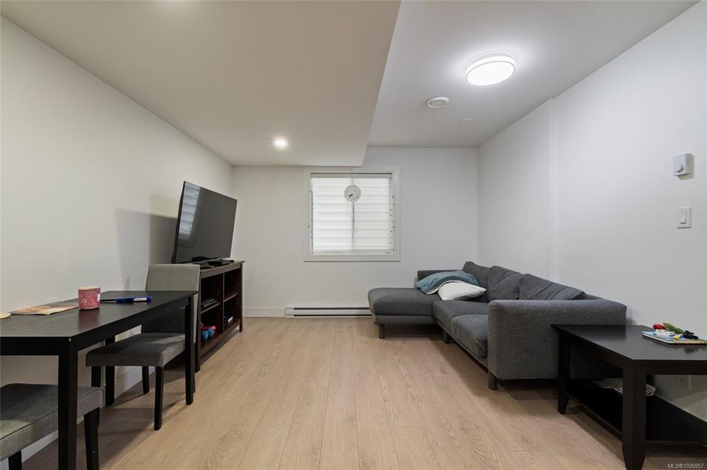 Open House Saturday & Sunday 1-2:30. Modern and thoughtfully designed, this quality-built 4 bed, 4 bath home offers over 2,400 sq ft of versatile living space in a desirable Westshore neighbourhood. The open-concept main level features beautiful flooring throughout and a contemporary fireplace adding warmth to the bright living room. The well-appointed kitchen includes quartz countertops, ample cabinetry, peninsula seating, stainless steel appliances, and modern lighting, with sliding doors leading to the outdoor space. A bright den and 2-piece powder room complete the main floor. Upstairs offers a spacious primary suite with walk-in closet and ensuite with double vanities and tiled shower, plus two additional bedrooms, full bath, and upper laundry. The lower level includes a self-contained 1 bed suite with private entry and separate laundry. Energy-efficient heat pump, single-car garage, and backing onto green space close to schools, parks, shopping, and all Westshore amenities.