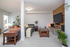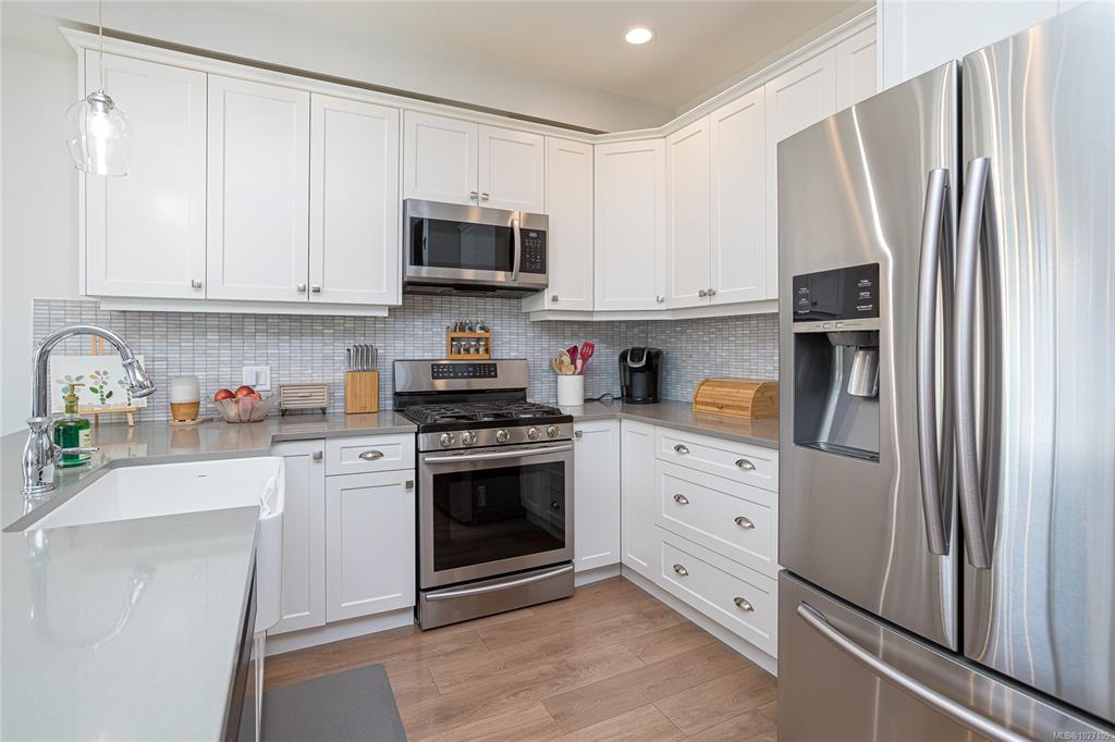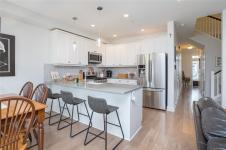 Welome to Hawthorne Townhomes on Katie’s Pond. This beautifully designed 3-level home offers over 2,000 sq ft with 3 bed, 3 bath, + flex space, & a huge family room — ideal for flexible living. Tucked away on a quiet cul-de-sac with no thru traffic, it blends privacy with style. The main floor showcases a gourmet kitchen with quartz countertops, high-gloss cabinetry, upgraded stainless steel appliances & 9' ceilings, flowing seamlessly into open dining & living spaces with access to the rear south facing deck with views to Katie’s Pond. Upstairs features 3 bedrooms inc a spacious Primary retreat with walk-in closet and ensuite, 2 good size bedrooms, one with vaulted ceilings, main bath, & laundry room. The walk-out lower level includes a family room and bonus/den/storage space or possibly 4th bed — perfect for guests or... — plus access to a fenced backyard backing onto Katie’s Pond and scenic trails. Single garage + driveway parking for two. Shows like new! Come see for yourself.
