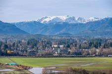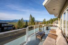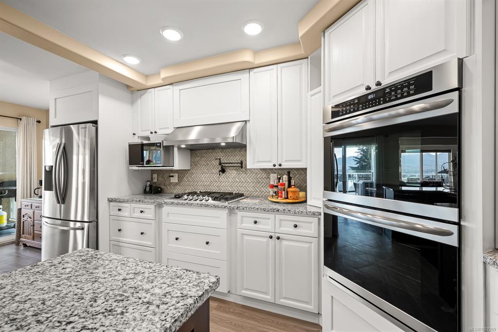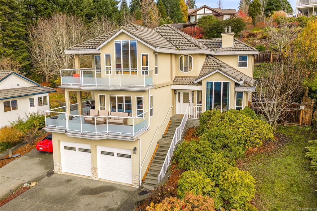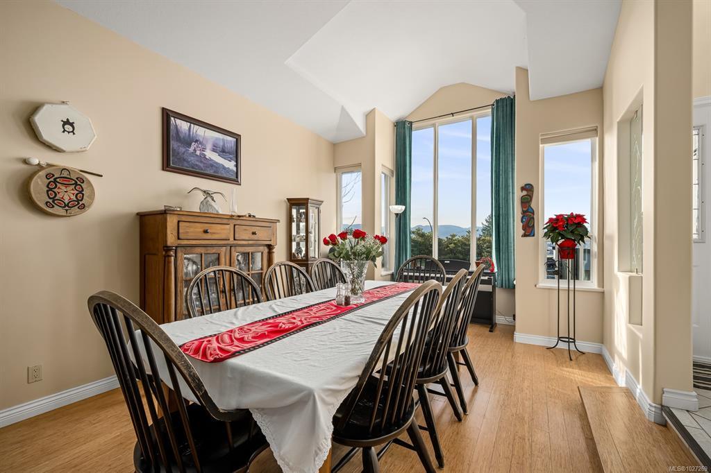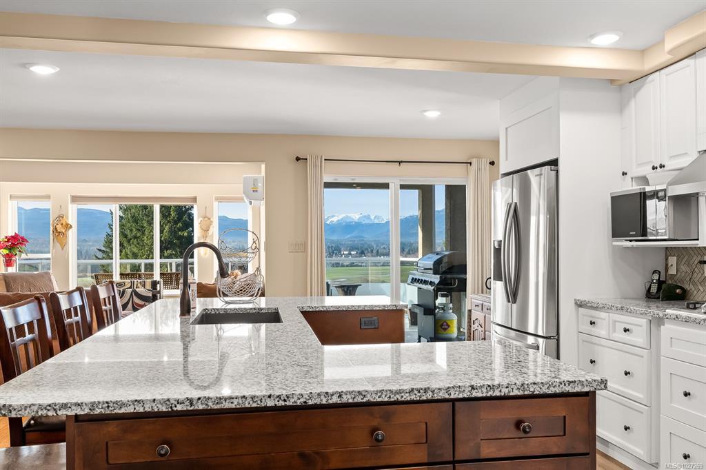 $100,000+ below assessed value! 3,766 sq ft three level multi generational living with suite potential and views of the Comox Glacier, Mount Washington, Coastal mountains, lush farmland and city lights! Designed to capture the scenery, the home features extensive windows that fill the interior with natural light. The main living rooms boasts 12ft cathedral ceilings and a gas fireplace, currently styled as an elegant dining area. The updated kitchen includes a large island, stainless appliances with gas stove & eating nook, adjacent family room which opens to a front facing balcony plus a covered 10x8 deck for year round enjoyment and barbeques. Two additional rooms could be bedrooms or offices. Upstairs, a winding staircase leads to 3 bedrooms. The large primary suite has 11ft cathedral ceilings, full height windows, a private balcony + covered deck, 5 piece ensuite with soaker tub and walk in closet. Downstairs has full kitchen, 3 piece bath and no stair private entrance.