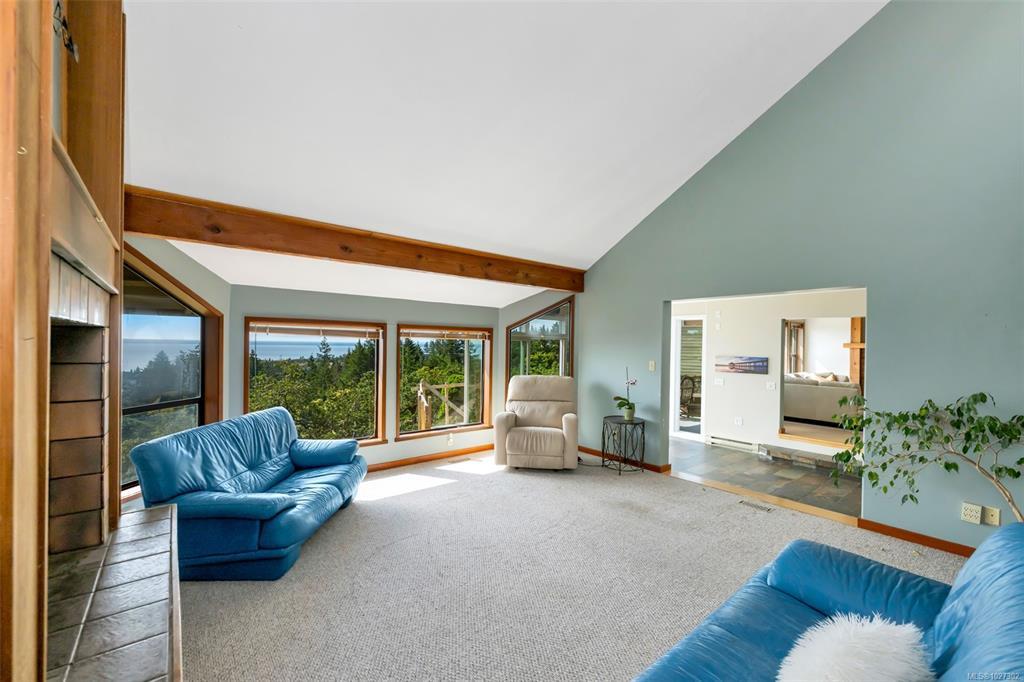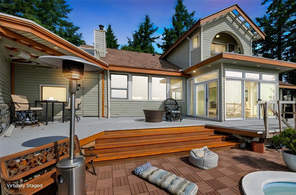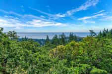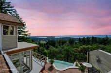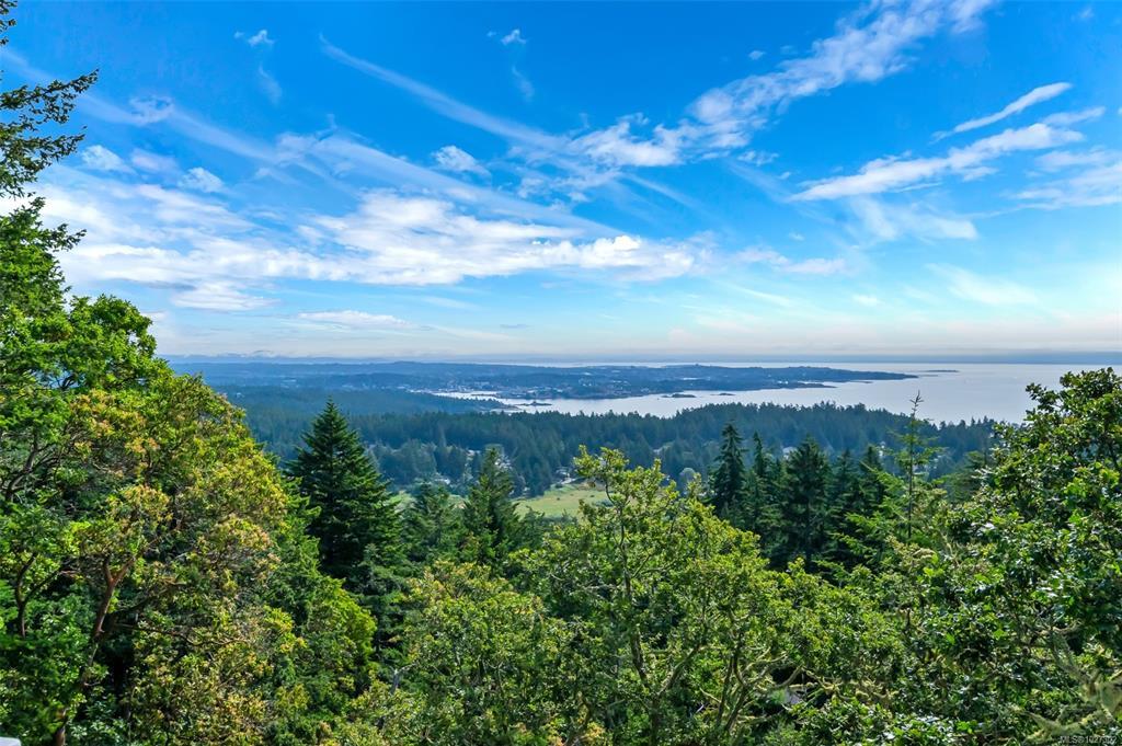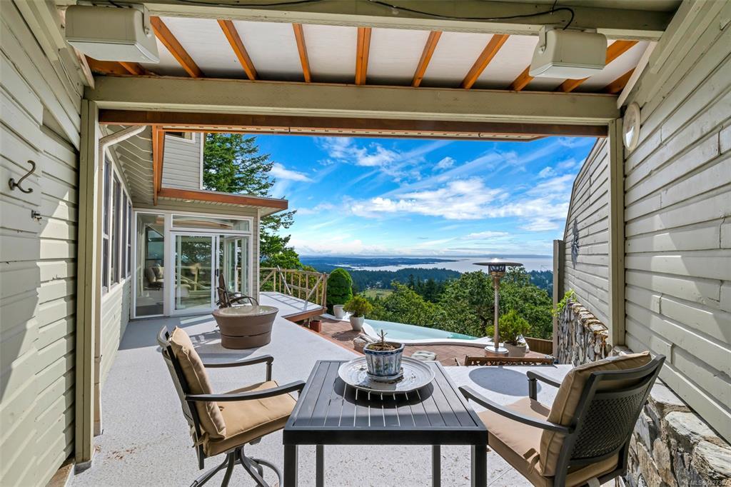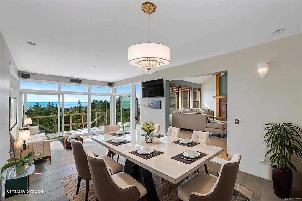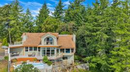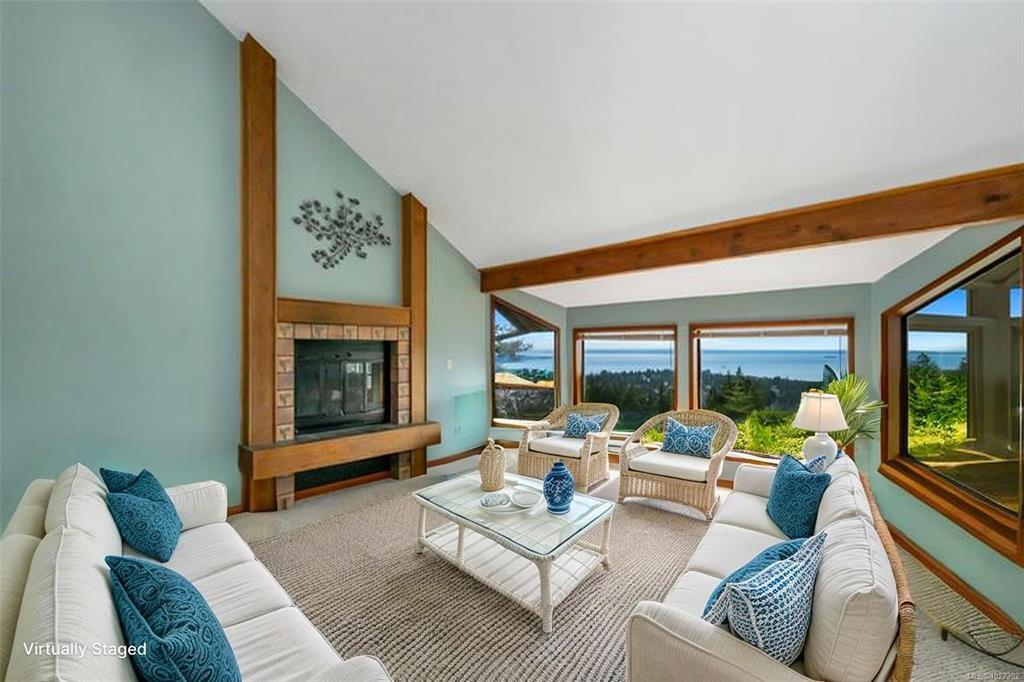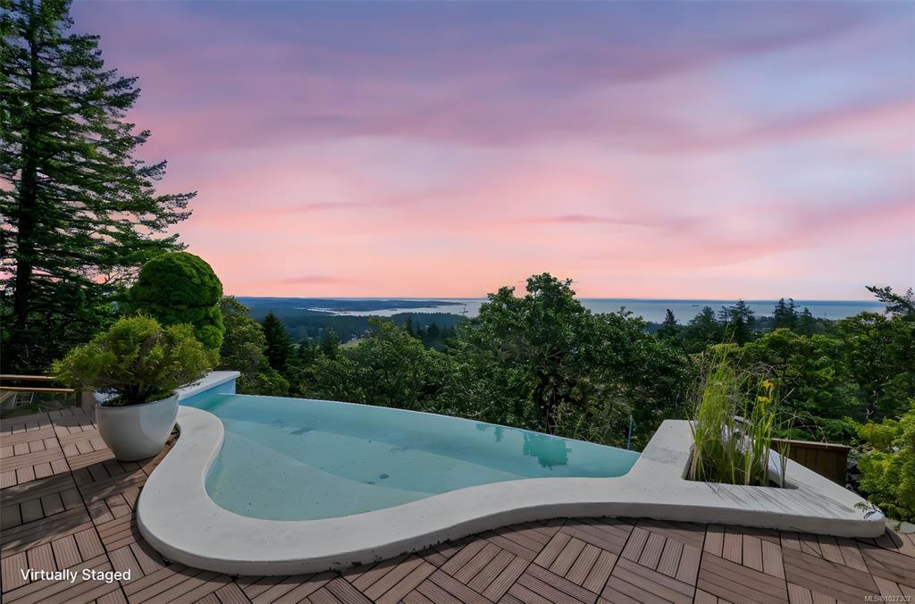 Perched atop prestigious Triangle Mountain, where sky meets sea, this extraordinary West Coast residence rests on a private 0.94-acre property offering sweeping panoramic views. From the Olympic Mountains across the Salish Sea to the sparkling skyline of downtown Victoria, the outlook is truly breathtaking. Designed to capture natural light and the ever-changing coastal scenery, the main level features a dramatic dining area framed by floor-to-ceiling windows and elegant slate tile flooring. An upper gallery overlooks the bright living spaces below, while a central skylight fills the home with warmth. Multiple wood-burning fireplaces add charm and character throughout. Upstairs, the primary suite offers a walk-in closet, ensuite, enclosed sunroom, and private deck with stunning night views. Terraced gardens, patios, a water feature, and a private plunge pool complete this rare opportunity to restore and personalize a view property of exceptional caliber.