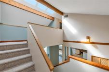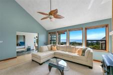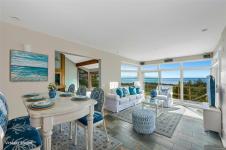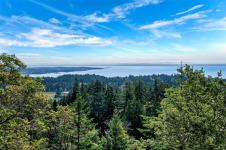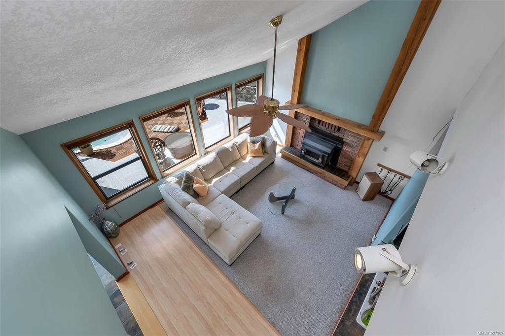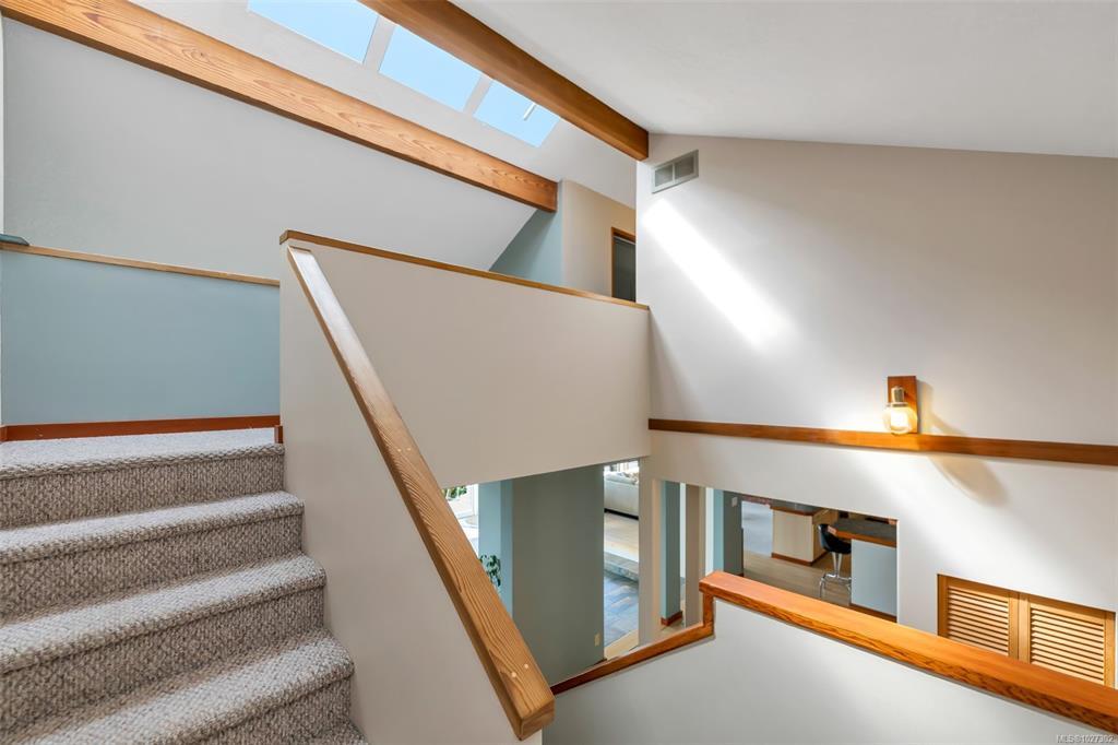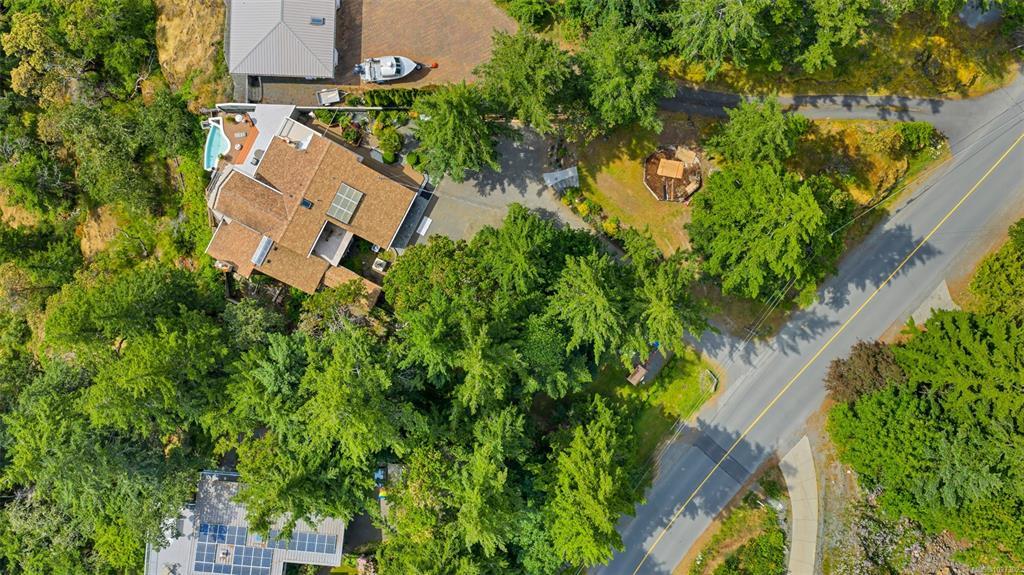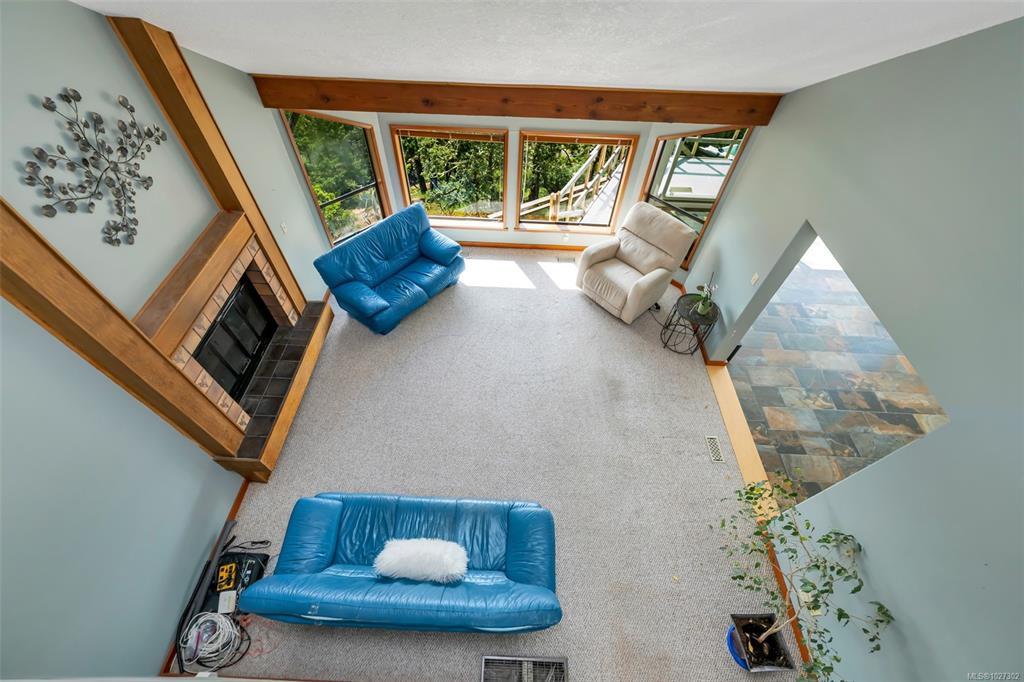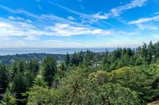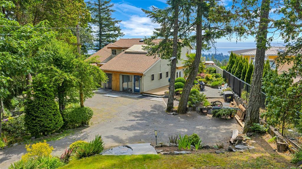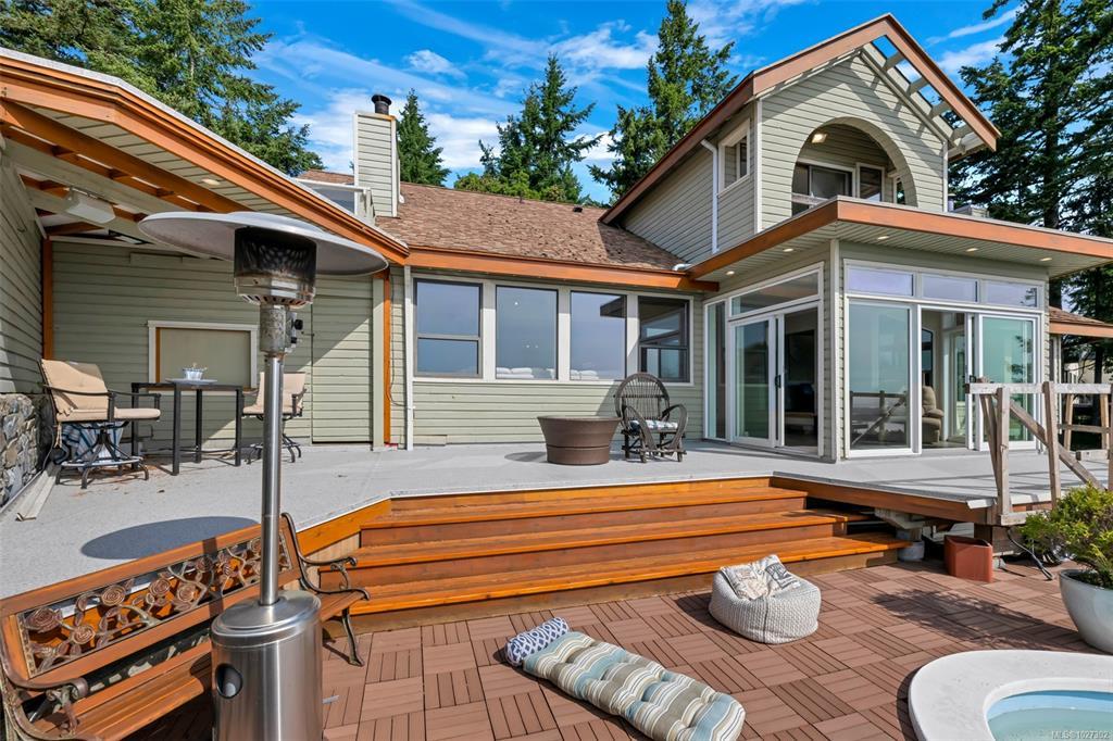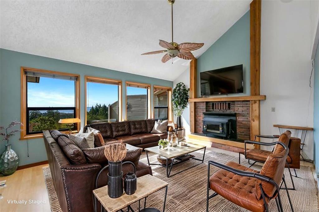 Perched atop prestigious Triangle Mountain, where sky meets sea, this extraordinary West Coast residence rests on a private 0.94-acre property offering sweeping panoramic views. From the Olympic Mountains across the Salish Sea to the sparkling skyline of downtown Victoria, the outlook is truly breathtaking. Designed to capture natural light and the ever-changing coastal scenery, the main level features a dramatic dining area framed by floor-to-ceiling windows and elegant slate tile flooring. An upper gallery overlooks the bright living spaces below, while a central skylight fills the home with warmth. Multiple wood-burning fireplaces add charm and character throughout. Upstairs, the primary suite offers a walk-in closet, ensuite, enclosed sunroom, and private deck with stunning night views. Terraced gardens, patios, a water feature, and a private plunge pool complete this rare opportunity to restore and personalize a view property of exceptional caliber.