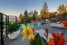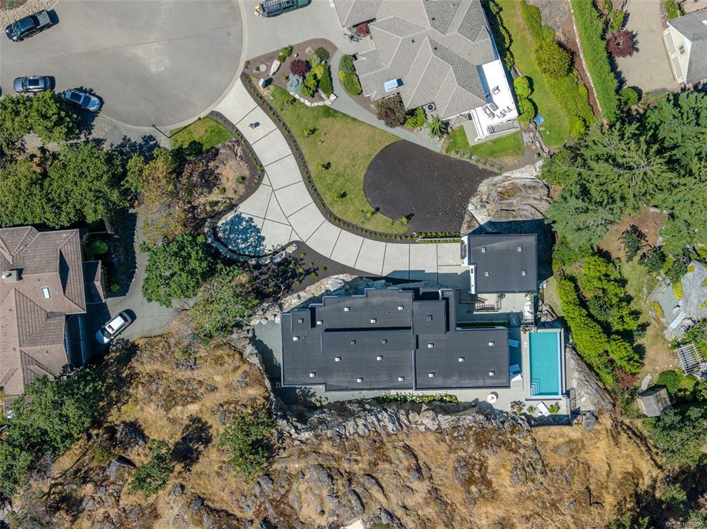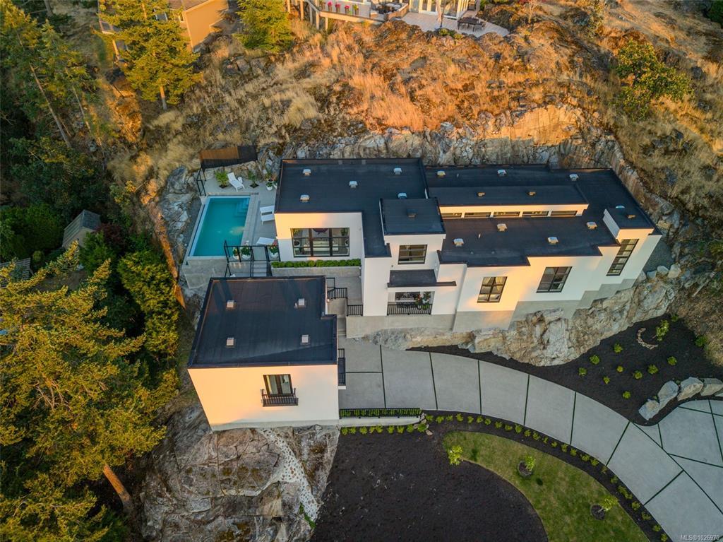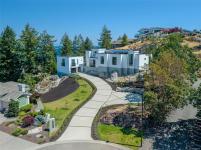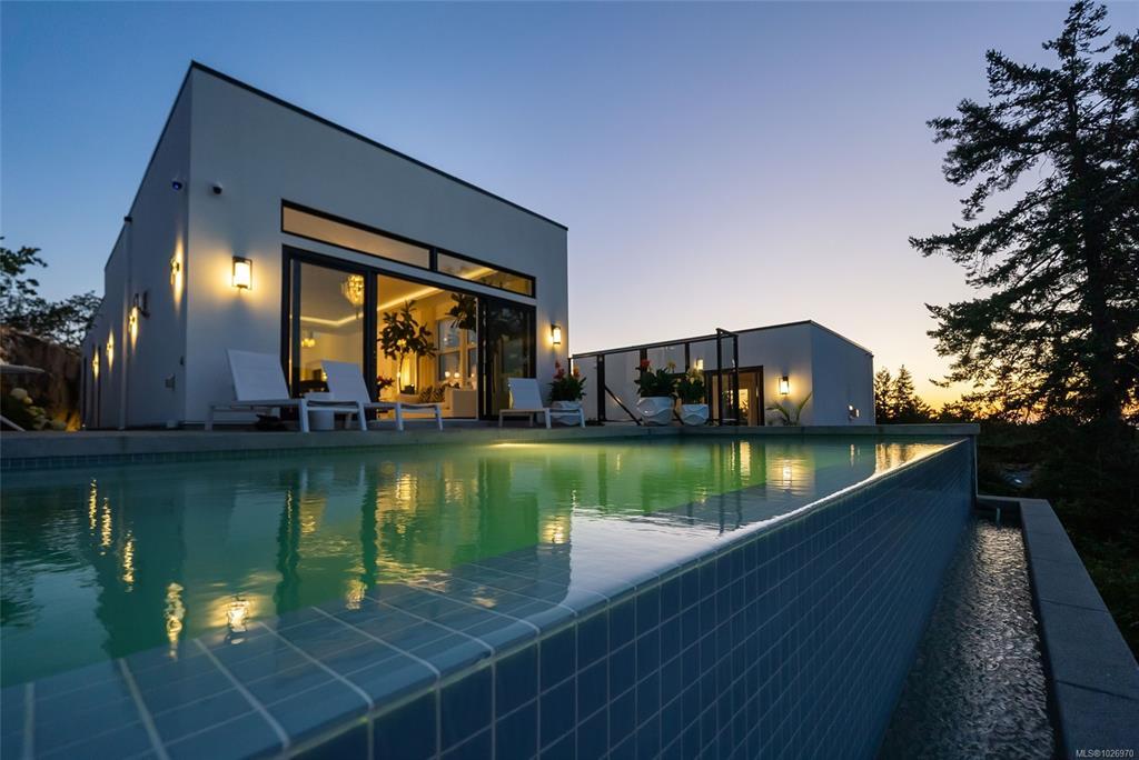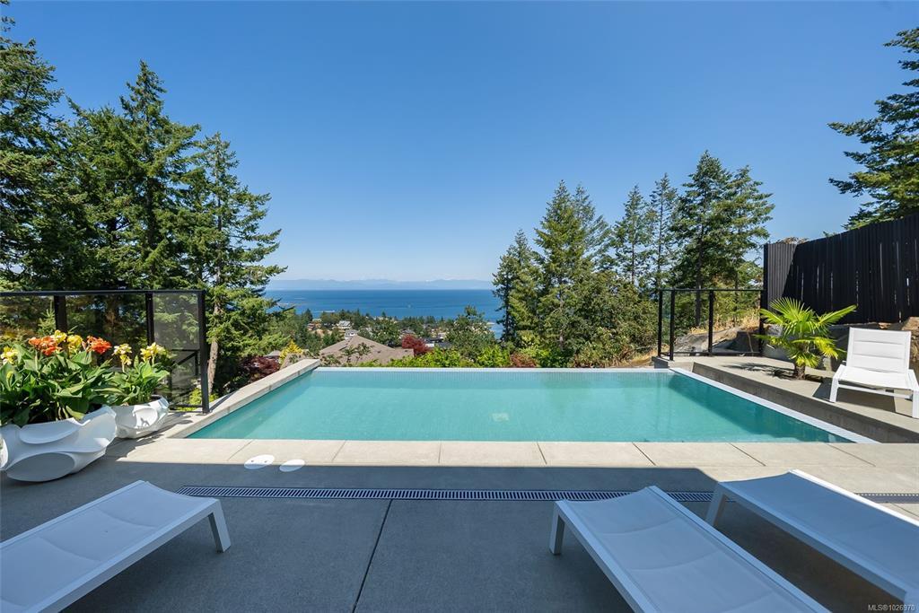 Exquisite Fairwinds Villa with captivating Ocean Views. Once in a lifetime opportunity to own a glorious custom home with elegant designer details in every room. The great room will captivate your imagination, flooded with natural light, soaring ceilings and a dazzling open plan Kitchen (with Butlers pantry), all flowing out onto a generous patio for al fresco dining with an infinity pool framing the magnificent Ocean vistas. Relax in your luxurious Primary Suite with glamorous walk in closet and blissful ensuite. Generous guest accommodations, both in the main house and in the separate studio allow for gathering of family and friends. Art niches and inspiring light fixtures allow you to create artistic scenes throughout your home. This unique architectural home nestled into low maintenance landscaping will allow you to live Your Vancouver Island Dream Today.