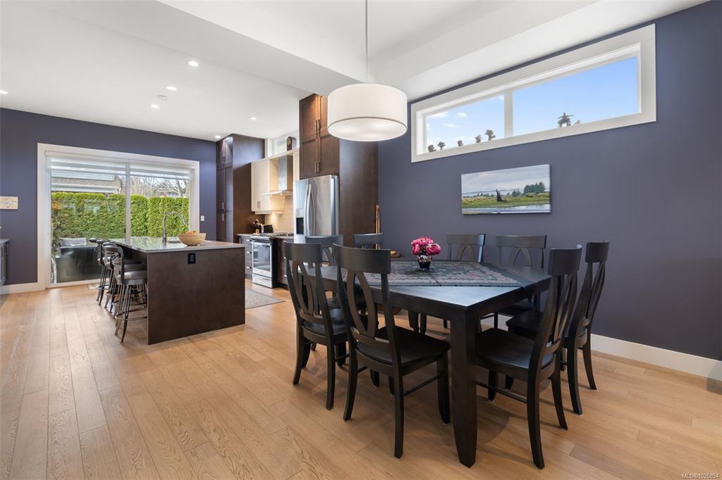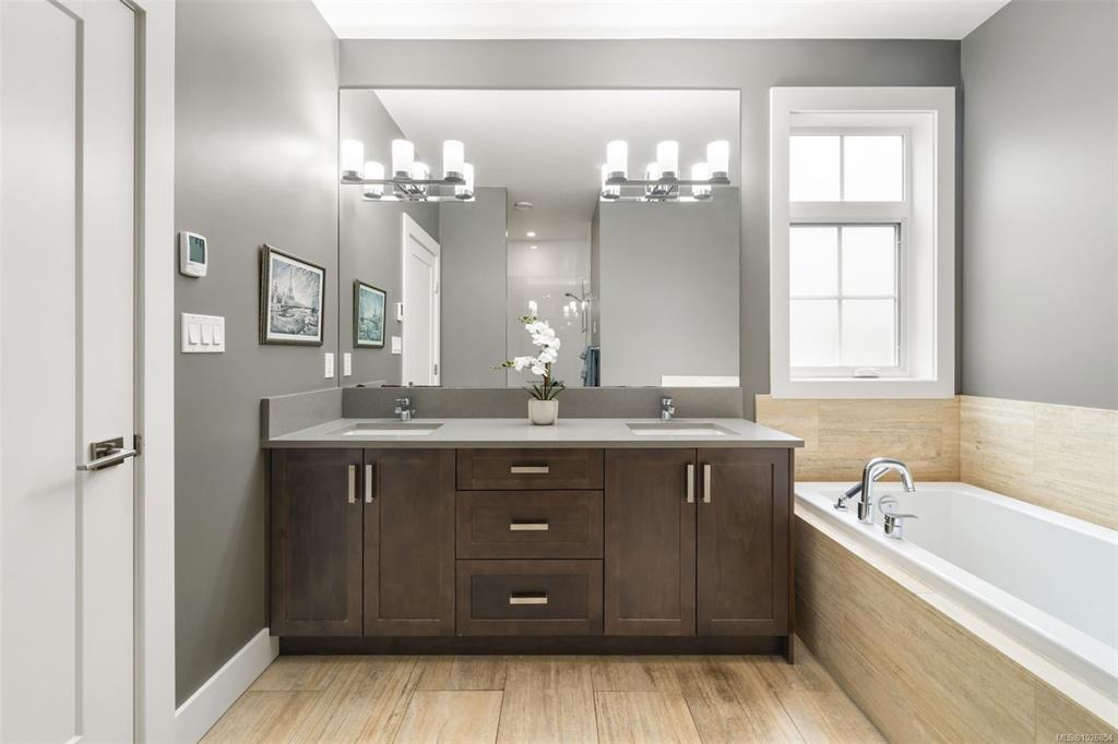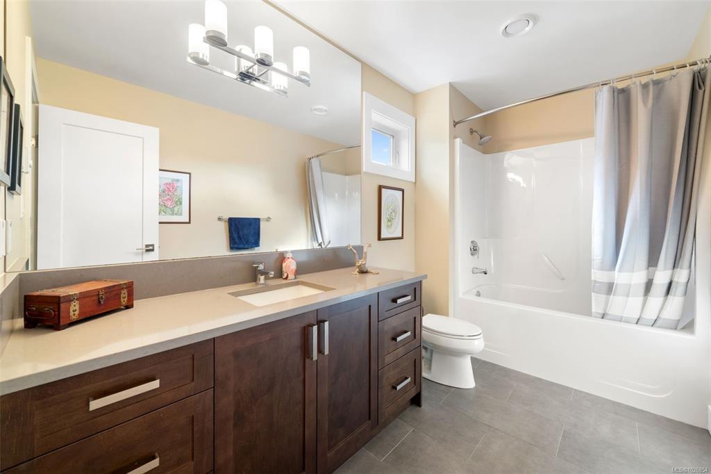 LIKE NEW, PRIMARY ON THE MAIN LEVEL, 2,500 SF, 4 bed / 4 bth home on an easy care lot. Built in 2015, 10 ft ceilings, open-concept layout, engineered hardwood, and a cozy gas FP. Main level features a sleek kitchen with quartz Caesarstone counters, large island, soft-close cabinetry, pantry, and quality Whirlpool/Bosch appliances. Exceptionally private 1-bed suite offers true separation from the main home with soundproofing, own hydro meter, hot water tank, separate Canada Post address. Huge covered patio is perfect for year round outdoor living. Added bonus: Heat pump, hot water on demand, heated crawl & garage, Illusion blinds, fresh paint, irrigation, and 3 storage sheds. Prime, walkable location near schools, parks, transit, and shopping—15 min to airport/ferries, 30 min to DT Victoria—set in a friendly, community-oriented neighbourhood.